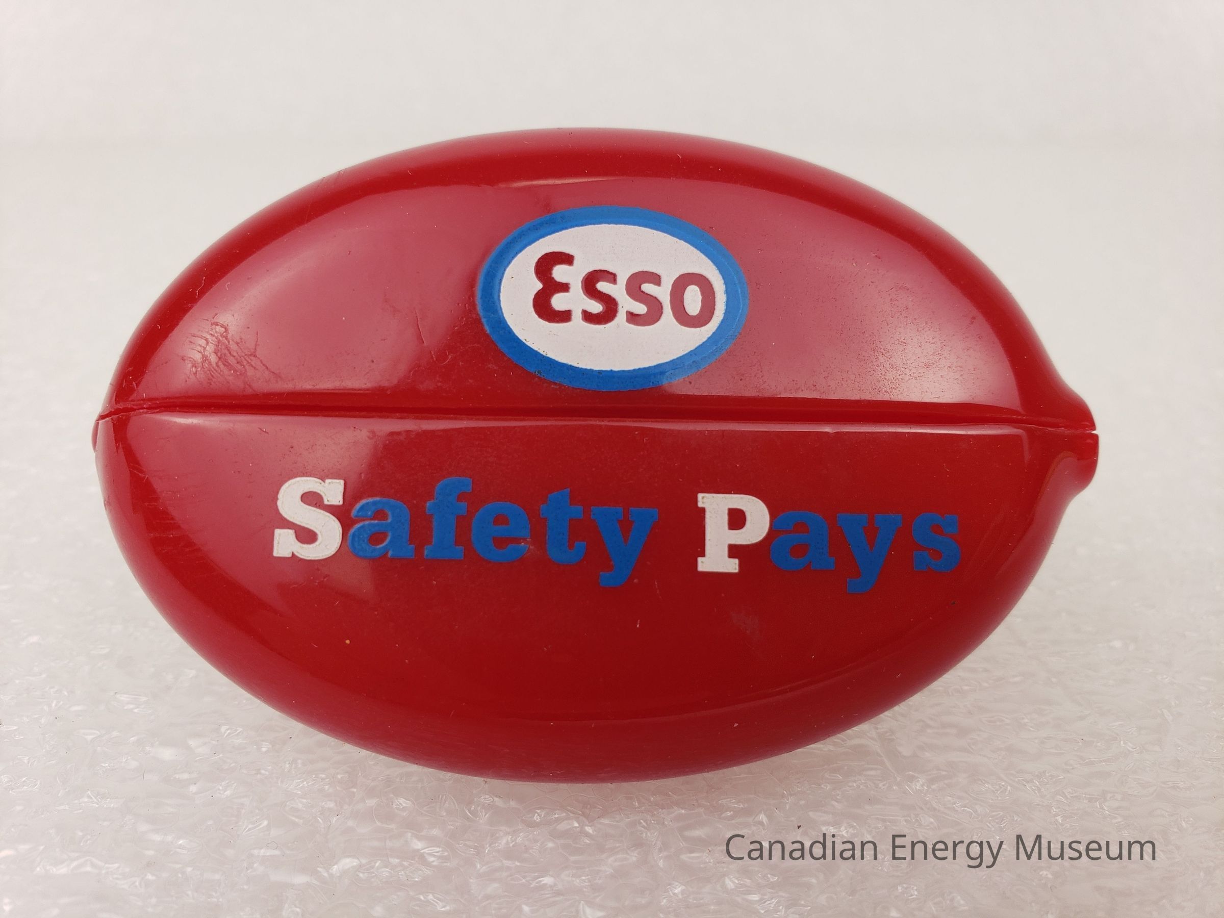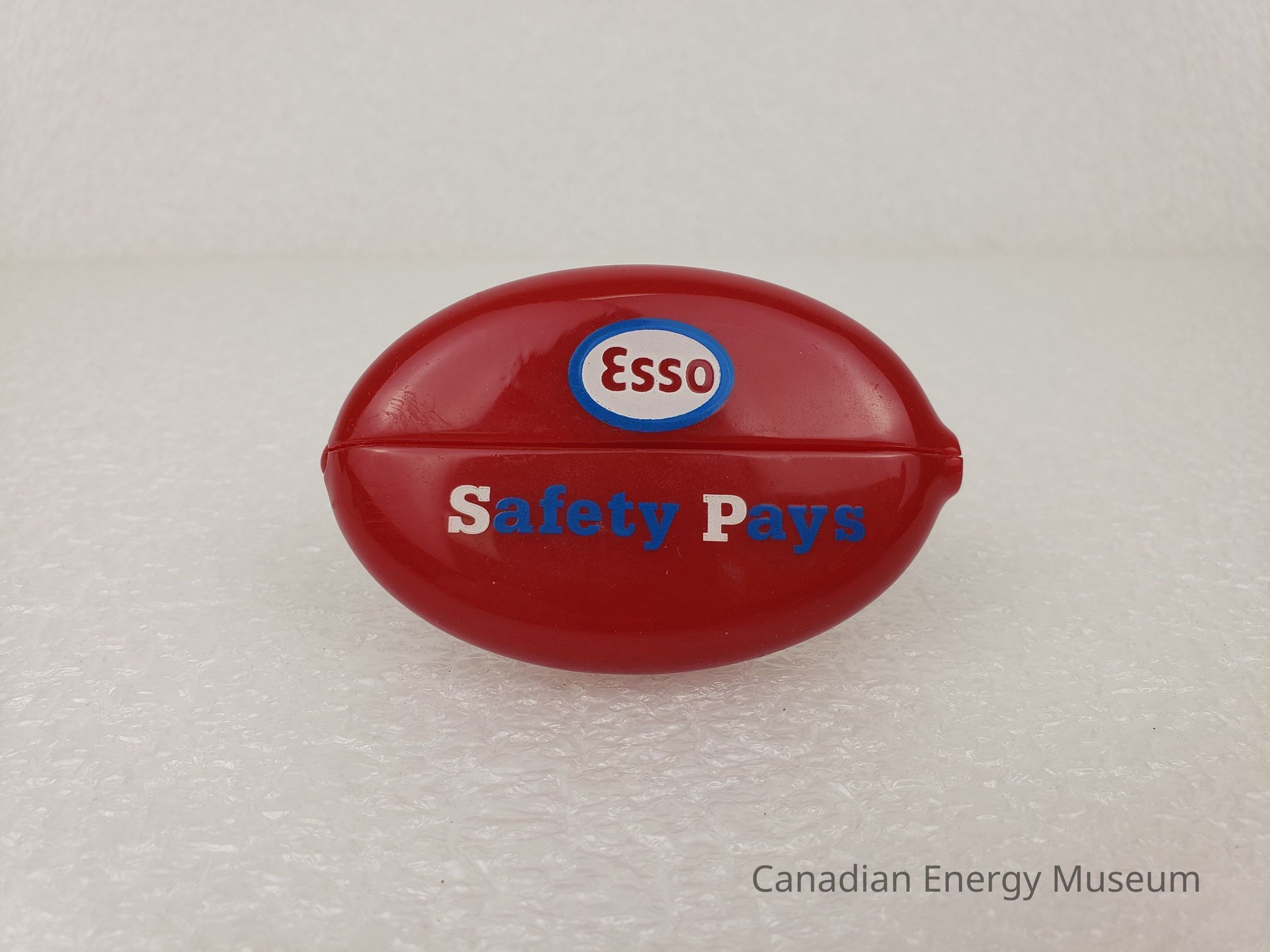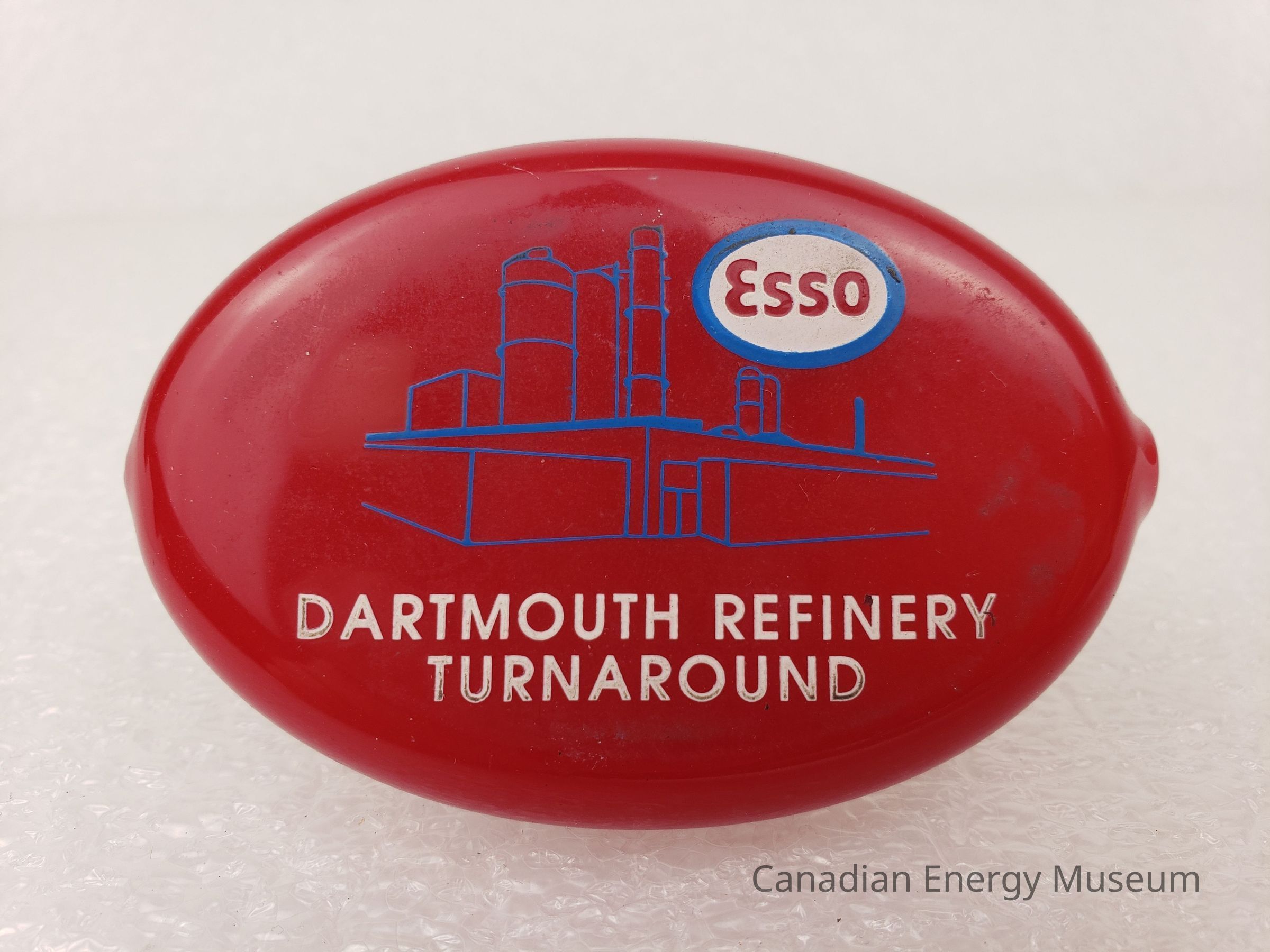 Description: A rounded, oval-shaped small plastic pouch for holding coins. On one side is a horizontally slit, with a round hold to the right-side of the slit. On the slit side is printed in blue and white print "ESSO; Safety Pays". On the reverse side, in blue and white is printed a line illustration of an oil refinery building, with the oval ESSO logo to the top-right, and "DARTMOUTH REFINERY TURNAROUND" at the bottom below the illustration.