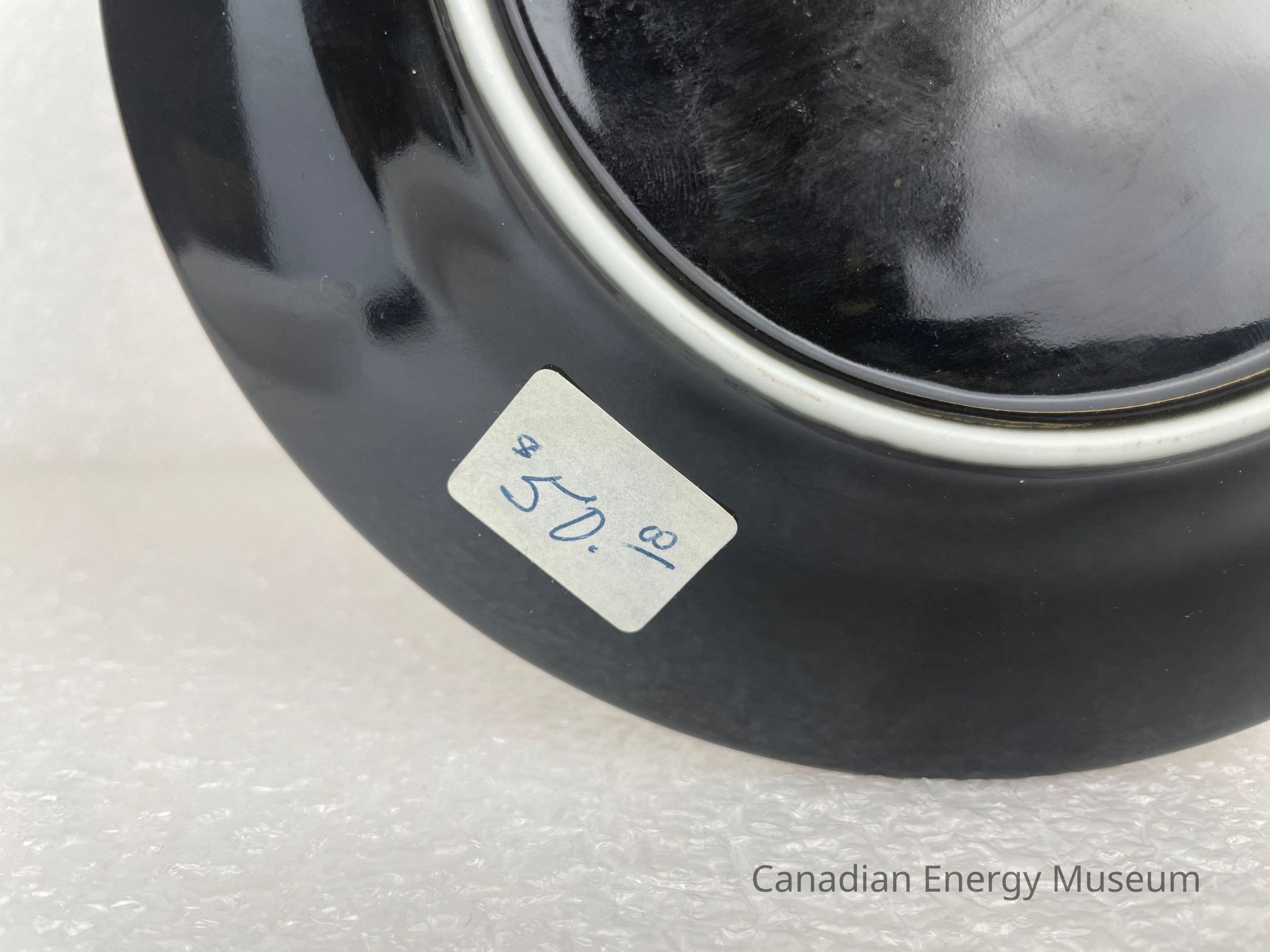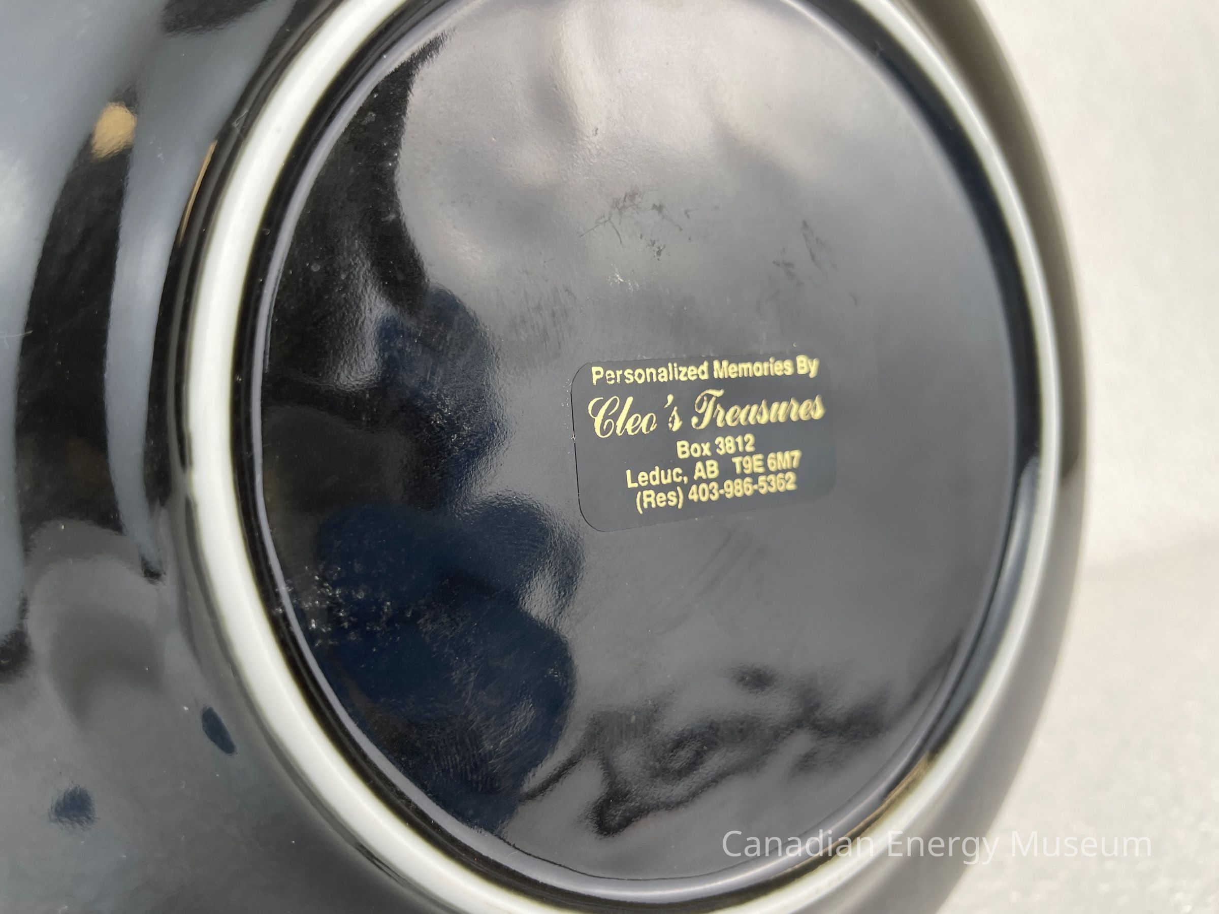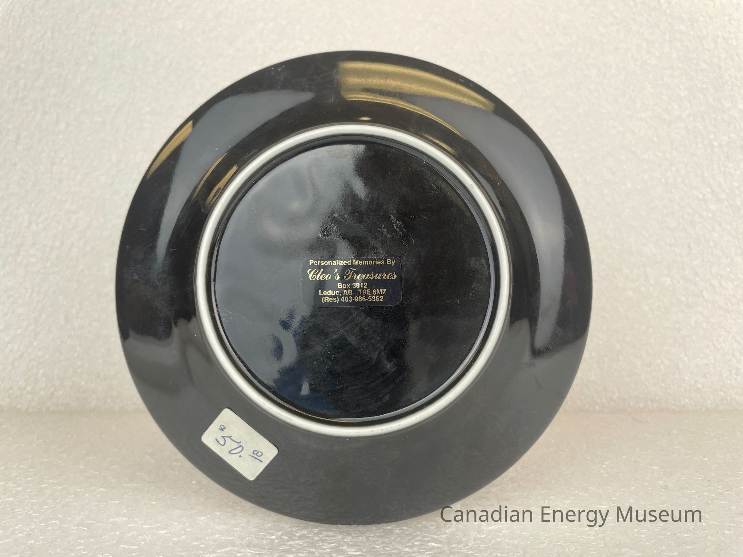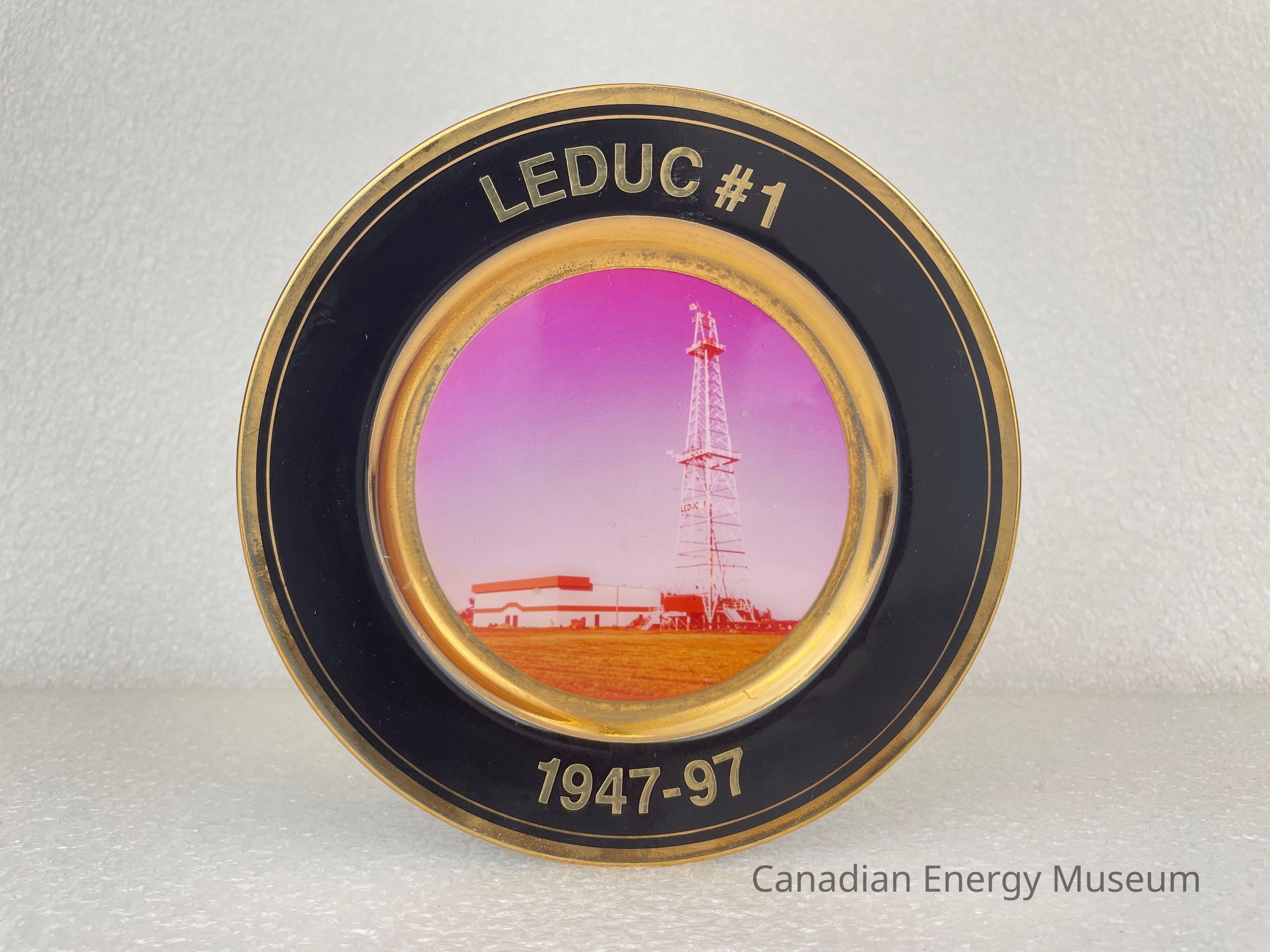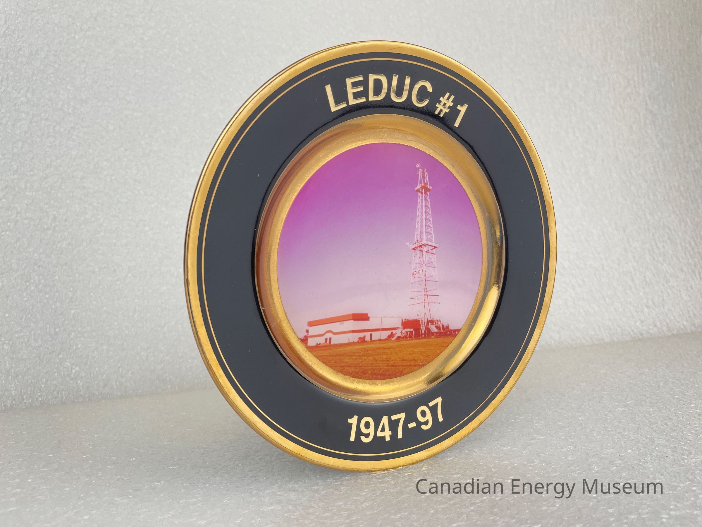 A commemorative plate for the 50th anniversary of Leduc #1. The plate is black ceramic with gold details and a coloured image. The image is circular, covering the base of the plate and displays a picture of the museum with Leduc #1. A thick gold band surrounds the image and displays gold text at the top reading, "LEDUC #1", and gold text at the bottom, "1947-97". Two lines, one thick line on the outside and a thin line placed on the inside, outline the lip of the plate.