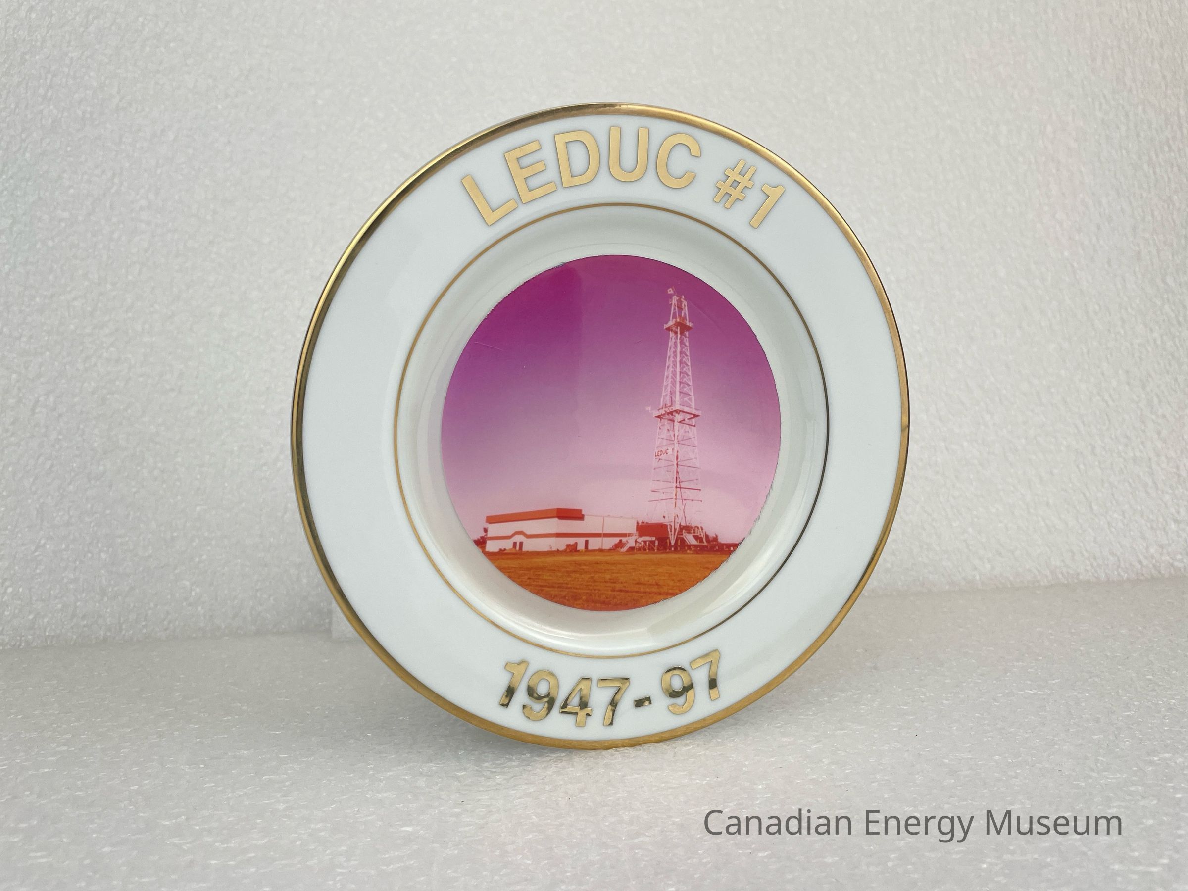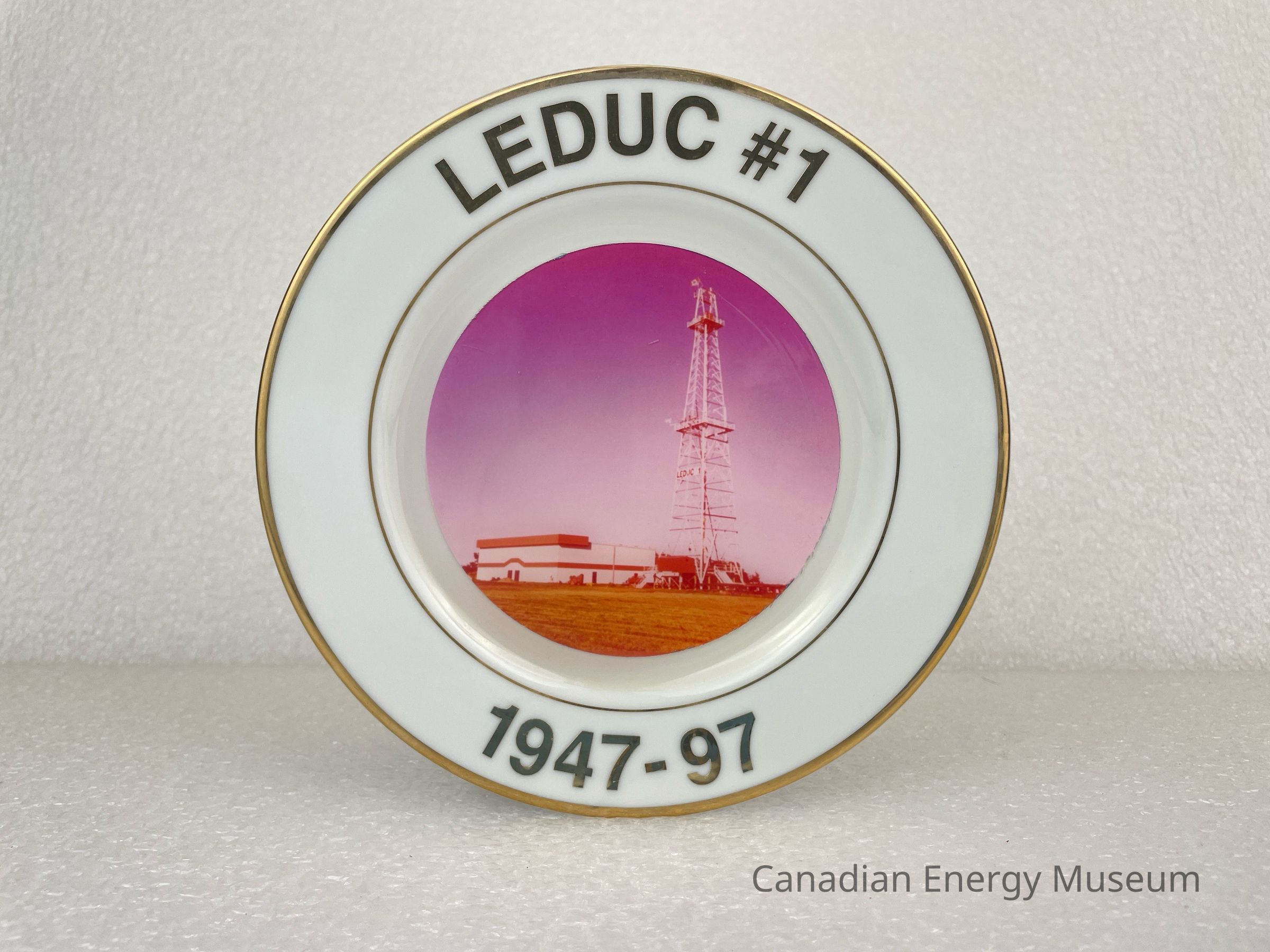 A commemorative plate for the 50th anniversary of Leduc #1. The plate is white ceramic with gold details and a coloured image. The image is circular, covering the base of the plate and displays a picture of the museum with Leduc #1. A thin gold line surrounds the inside rim of the plate and displays gold text at the top reading, "LEDUC #1", and gold text at the bottom, "1947-97". A thicker gold line outlines the lip of the plate.