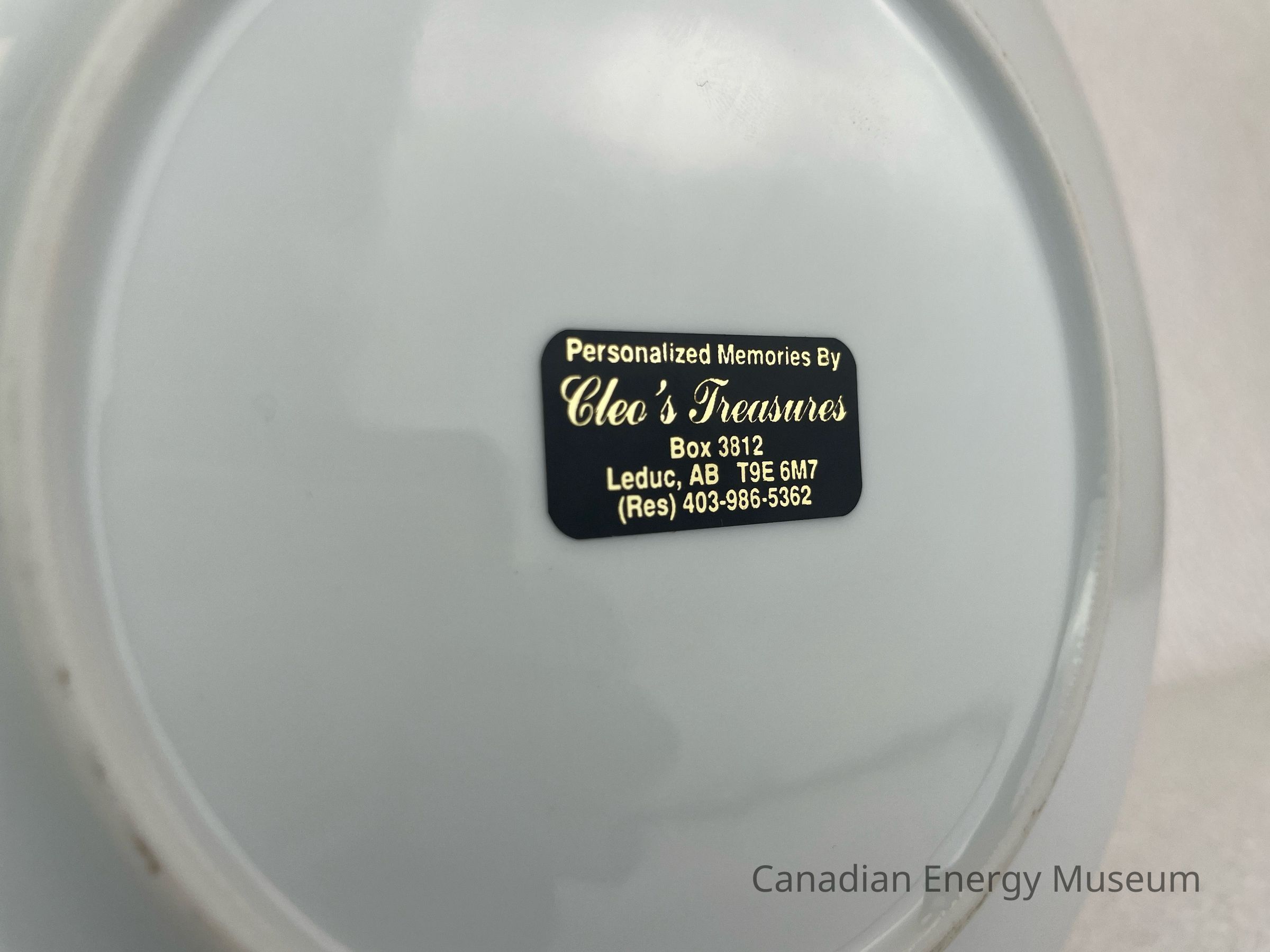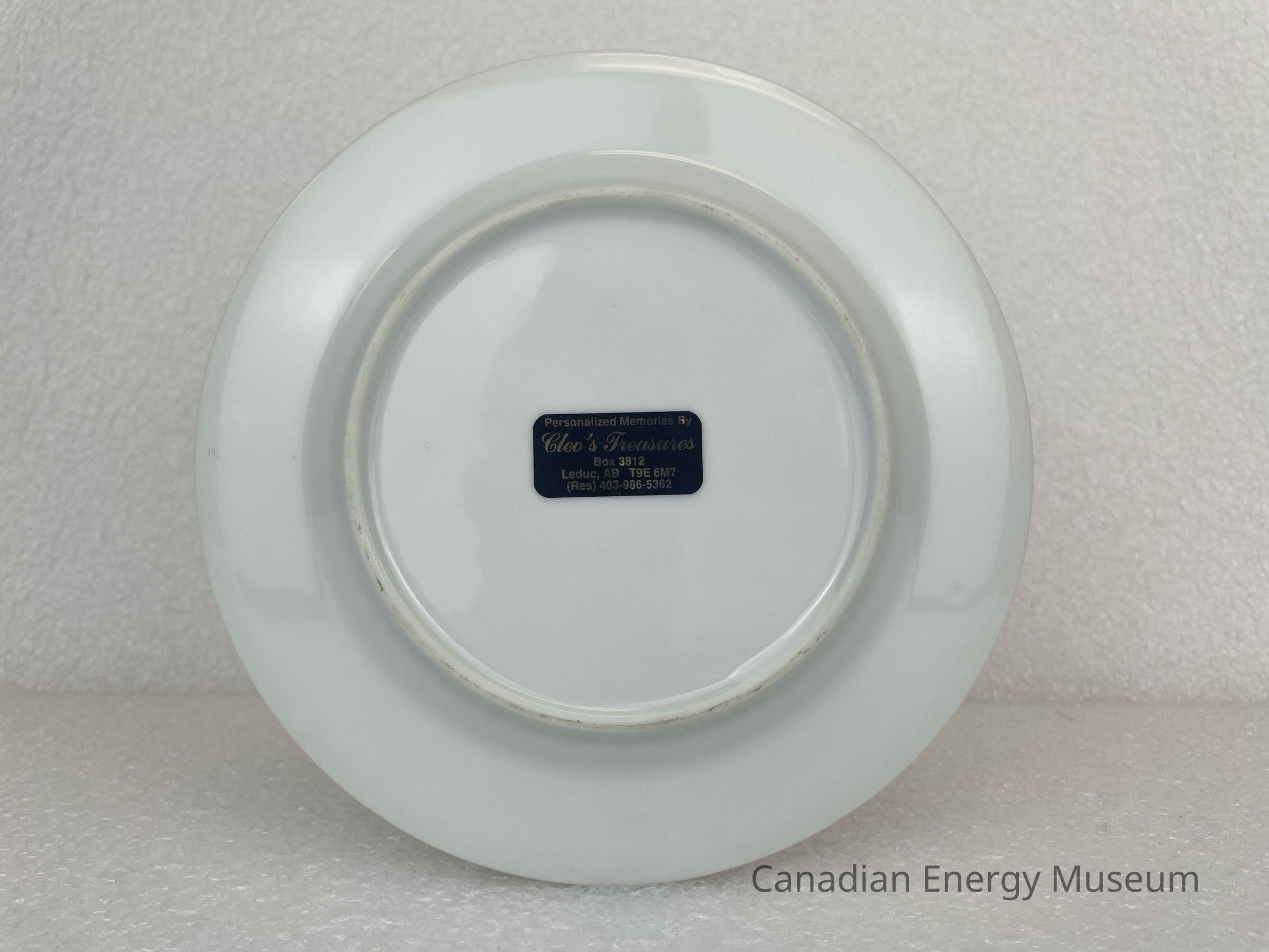 The back of the plate contains a small black sticker. It is a rounded rectangular shape with gold text reading, "Personalized Memories By / Cleo's Treasures / Box 3812 / Leduc, AB T9E 6M7 / (Res) 403-986-5362".Collection