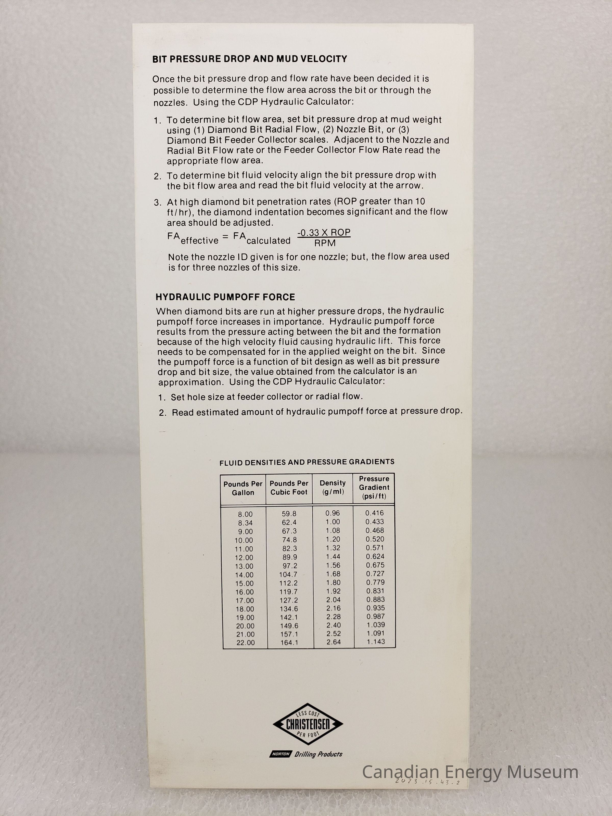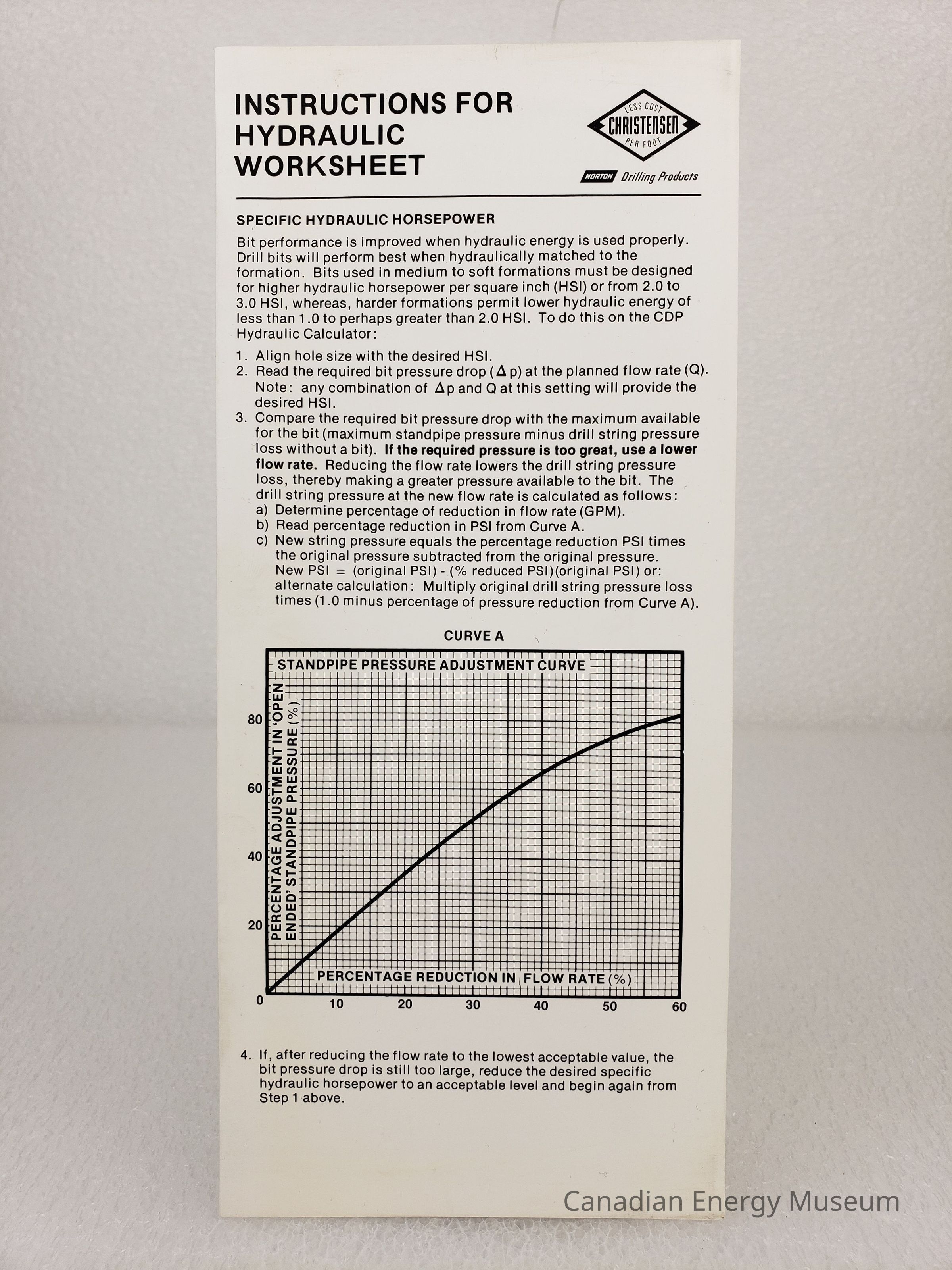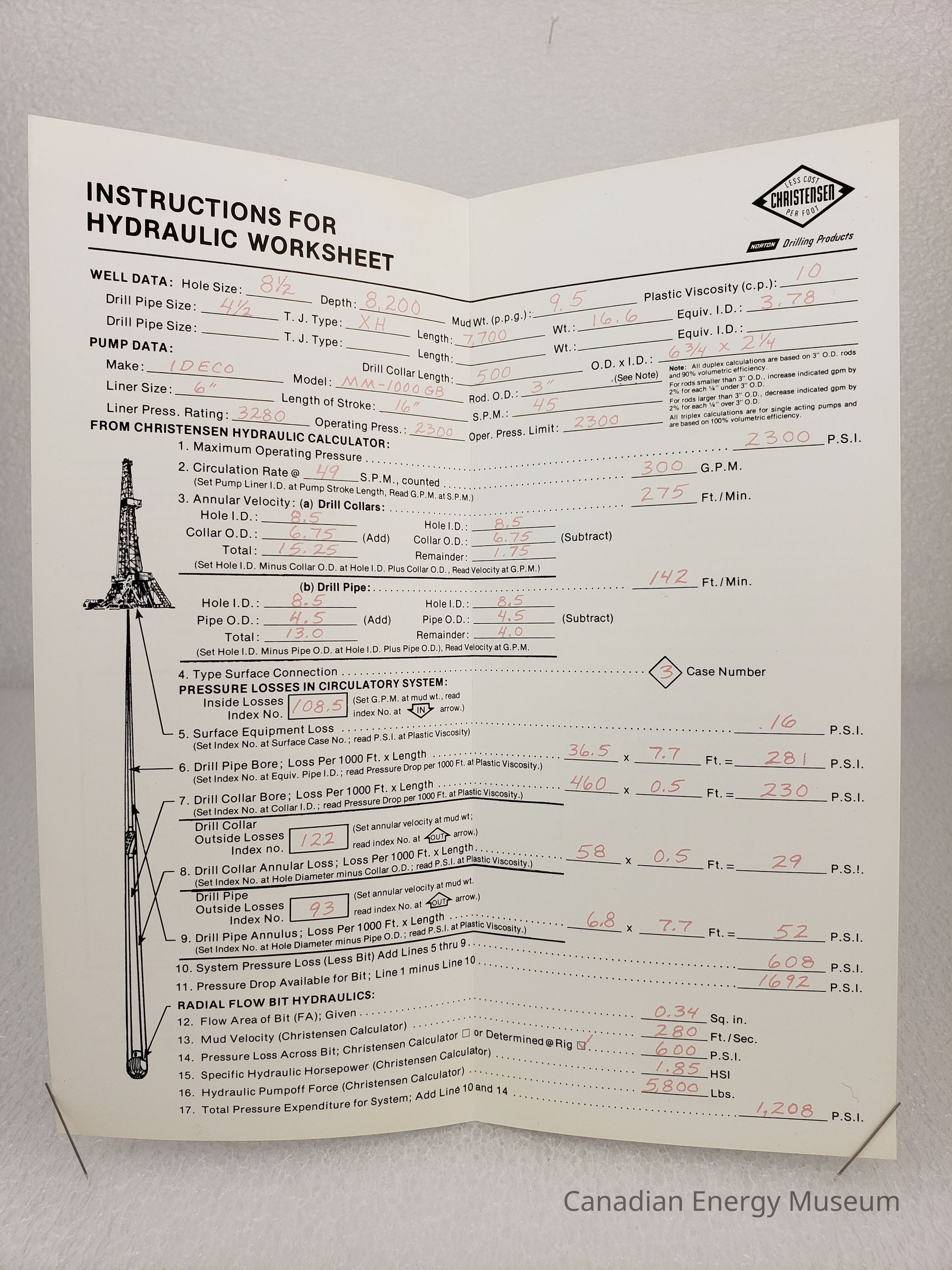 Pamphlet: A tall, narrow bi-fold pamphlet, titled "INSTRUCTIONS FOR HYDRAULIC WORKSHEETS", branded to Christensen. Interior pages contain a sample filled worksheet with black and red print.Collection