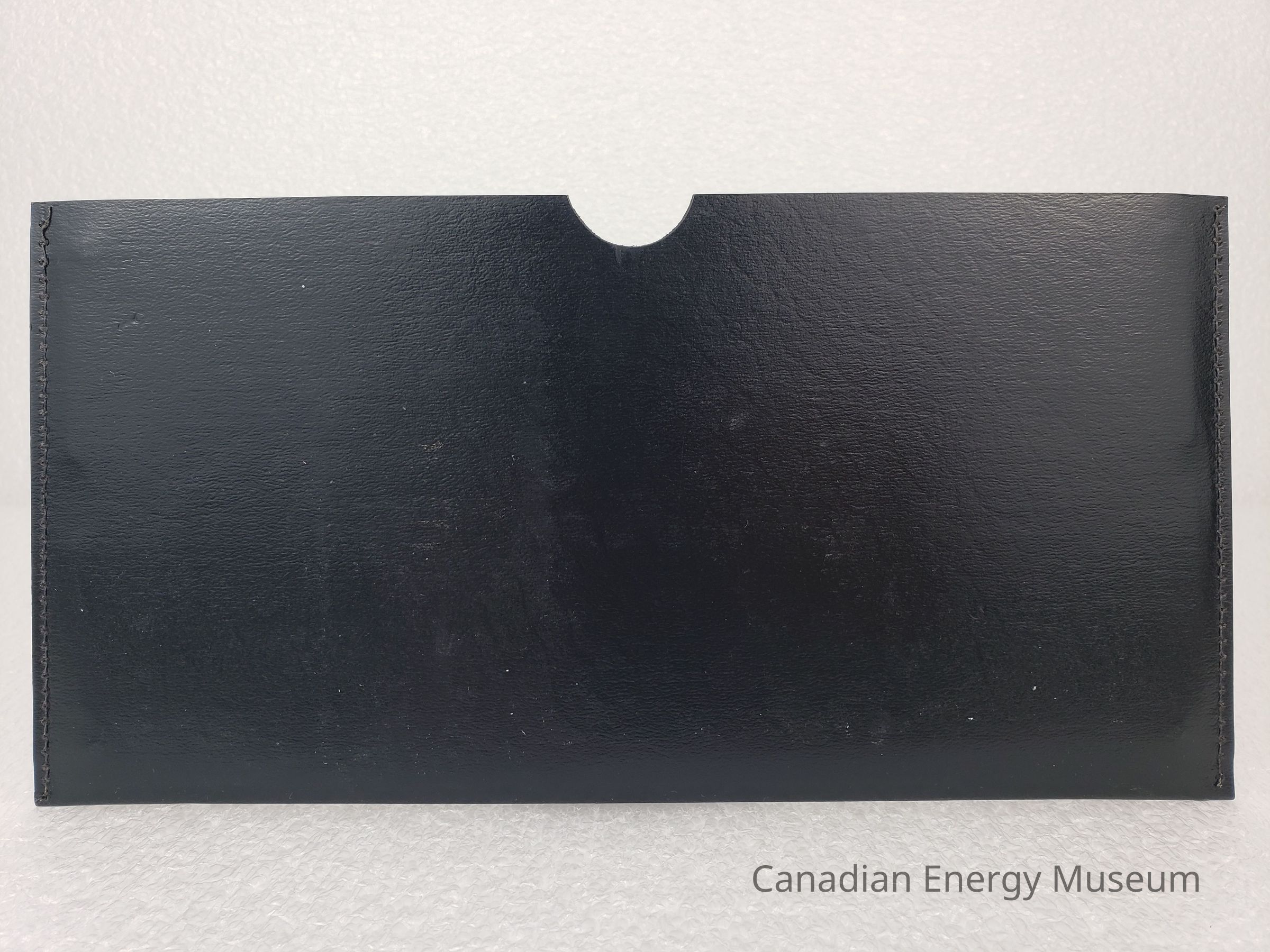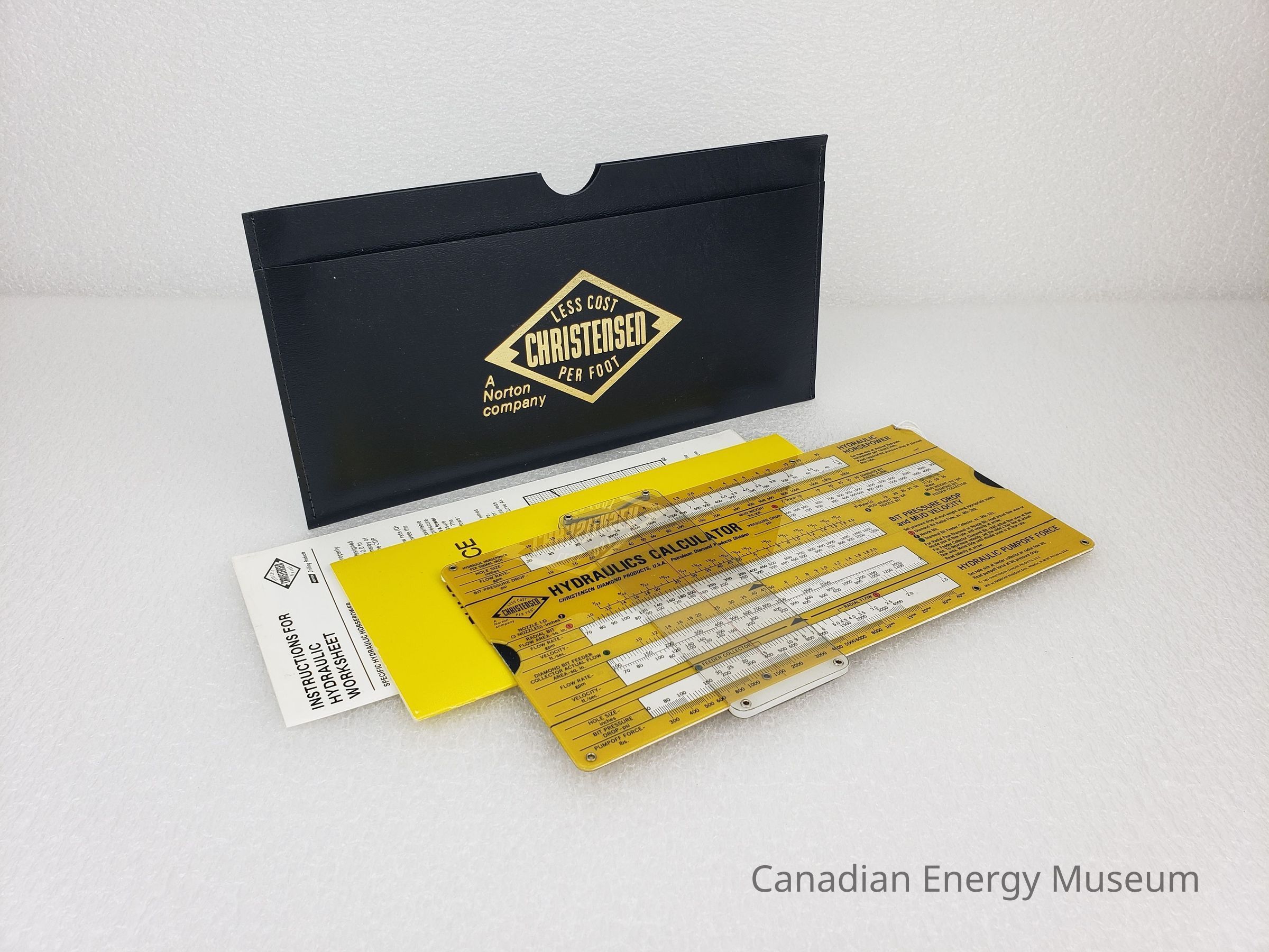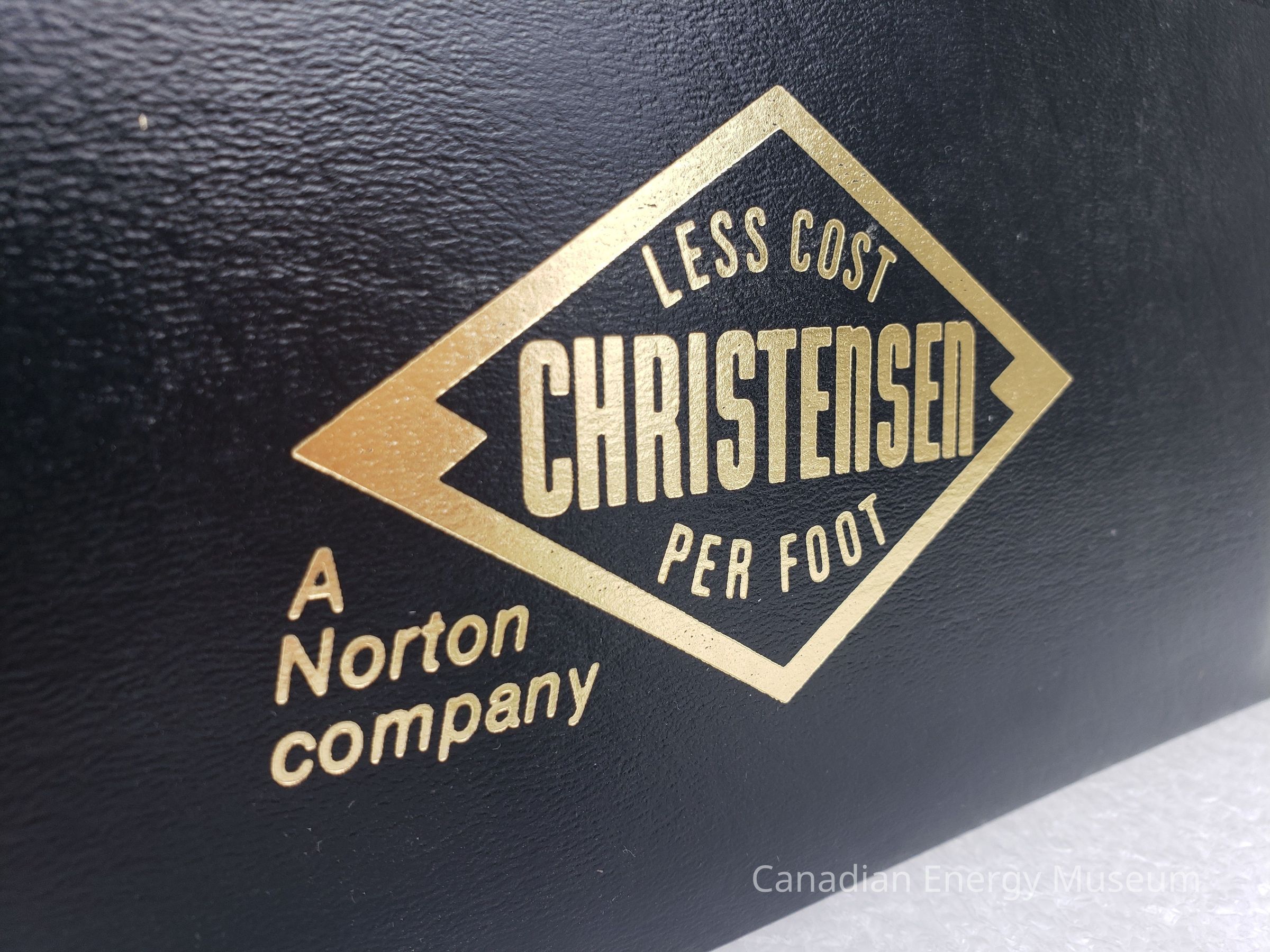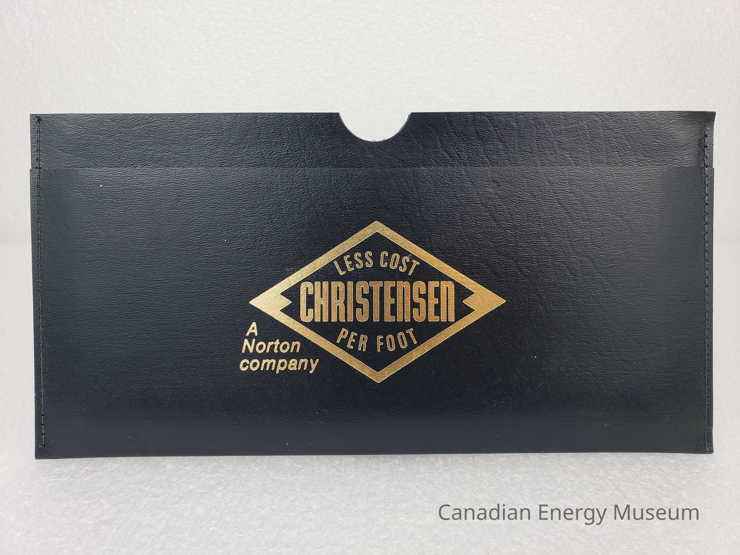 Document Wallet: A simple, black faux-leather, stitched document wallet, with two pockets and gold-foil print on the front. In the centre of the front surface is the Christensen horizontal diamond logo ("Less Cost Per Foot") and the text "A Norton company". The front pocket has a lower front and contained the booklet and pamphlet. The main pocket has a half-circle cutout in the centre and contains the slide chart.