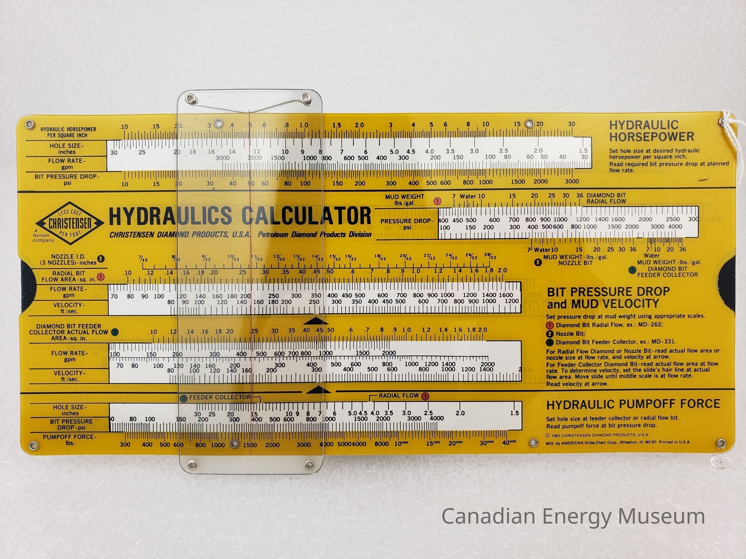 1980s, Plastic, Metal, Paper, Yellow, Gold, Black, White, Slide, Slide Chart, Slide Converter, Slide Rule, Hydraulics, Technical Stationery, Calculations Table, Calculator, Booklet, Pamphlet, Christensen Drilling Products, Stationery, Drilling, Oil, Oil Field, Oil Industry, OilfieldDescription