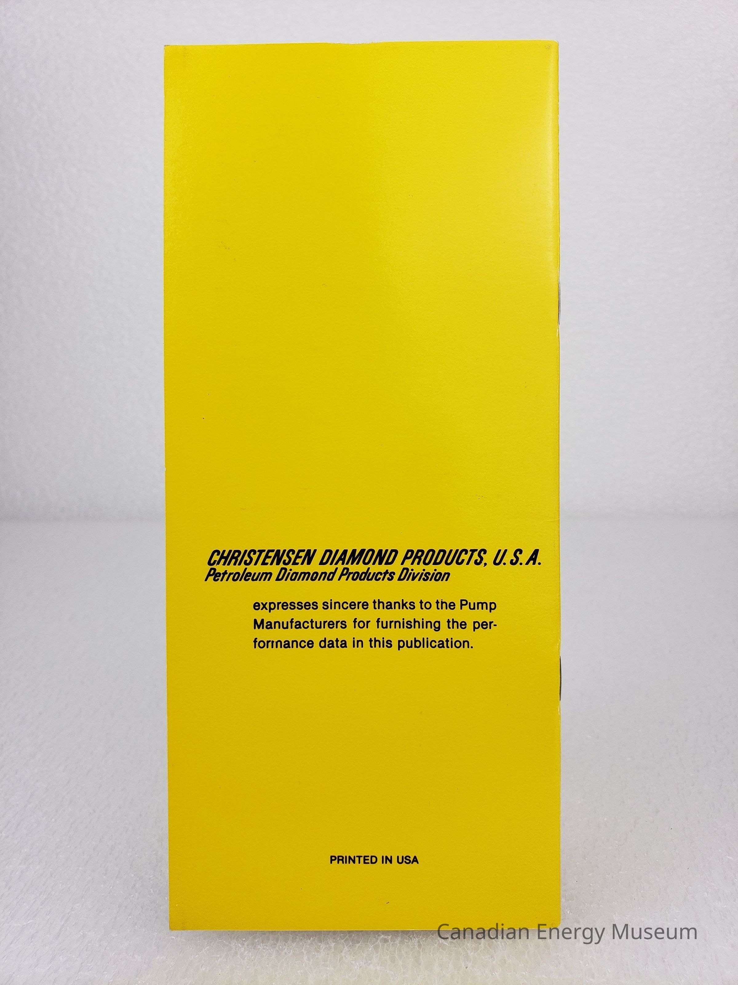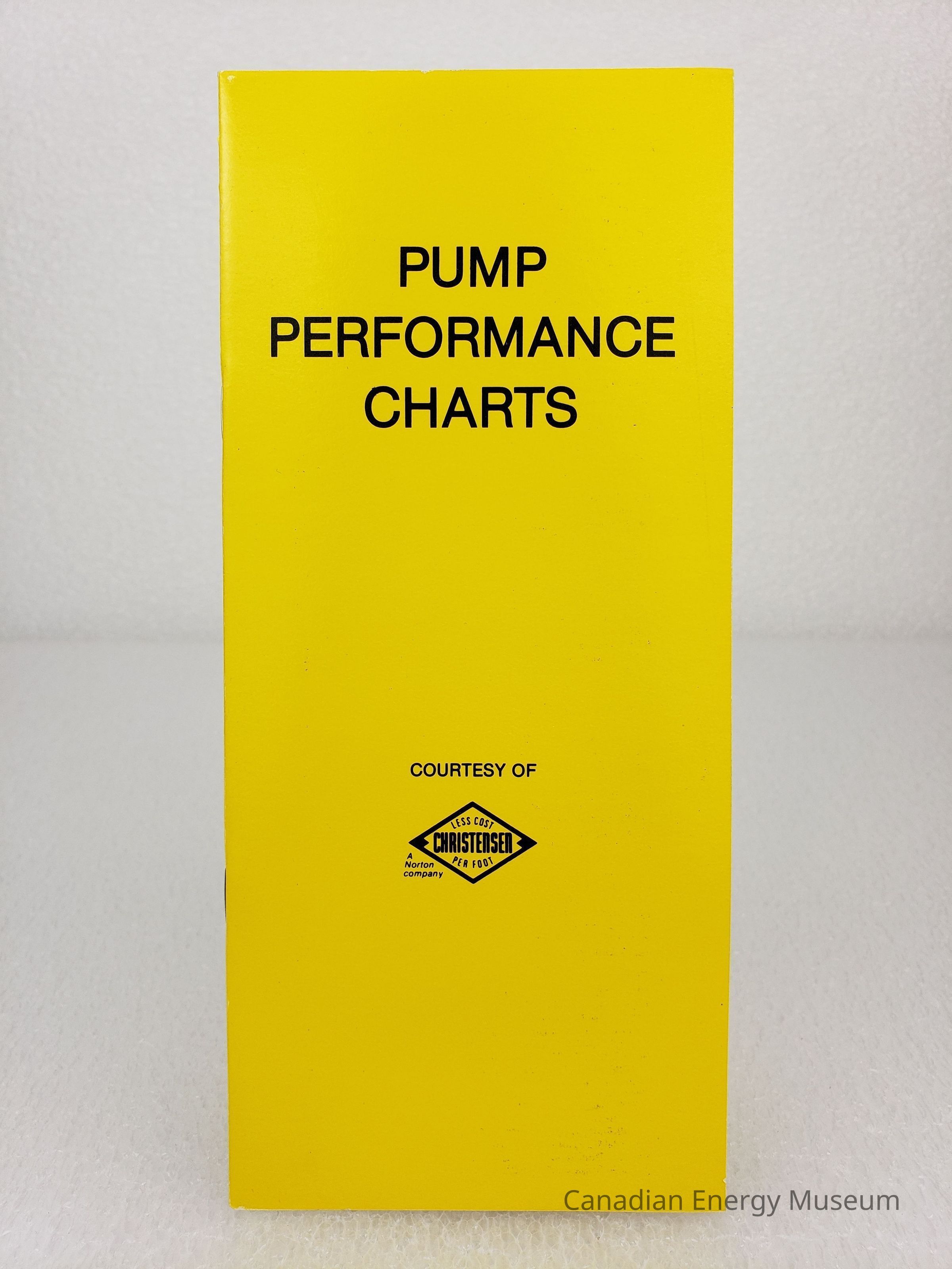 Booklet: The tall, narrow booklet, titled "PUMP PERFORMANCE CHARTS", contains various charts and calculations. Yellow cover with black print. Branded to Christensen.
