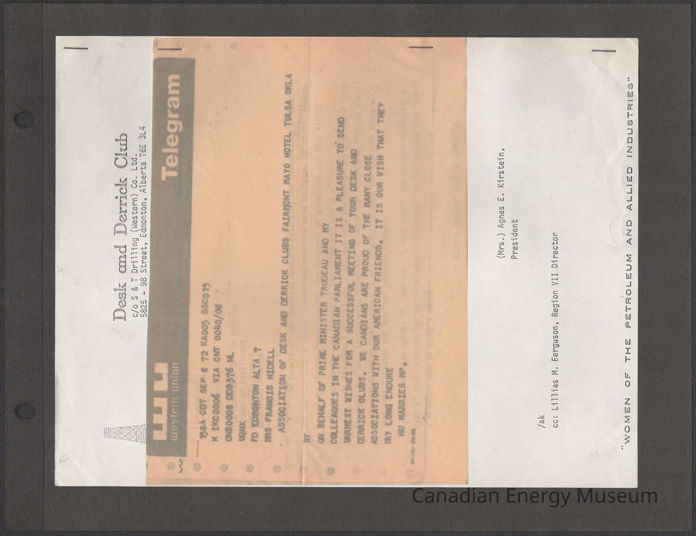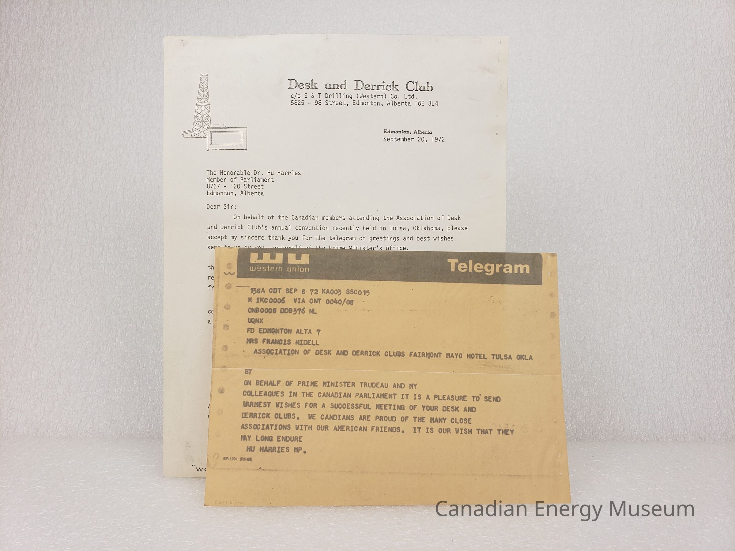 [Correspondence] Letter and Telegram, Hu Harries and Pierre Trudeau, Association of Desk and Derrick Clubs, Tulsa Oklahoma, 8 September, 1972Entry/Object ID