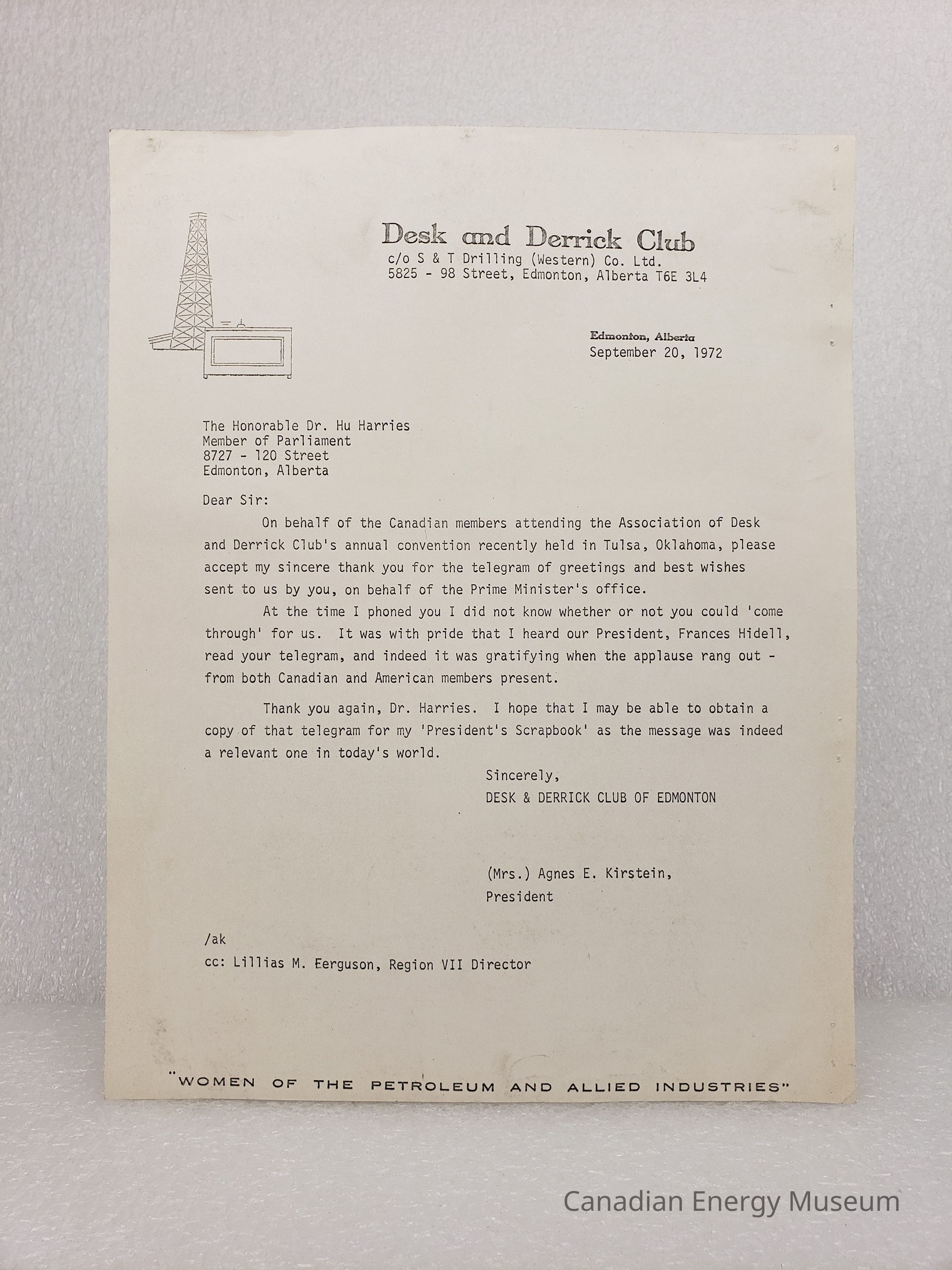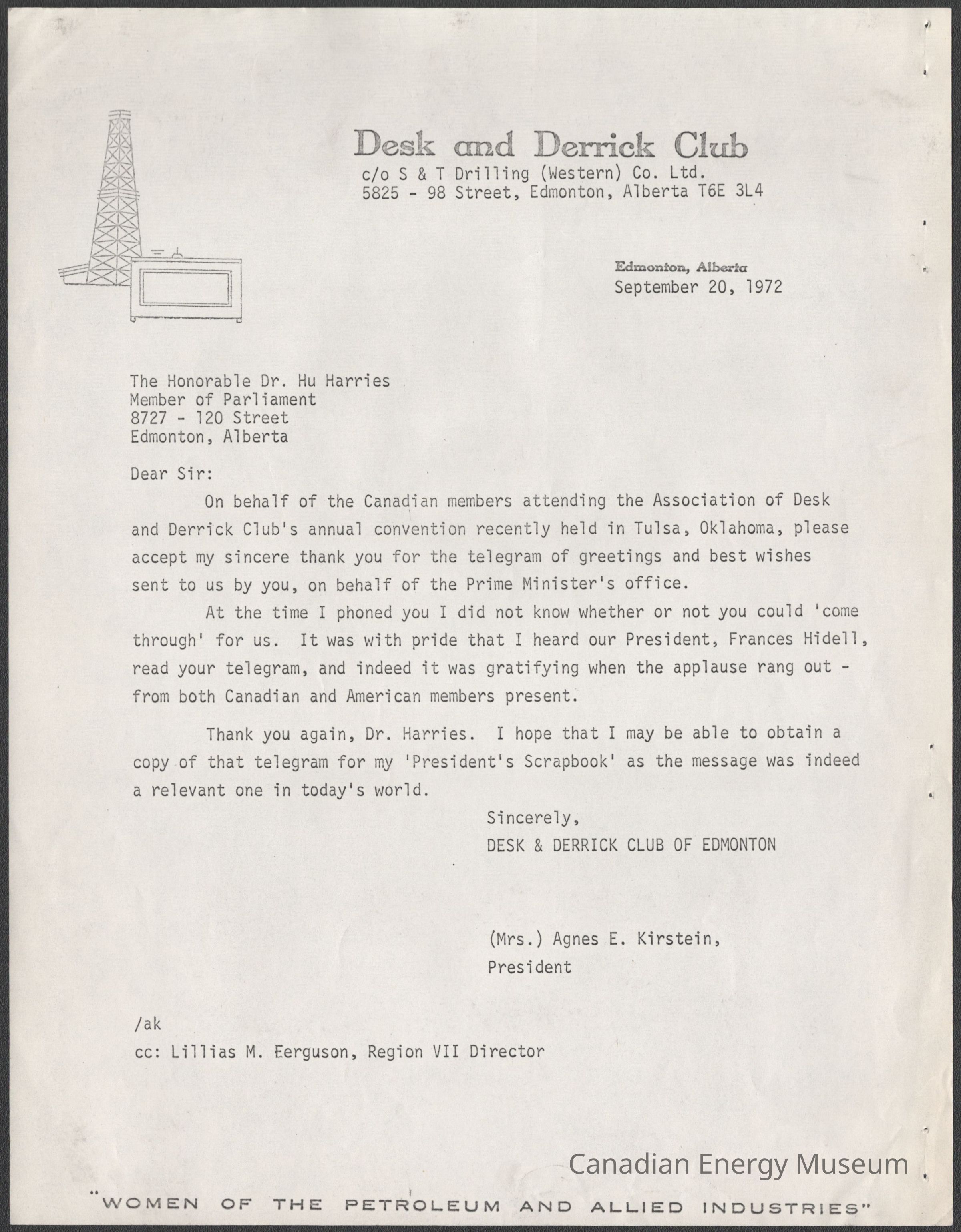 Letter: A letter from the Desk and Derrick Club of Edmonton, to Honorable Dr. Hu Harries (Member of Parliament, Canada), dated to 20 September 1972. The contents thank Dr. Harries for the telegram (2004.2.338.2) of greetings and best wishes sent by him on behalf of the Prime Minister Pierre Trudeau. Letter is on Desk and derrick Club letterhead.
