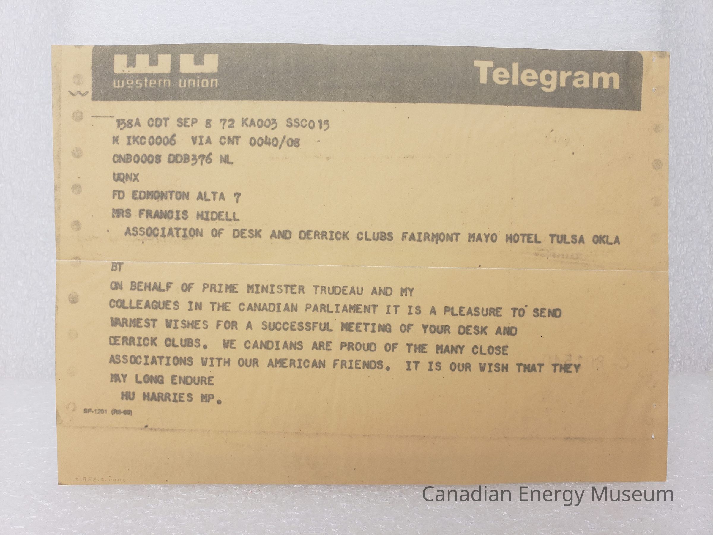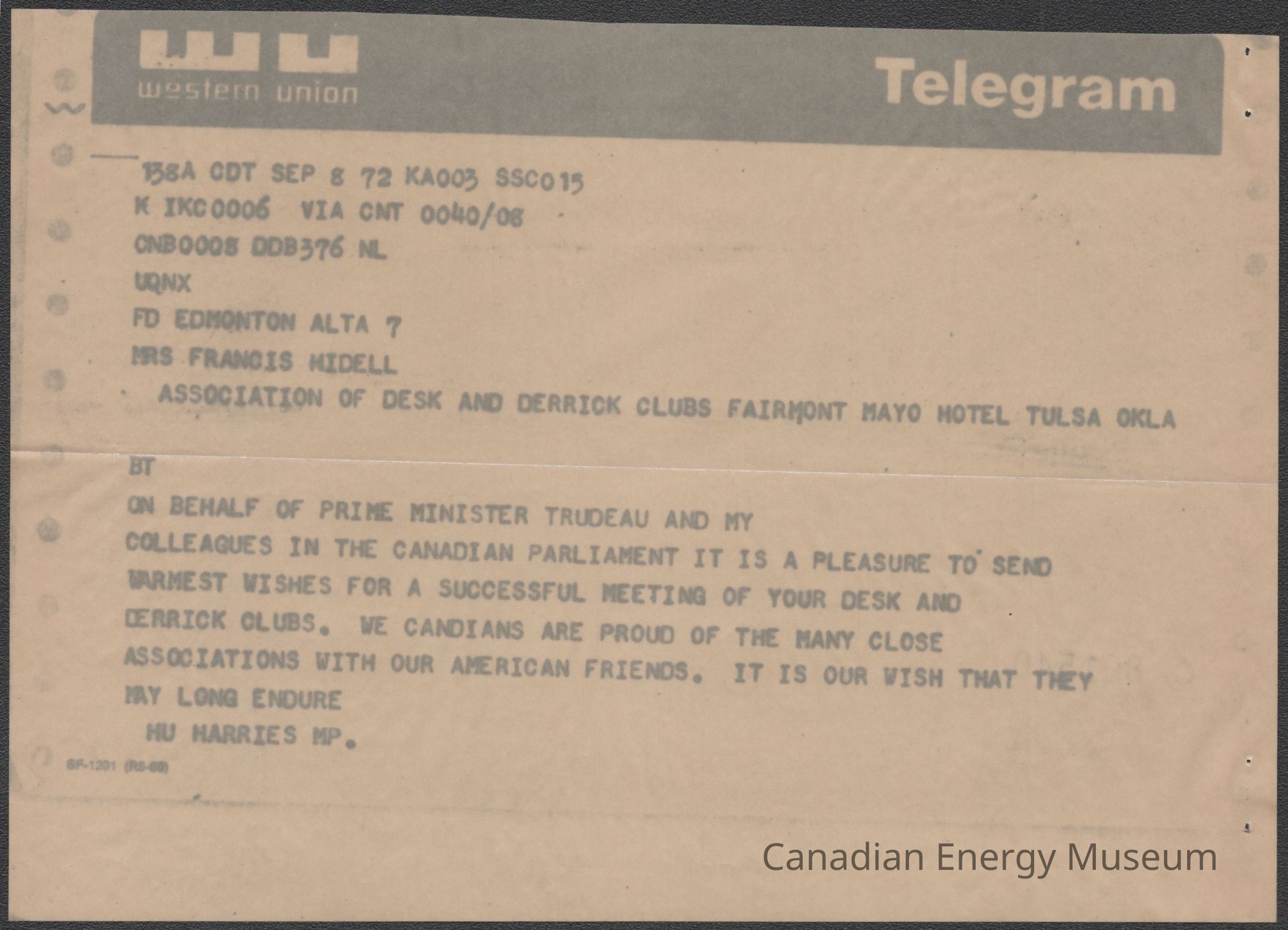 Telegram: A telegram from the Honorable Dr. Hu Harries (Member of Parliament, Canada) to Francis Hidell (ADDC President), dated 8 September 1972. Message reads "ON BEHALF OF PRIME MINISTER TRUDEAU AND MY COLLEAGUES IN THE CANADIAN PARLIAMENT IT IS A PLEASURE TO SEND WARMEST WISHES FOR A SUCCESSFUL MEETING OF YOUR DESK AND DERRICK CLUBS. WE CANADIANS ARE PROUD OF THE MANY CLOSE ASSOCIATIONS WITH OUR AMERICAN FRIENDS. IT IS OUR WISH THAT THEY MAY LONG ENDURE".