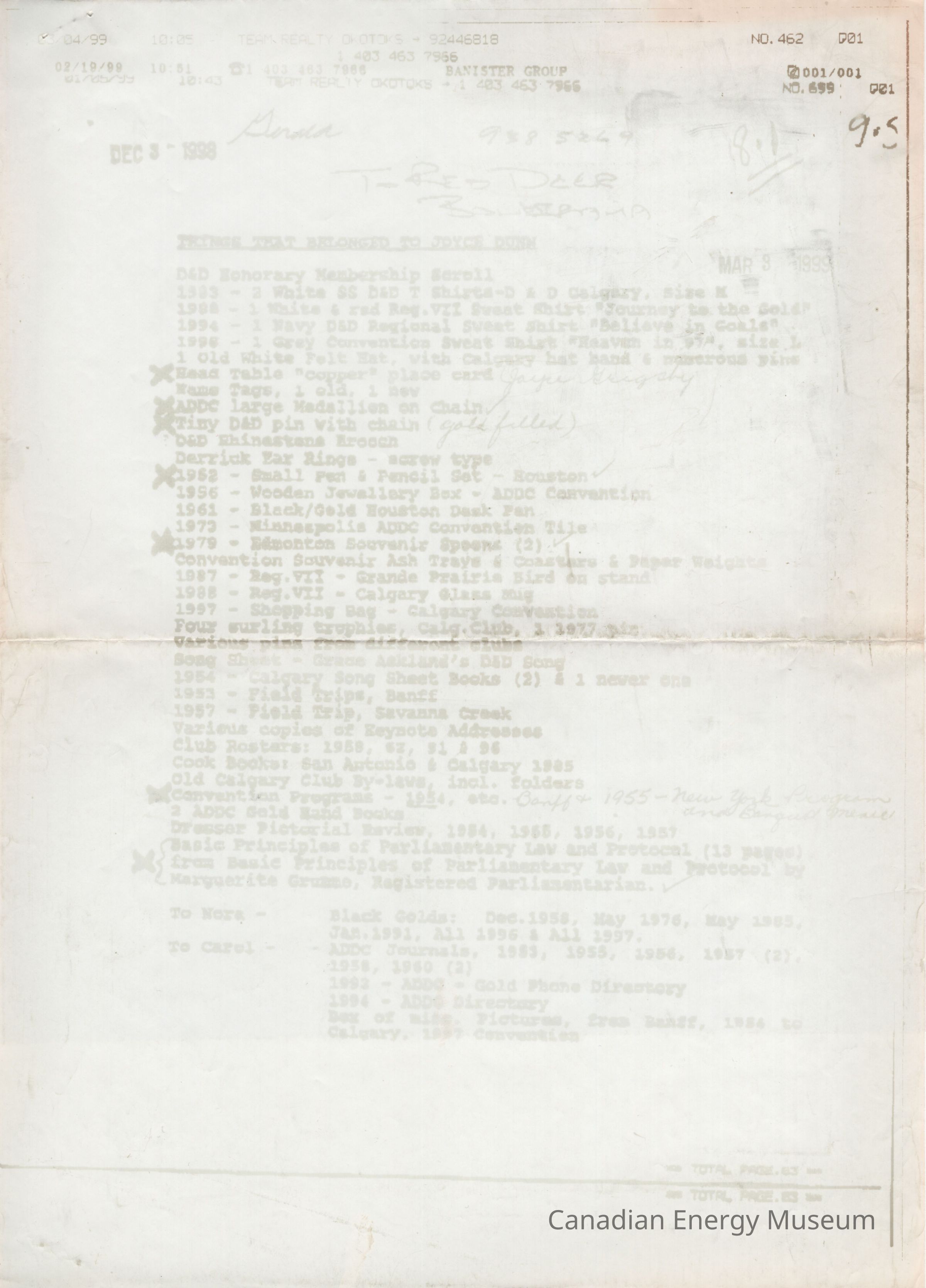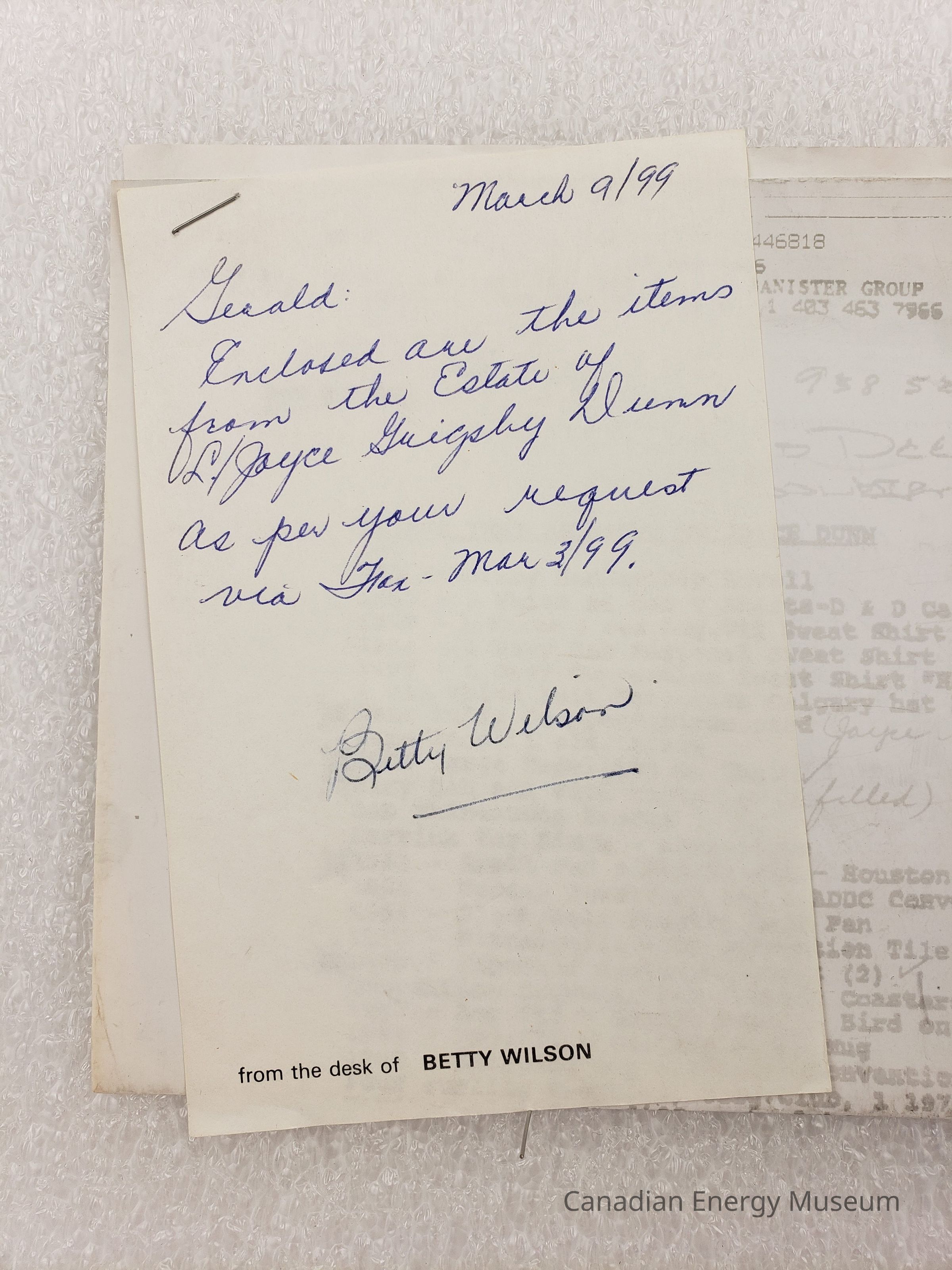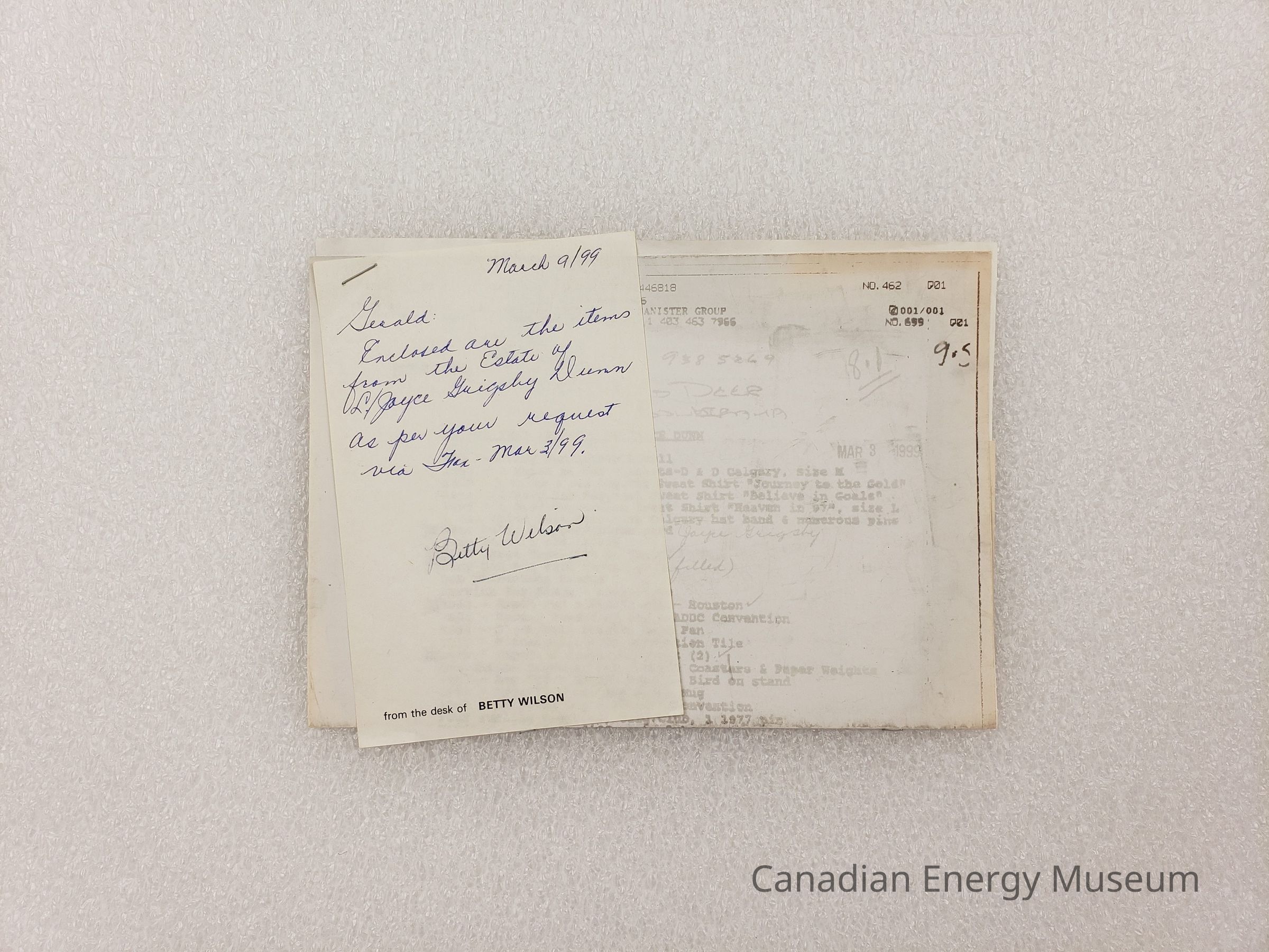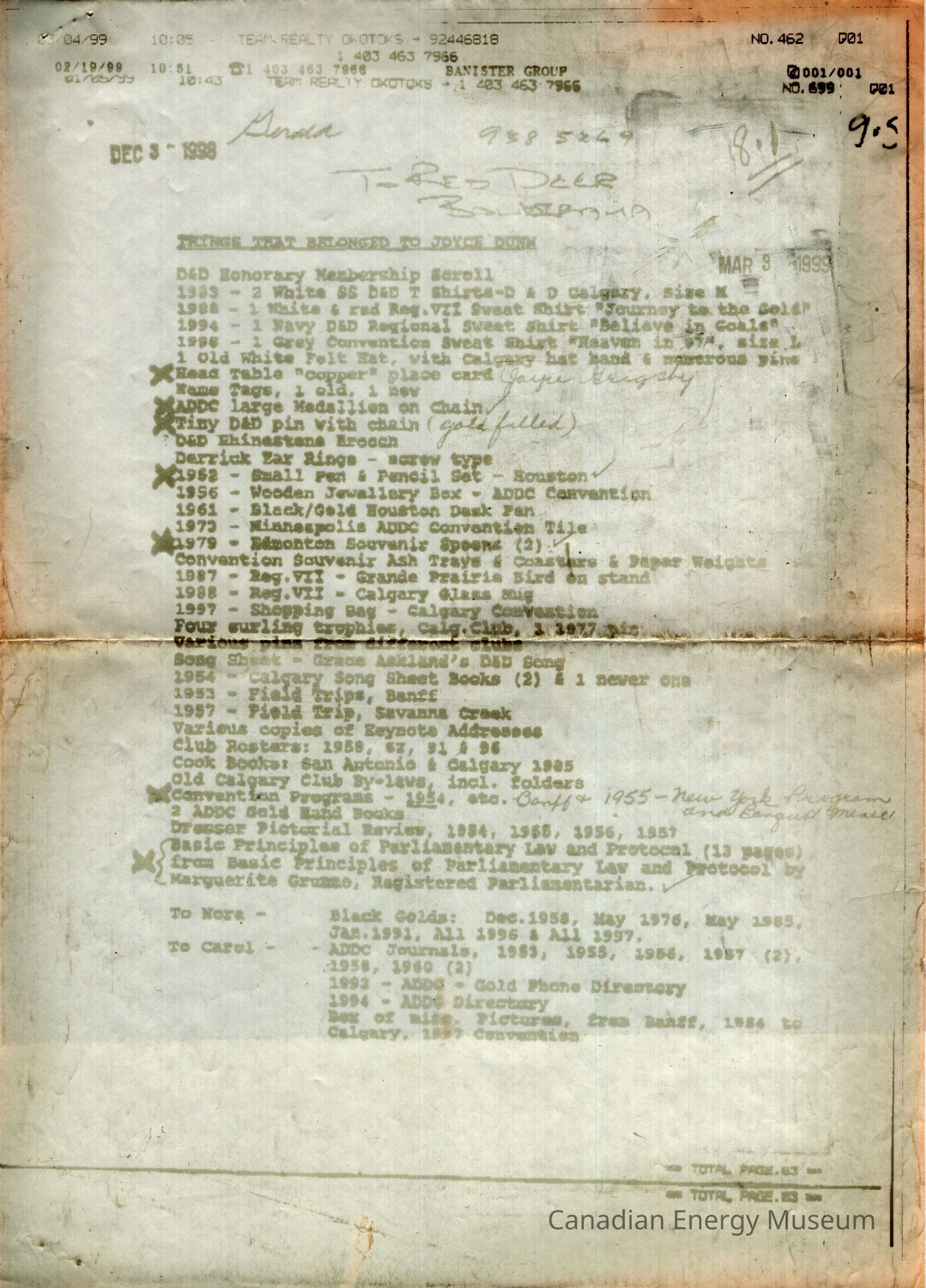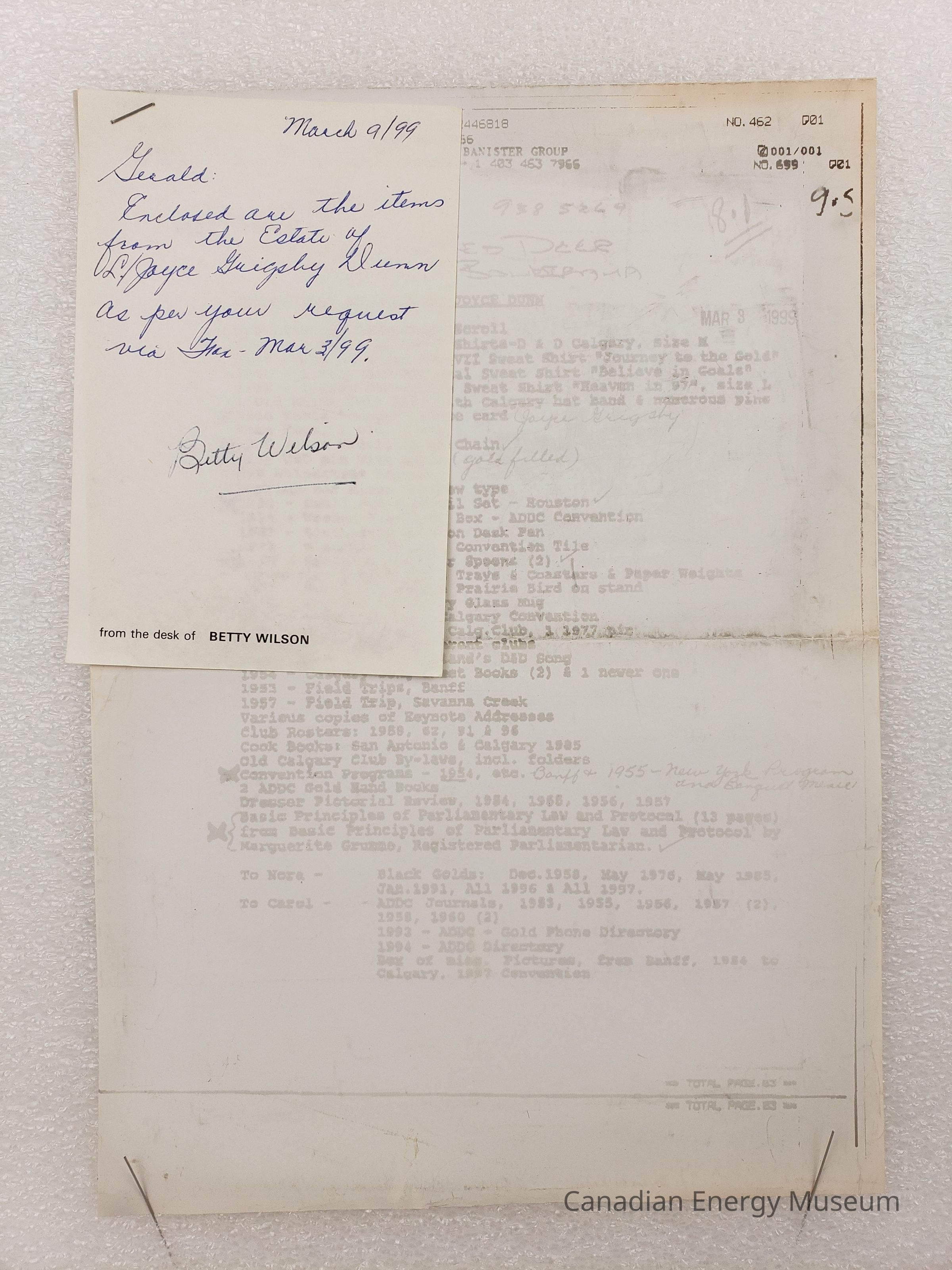 A photocopy of a document listing "THINGS THAT BELONGED TO JOYCE DUNN", accompanied by a small handwritten note on personalized notepaper. The document is duplicated through fax onto thermal paper. Its content is faded, though still mostly legible. It lists a series of items, many with connections to the Association of Desk and Derrick Clubs of America, including branded clothing, stationery, books, print documents and ephemera, and accessories. The photocopy has a variety of dates on it, ranging from 3 December 1998 to 4 March 1999. The faxed sheet is irregularly long, and has been folded over along the top. The note reads, "March 9/99; Gerald:; Enclosed are the items from the Estate of L./ Joyce [Guigsby?] Dunn as per your request via [Jan?] - Mar 3./99/; Betty Wilson", with the personalized notepaper reading "from the desk of BETTY WILSON" printed in the bottom-left corner. The three items are stapled together in the top-left corner.