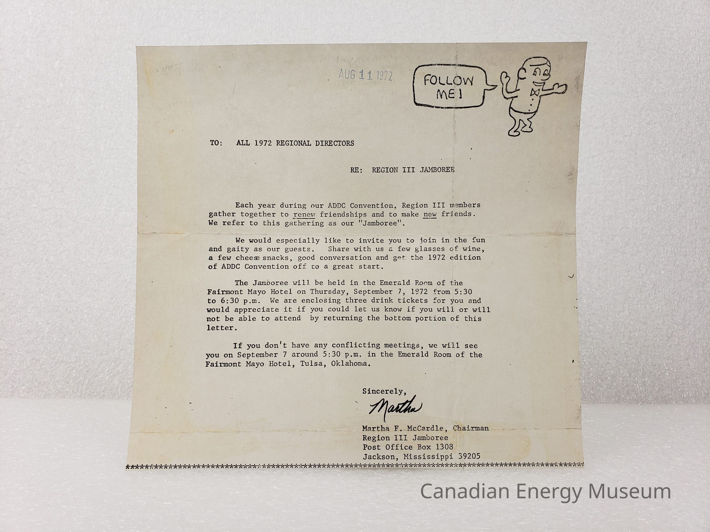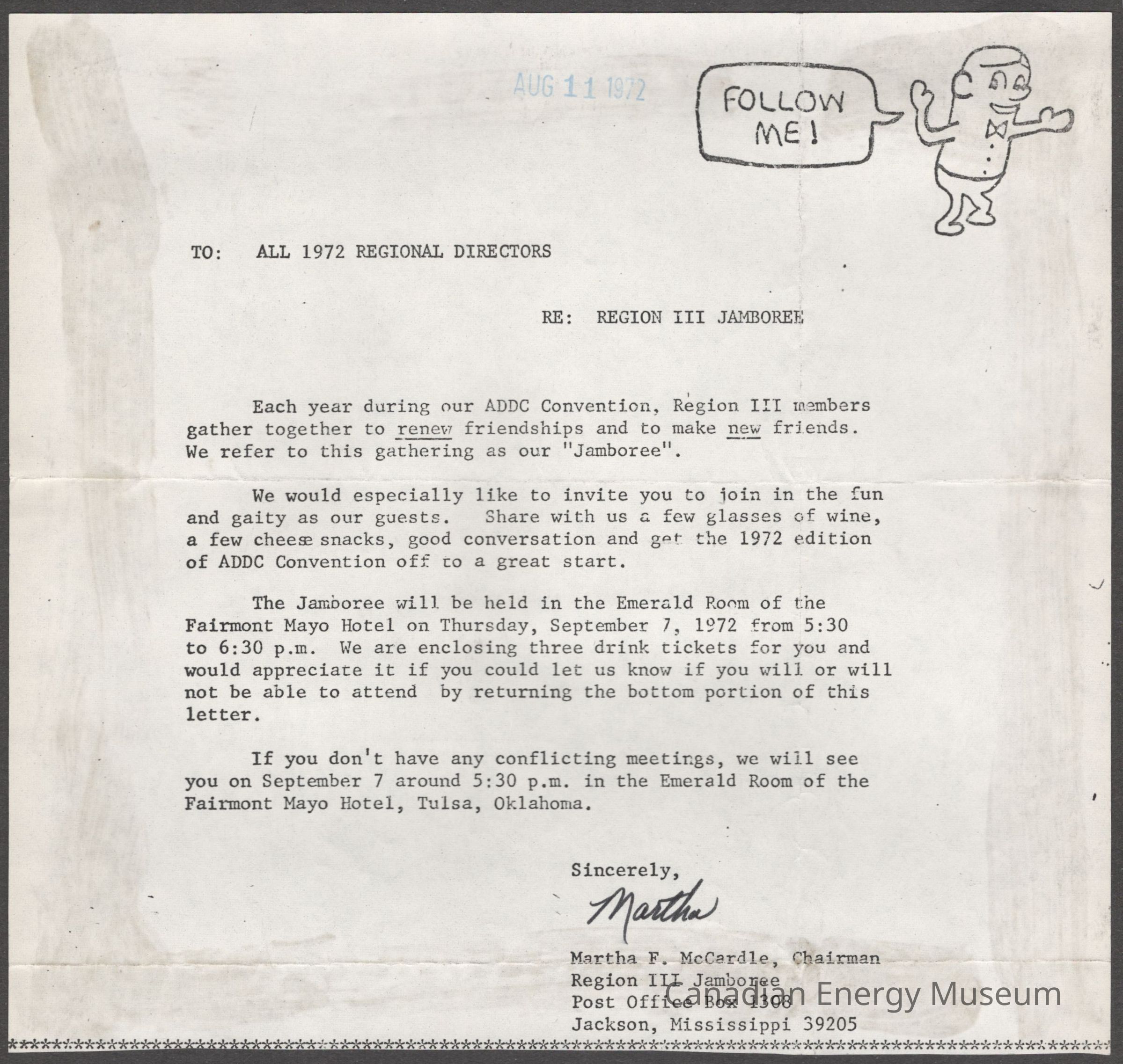 A letter addressed to "ALL 1972 REGIONAL DIRECTORS", from Martha F. McCardle (ADDC Chairman, Jackson, Mississippi). It contains content on the topic of the Region III Jamboree to be held Thursday 7 September 1972, as part of the Association of Desk and Derrick Clubs Convention, 7-9 September 1972. The original letter was typewritten, with a caricature of a man drawn in the top-right corner with a speech-bubble, "FOLLOW ME!". The letter has been photocopied, and a section has been trimmed from the bottom of the page, making it shorter than standard letter size. A blue ink rubber stand on the top of the page dates it to being received 11 August 1972.