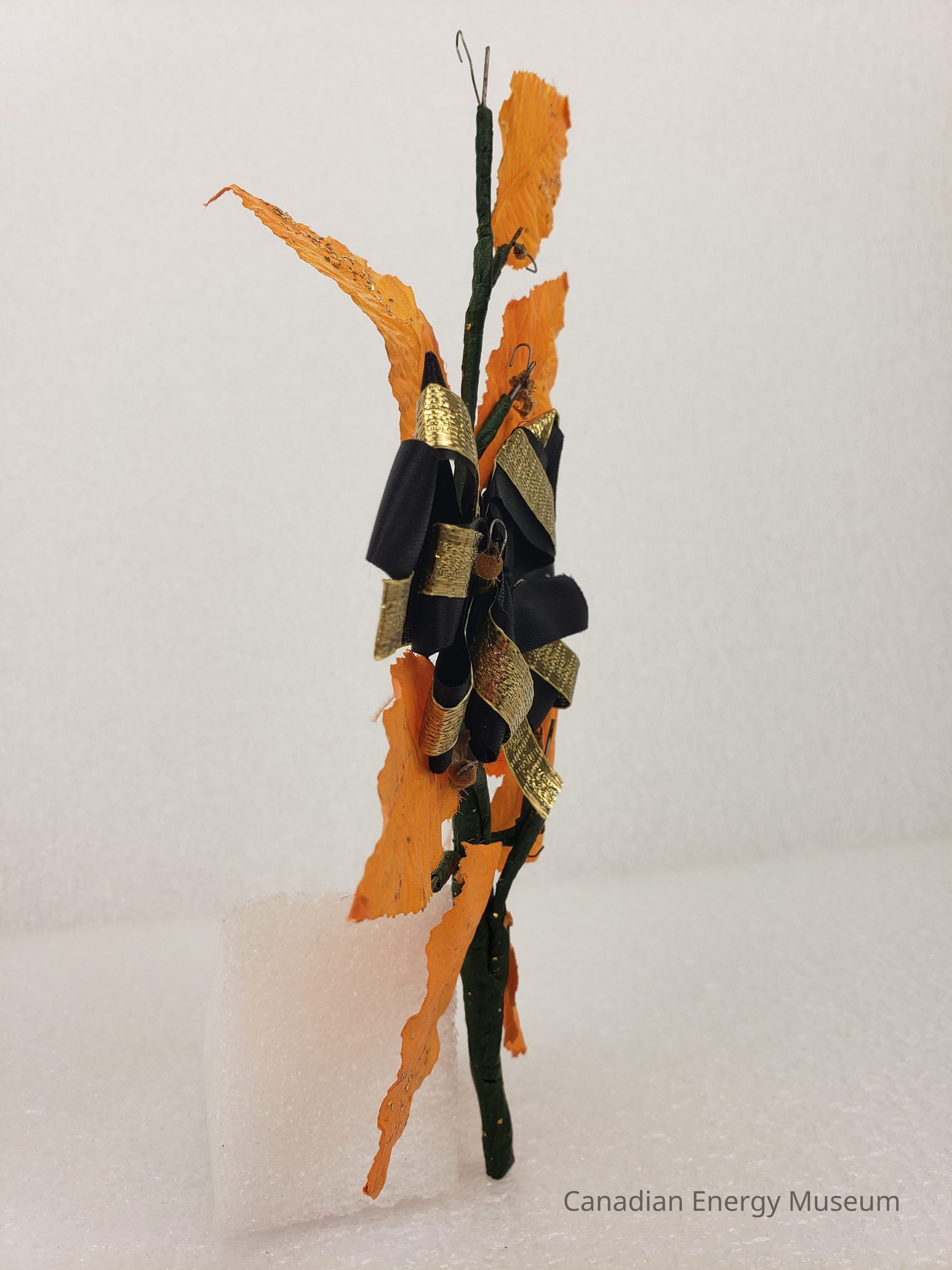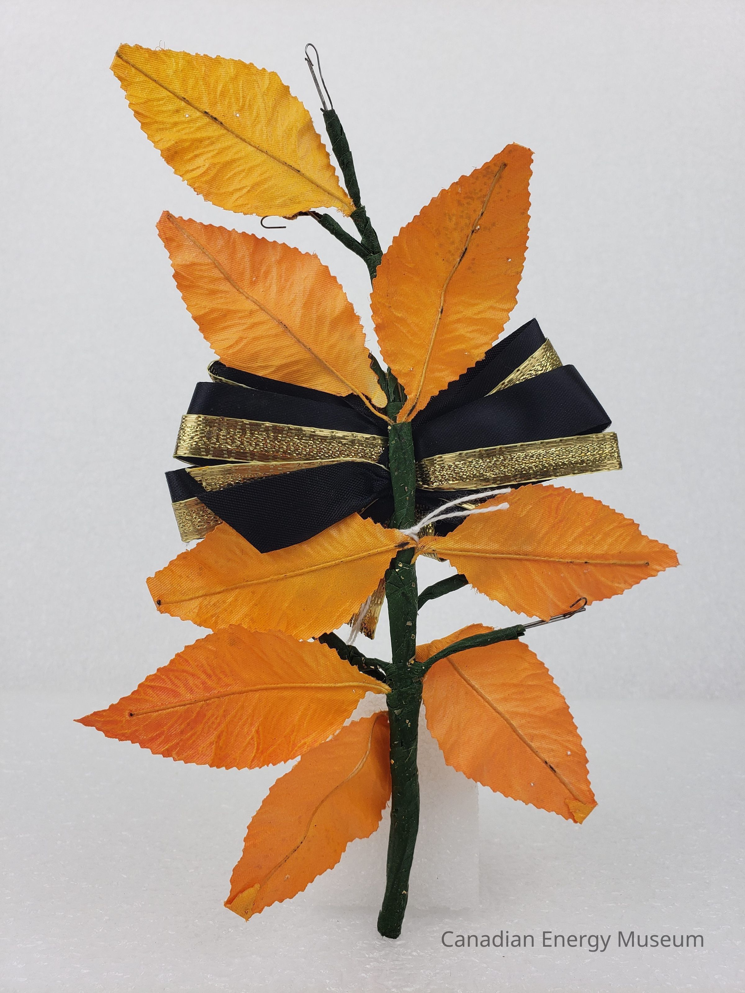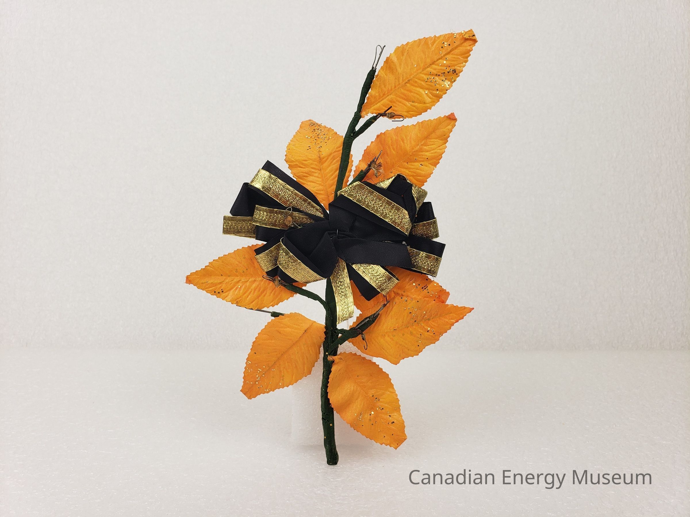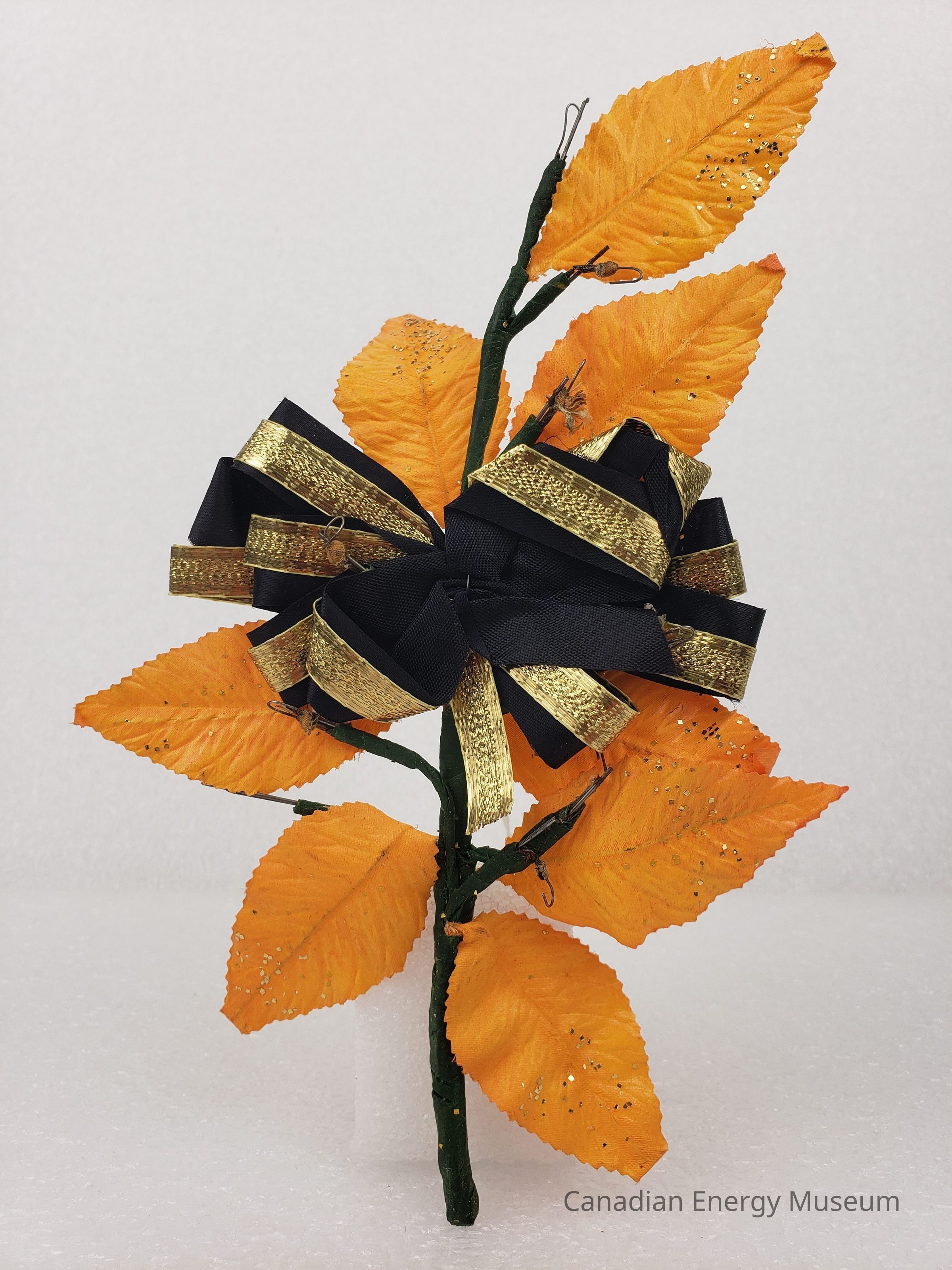 [Corsage] Ribbon with Plastic Leaves and Glitter, Black Gold Orange, c.1972Entry/Object ID