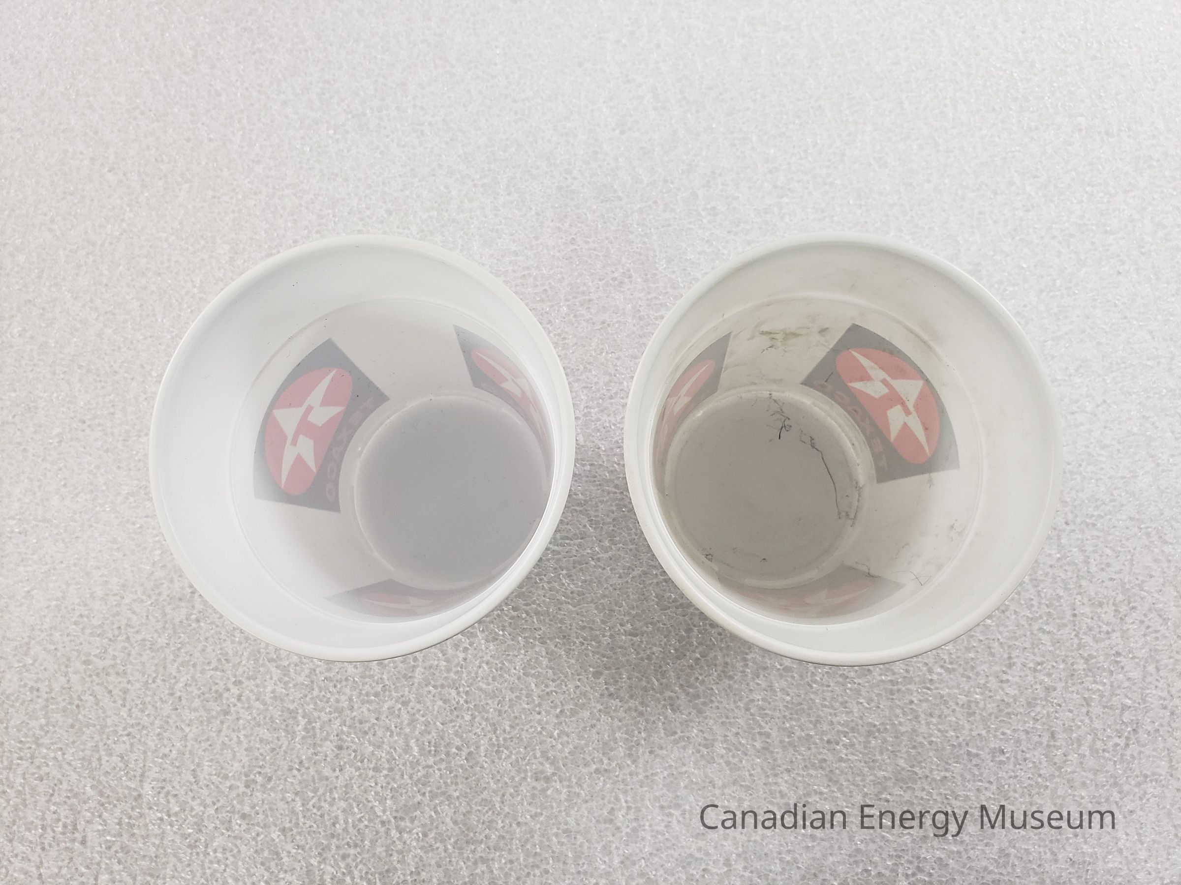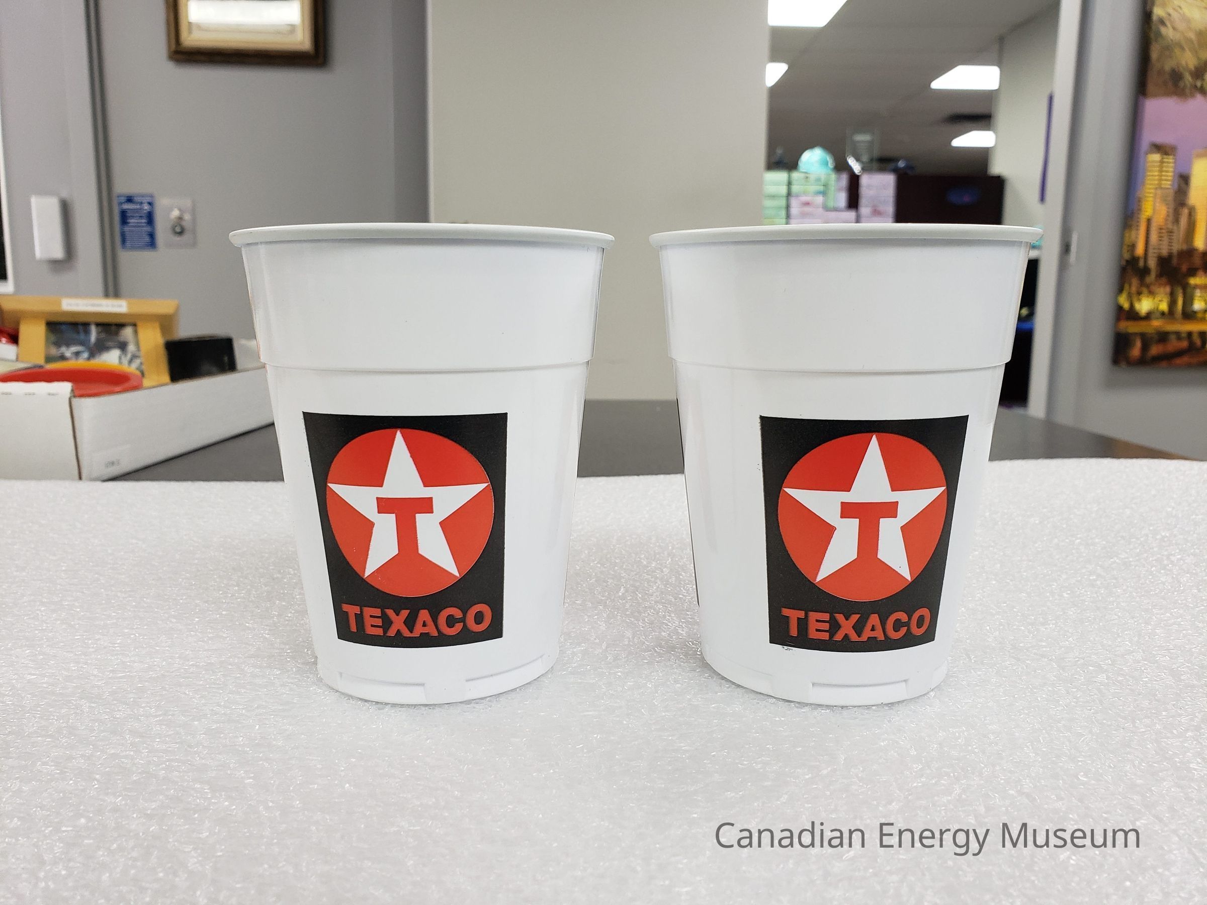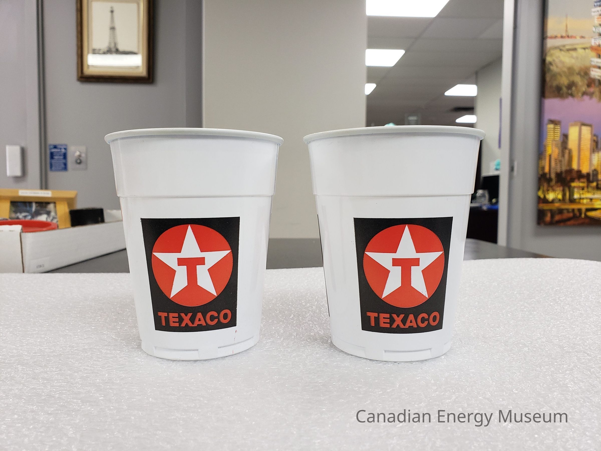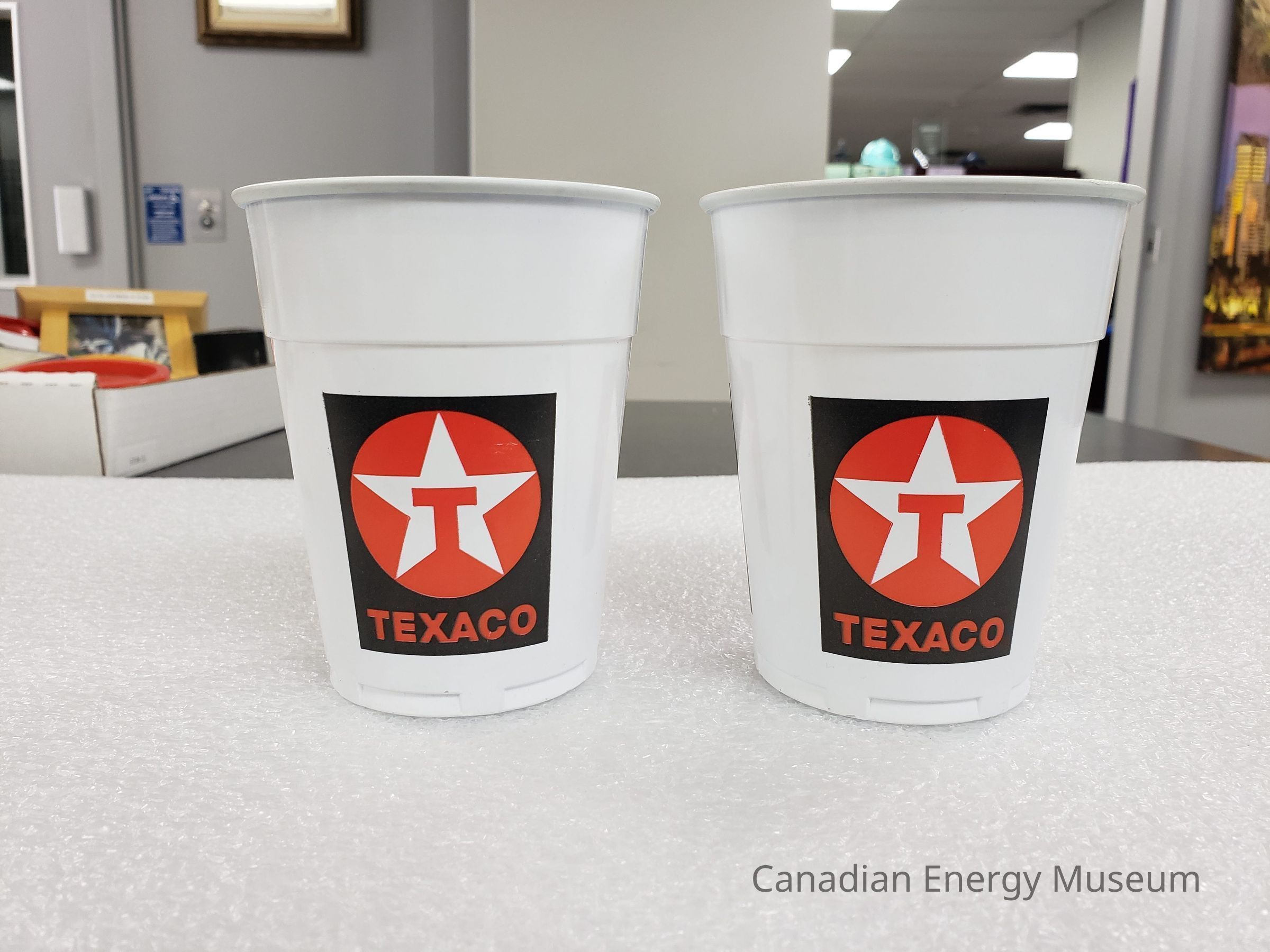 Features: The base plastic of the cups is white, and on the sides are three prints of the Texaco logo (red circle, with an interior white star and red "T" within the star) evenly arranged horizontally around the cup.