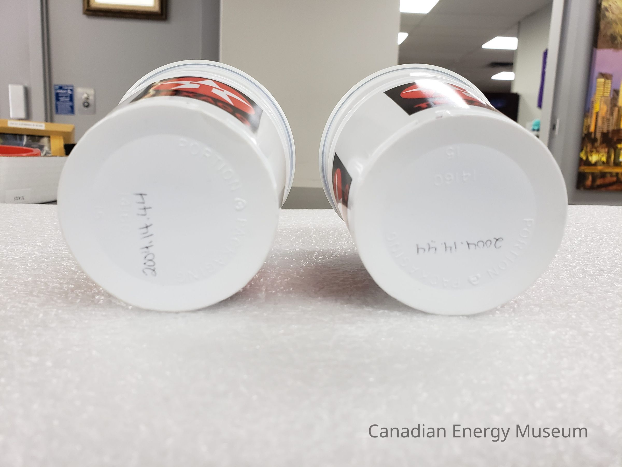 Cup #1 is relatively clean, with only some dust sticking to the interior due to static. Below one of the logos is a red mark running to the base, potentially a manufacturer's fault. Cup #2 is quite marked, having been used as a pencil cup (multiple lines, marks, and smudges of pencil lead throughout the interior, focused particularly around the base).Materials