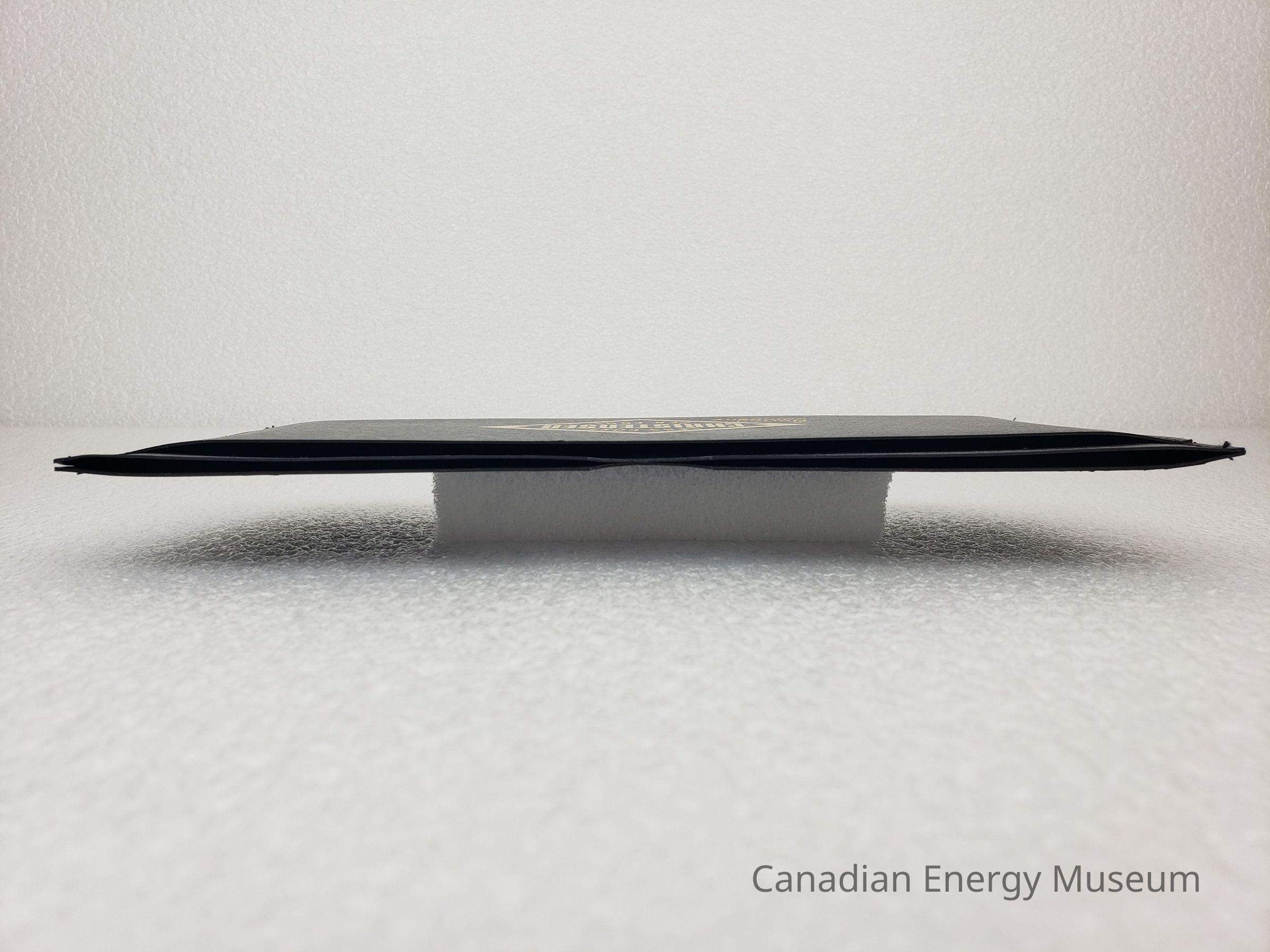 Document Wallet: A simple, black faux-leather, stitched document wallet, with two pockets and gold-foil print on the front. In the centre of the front surface is the Christensen horizontal diamond logo ("Less Cost Per Foot") and the text "A Norton company". The front pocket has a lower front and contained the booklet and pamphlet. The main pocket has a half-circle cutout in the centre and contains the slide chart.