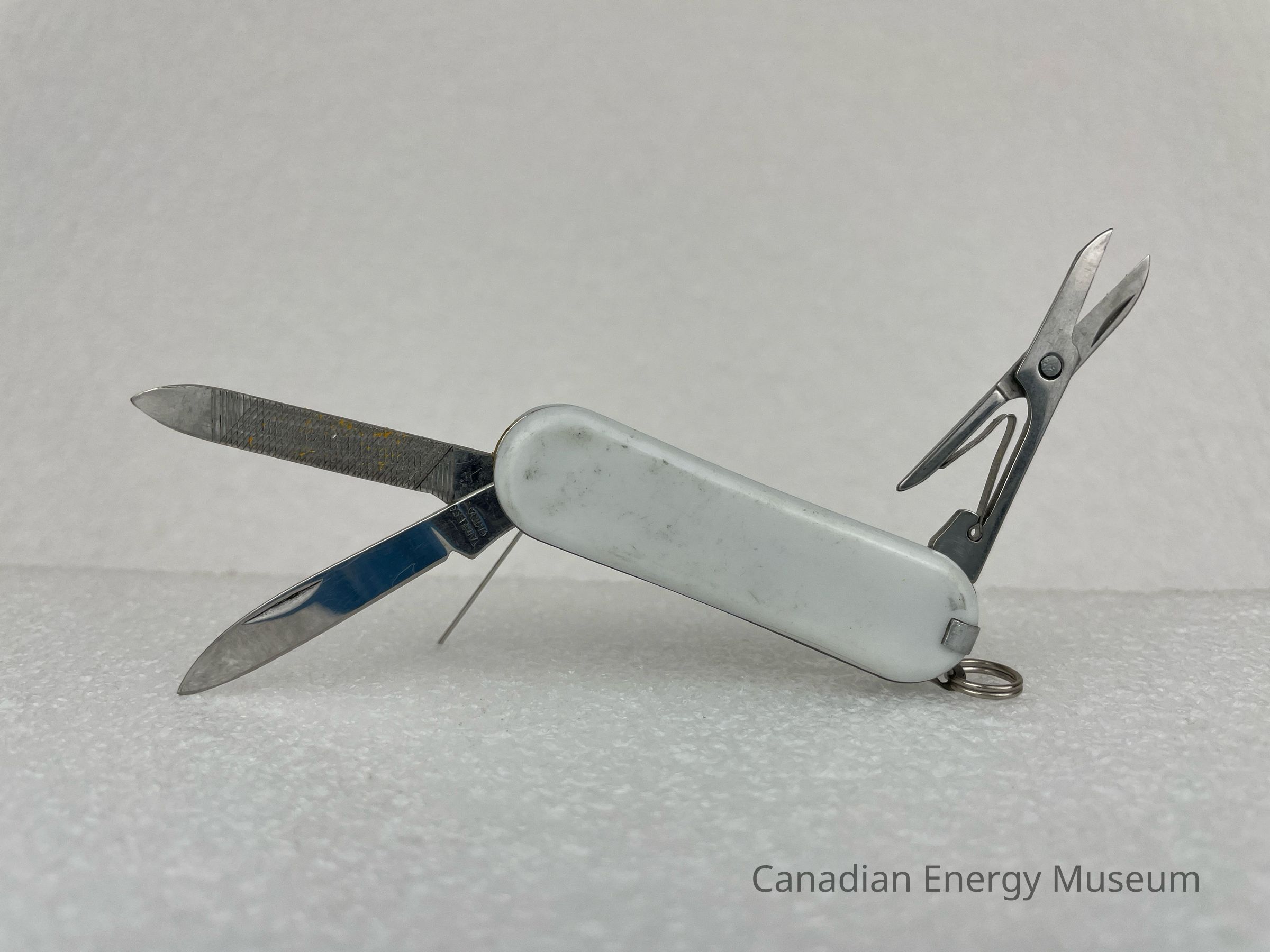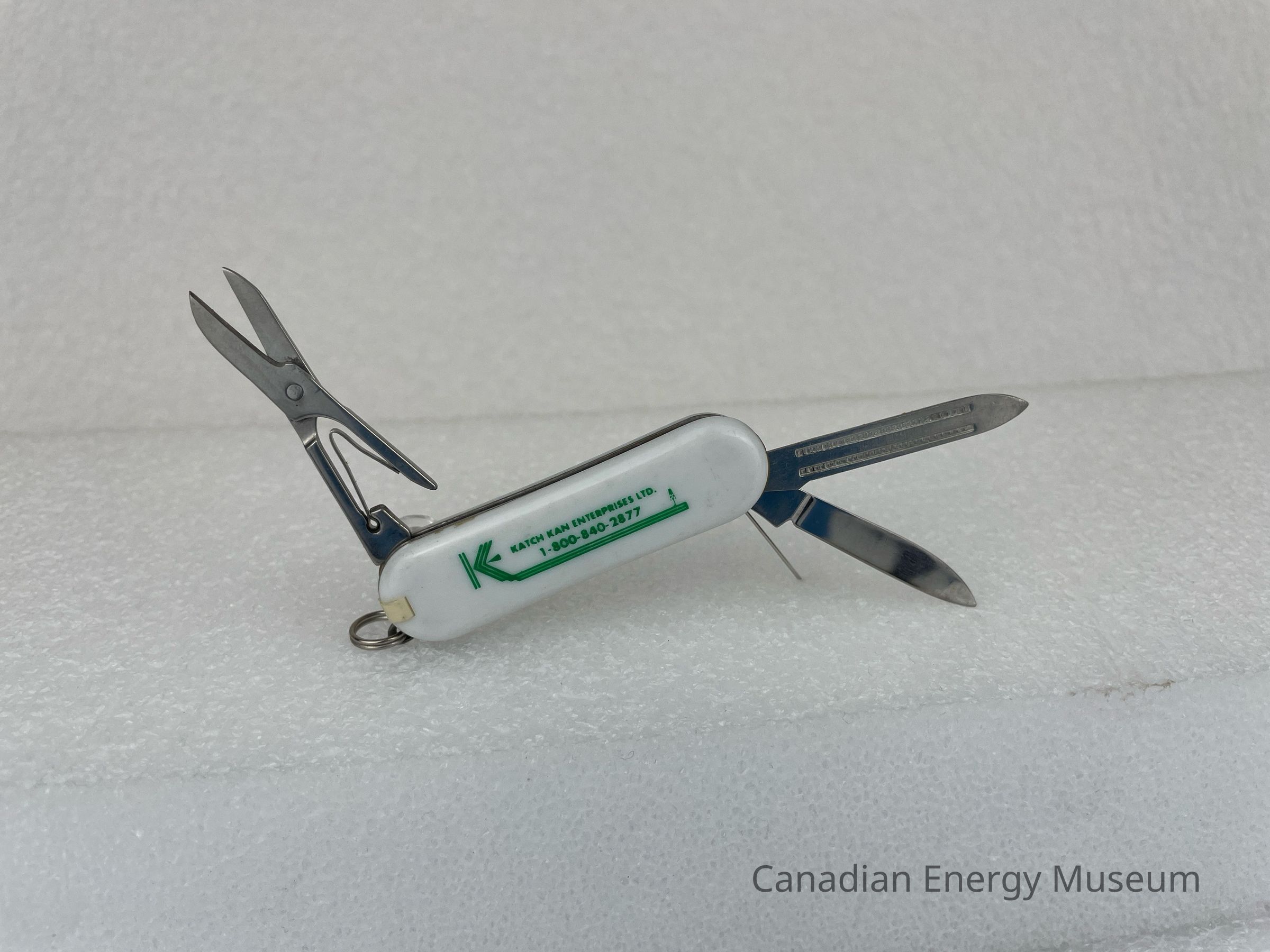 A silver metal pocket knife with a white plastic handle branded to Katch Kan Enterprises Ltd.