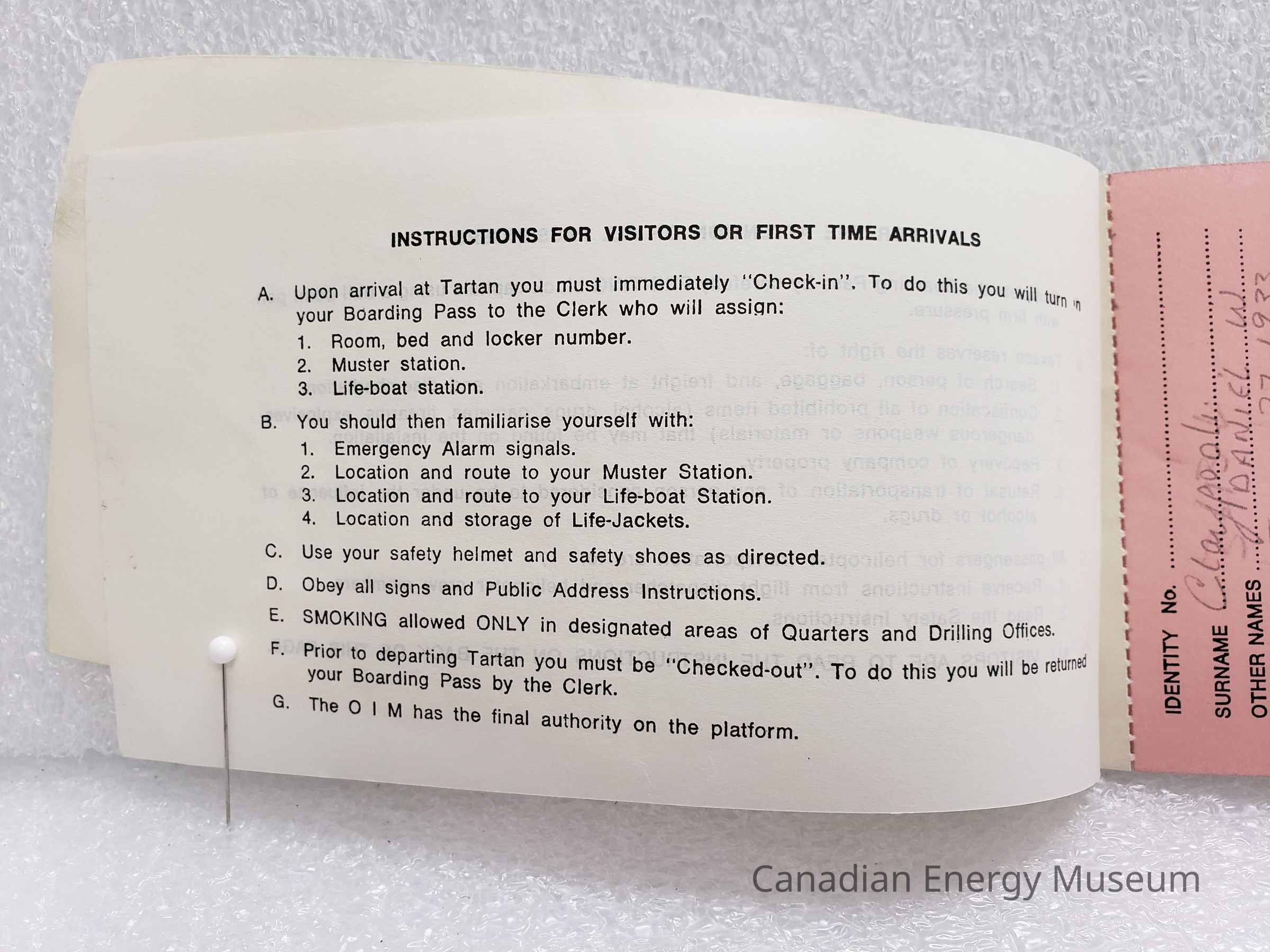 A boarding pass for the Texaco Tartan Platform, in the North Sea UK, made out to Dan Claypool. Comprised of FOUR sheets of paper and card, stapled at the top.Collection