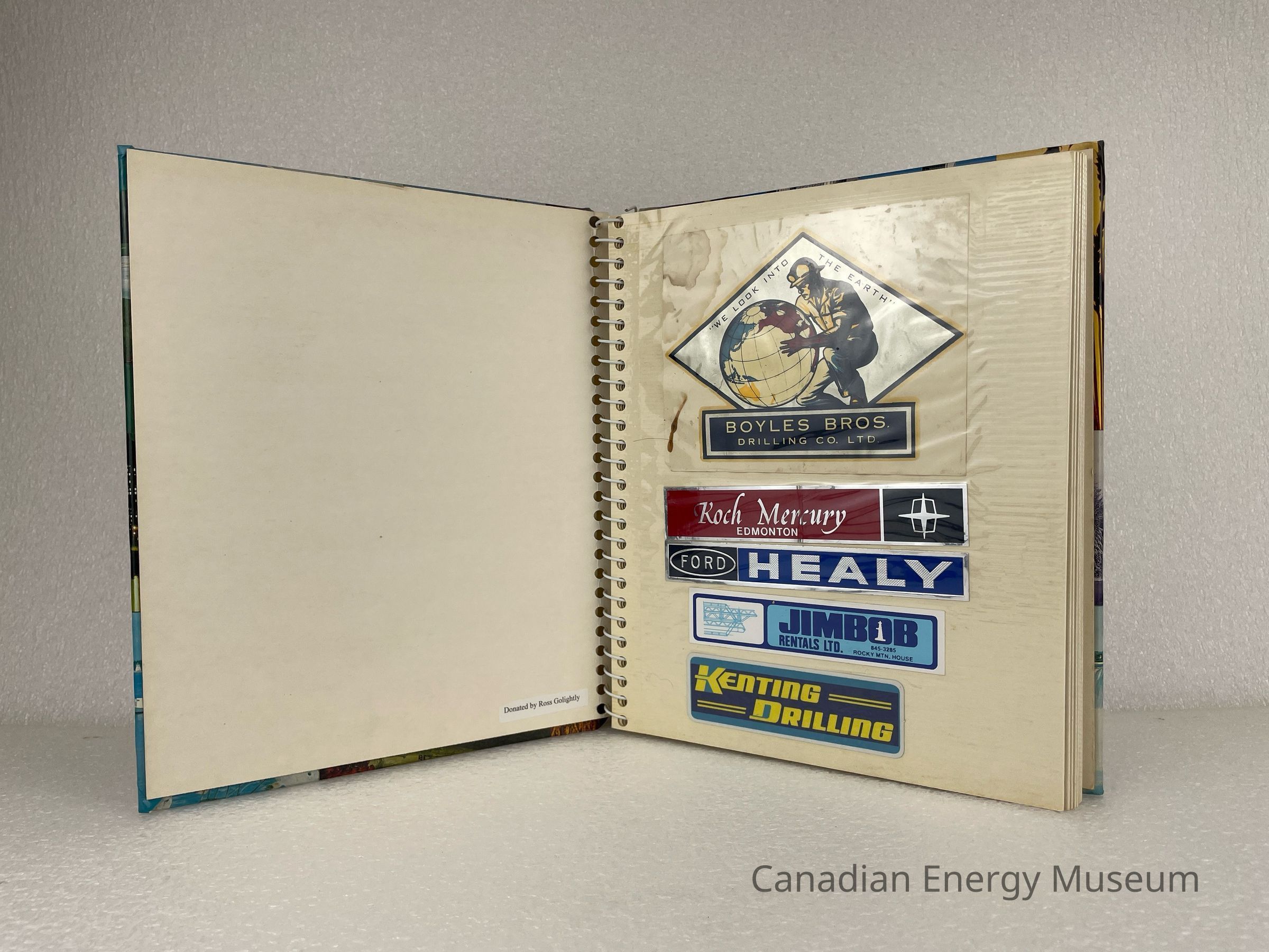 A photo album of assorted stickers. The cover features multiple photos of various places and things, with all ten crests of the Canadian provinces. A piece of masking tape with text written in Sharpie reading, "STICKERS", is placed at the top of the spine. 13 sheets are held within a white metal coiled binding. The inside cover displays a white label with black text reading, "Donated by Ross Golightly".Collection