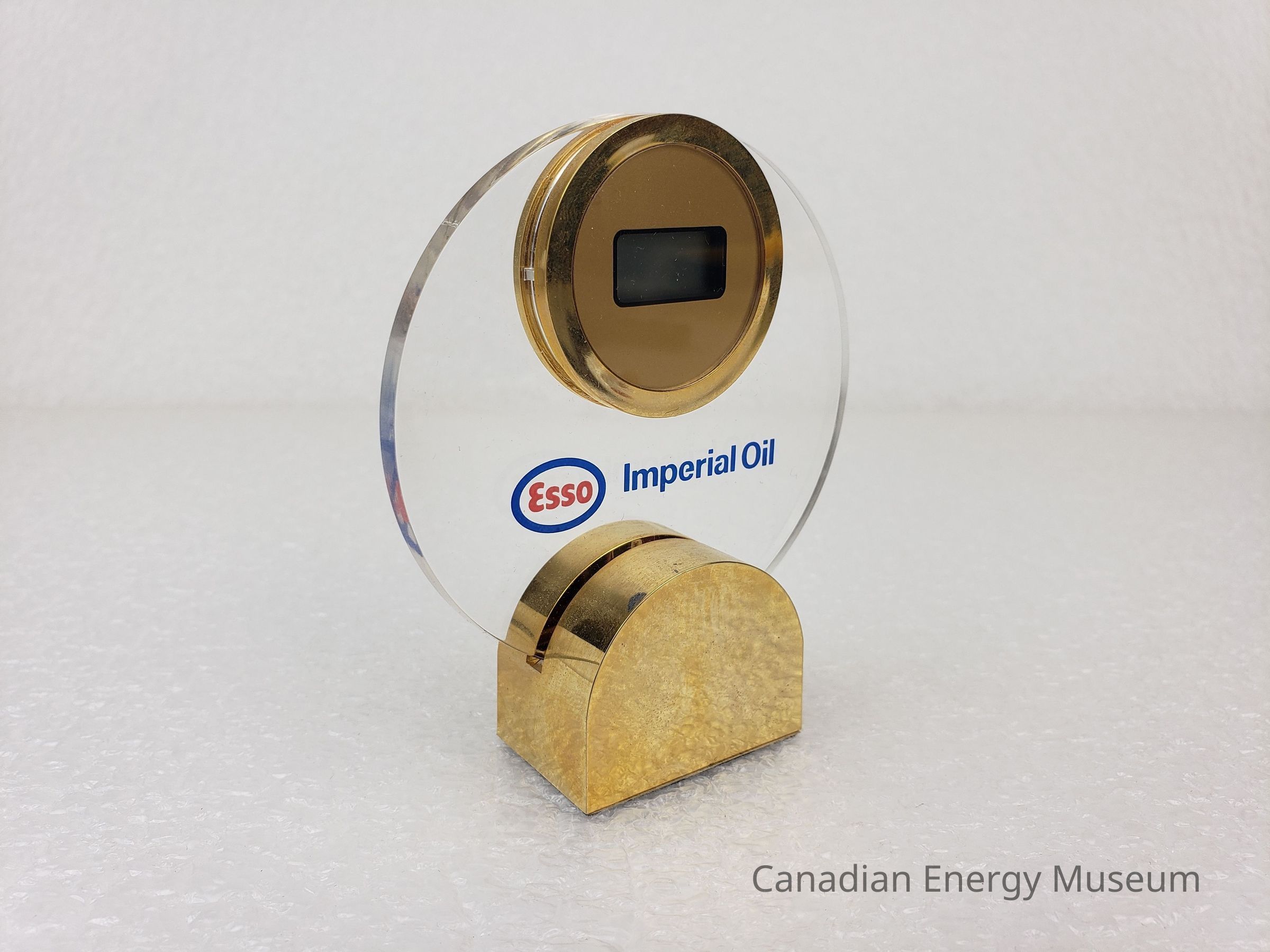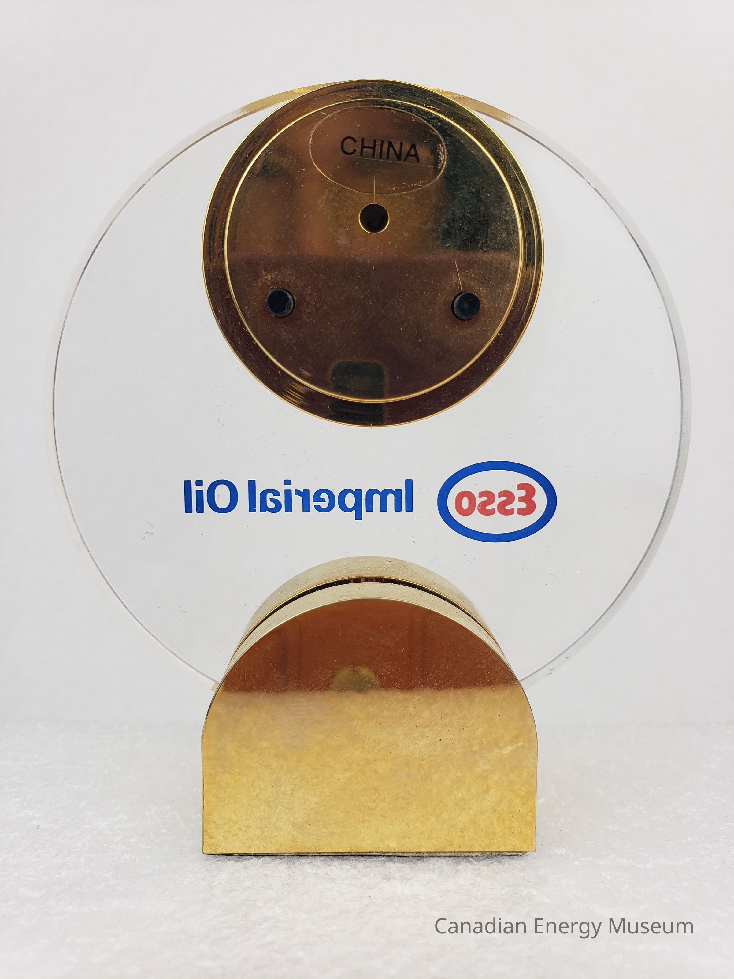 Description: A small desk clock, with a clear plastic centre disk bearing branding, an arch-shaped gold-coloured plastic base, and a gold-coloured plastic digital display surround. The branding is the oval text ESSO logo in blue and red to the lower-left of the clear disk, and "Imperial Oil" in blue to the lower-right.