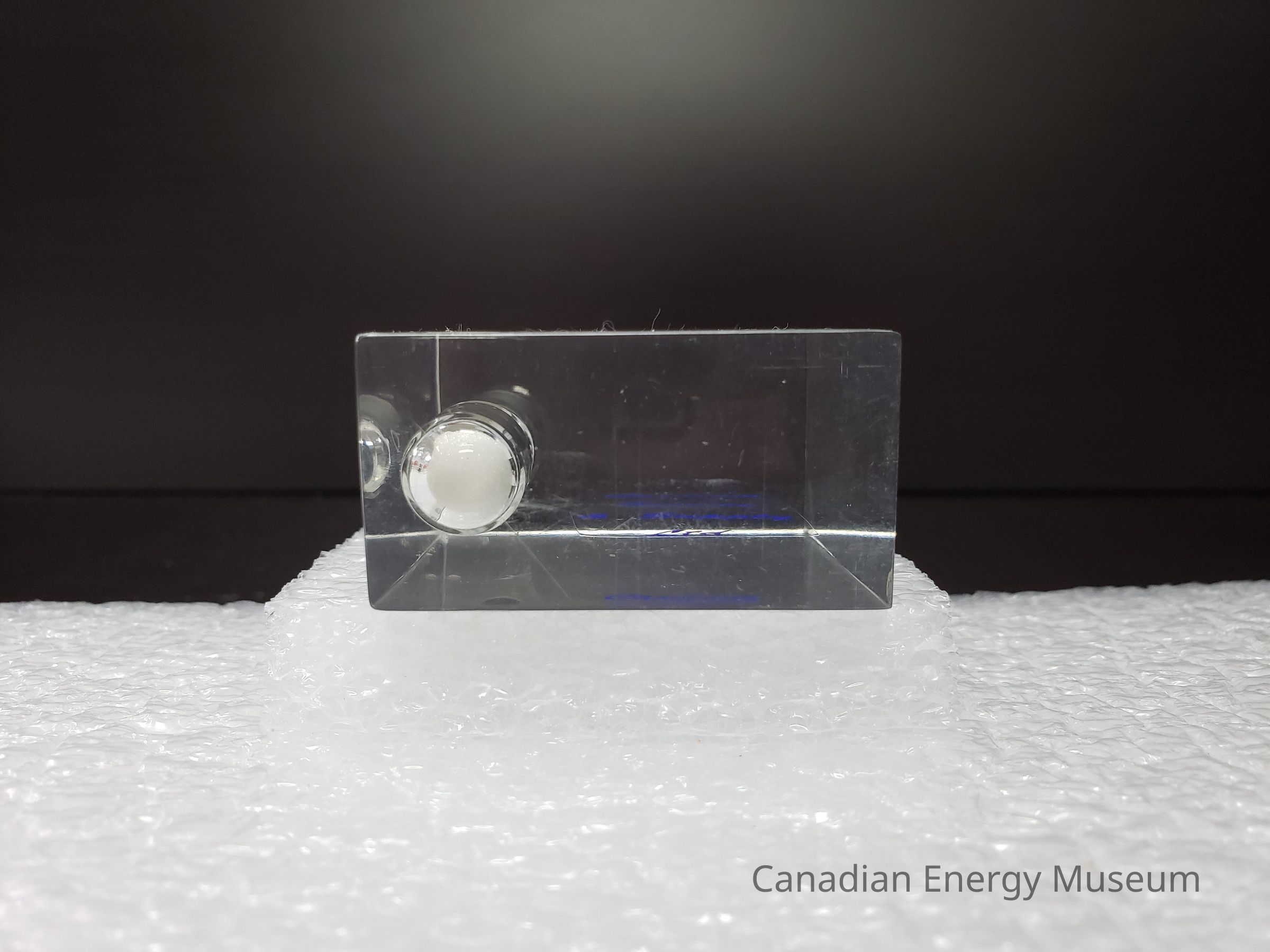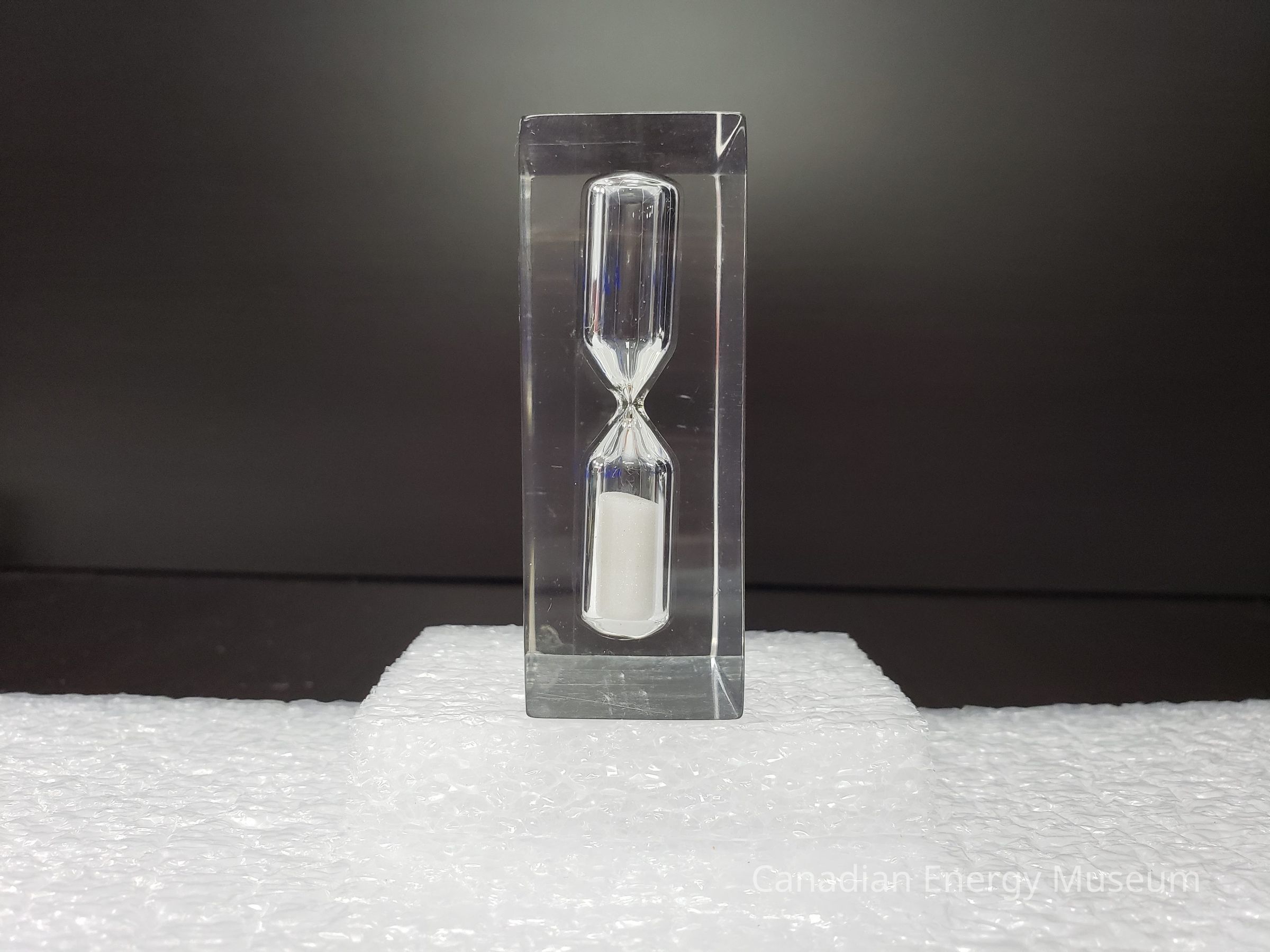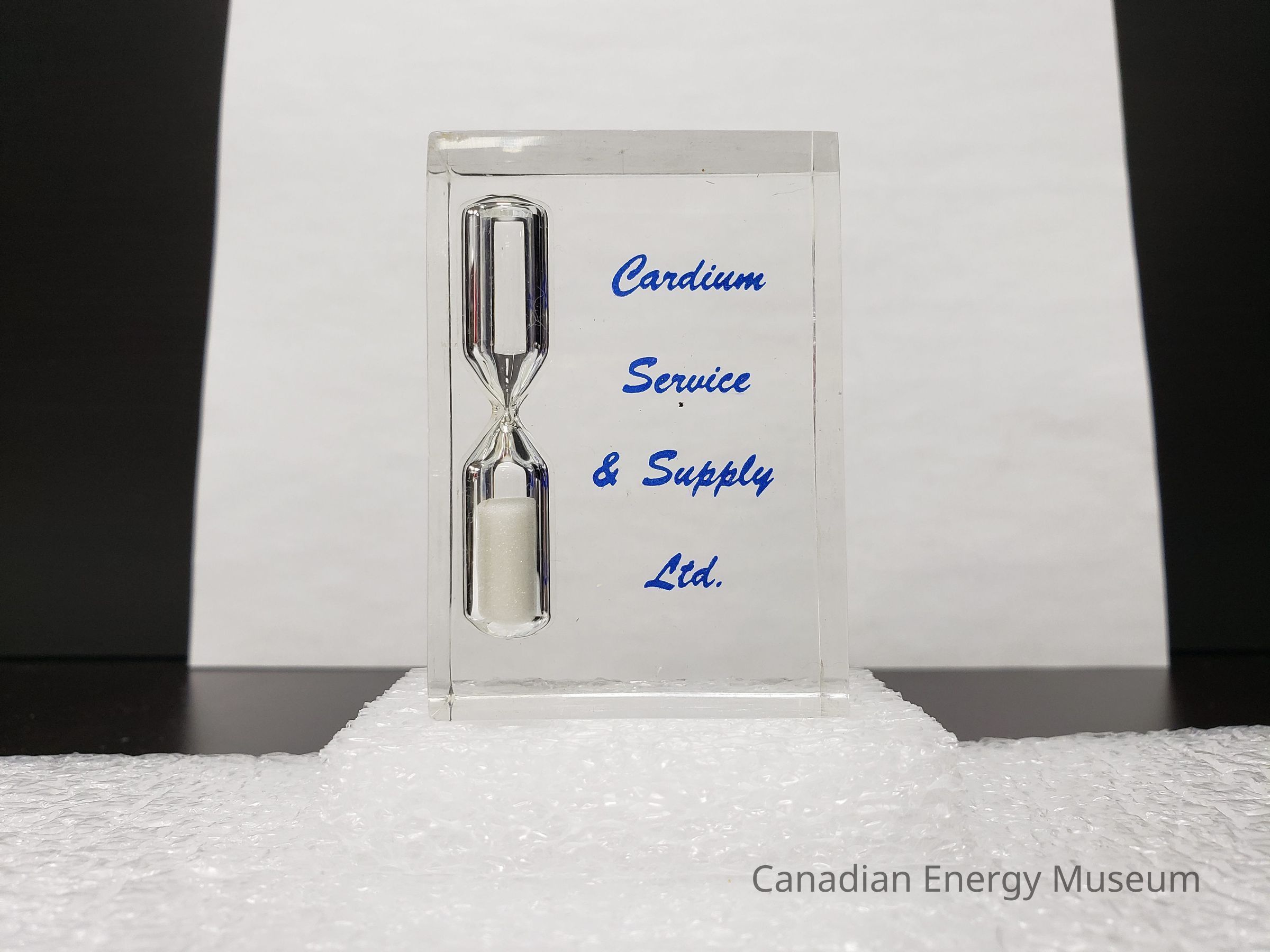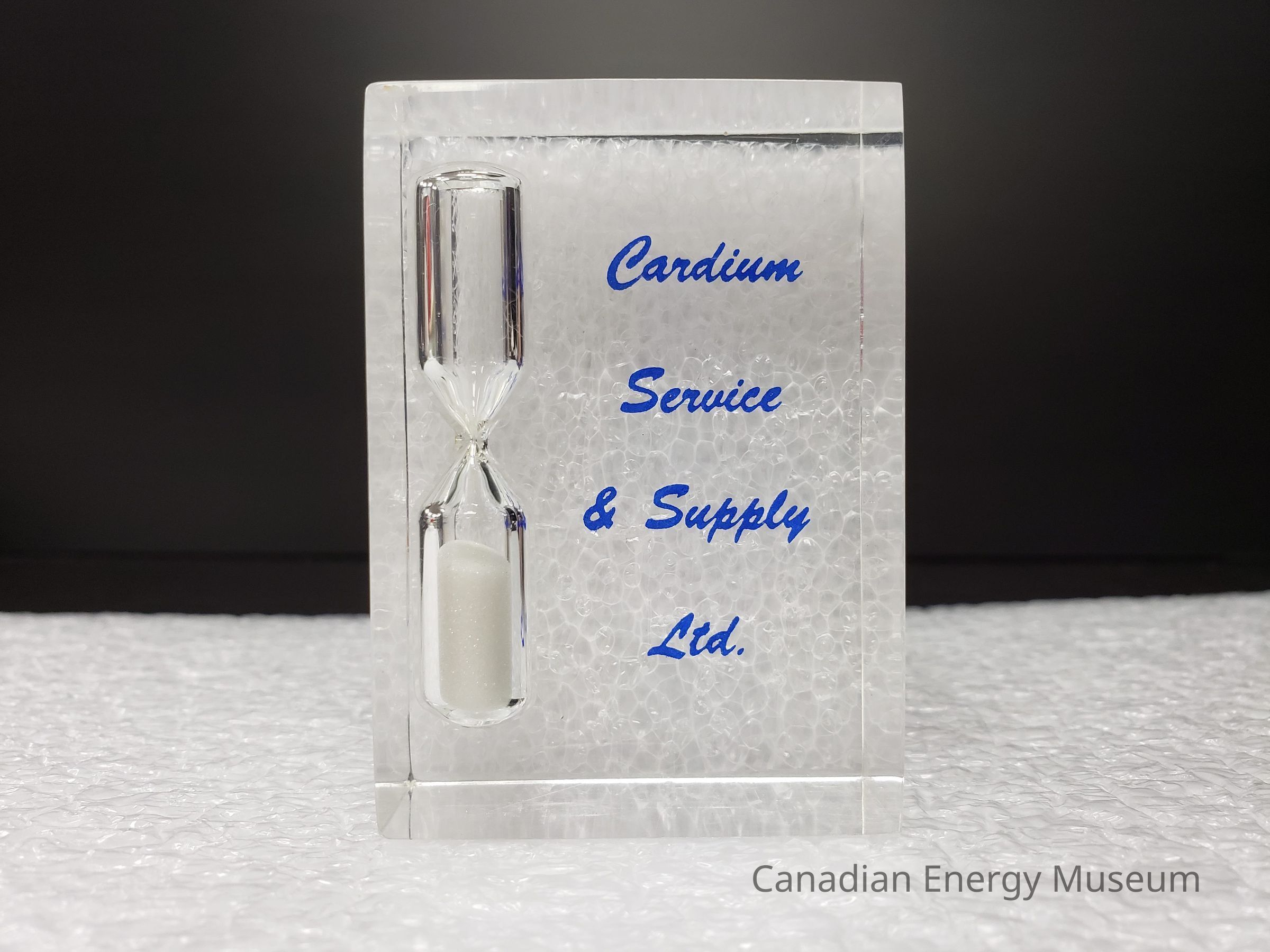 Features: A small block of clear acrylic/resin, with a built-in hourglass (clear with white sand) to the left. On the front-facing surface is printed in blue cursive font "Cardium Service & Supply Ltd.".Collection