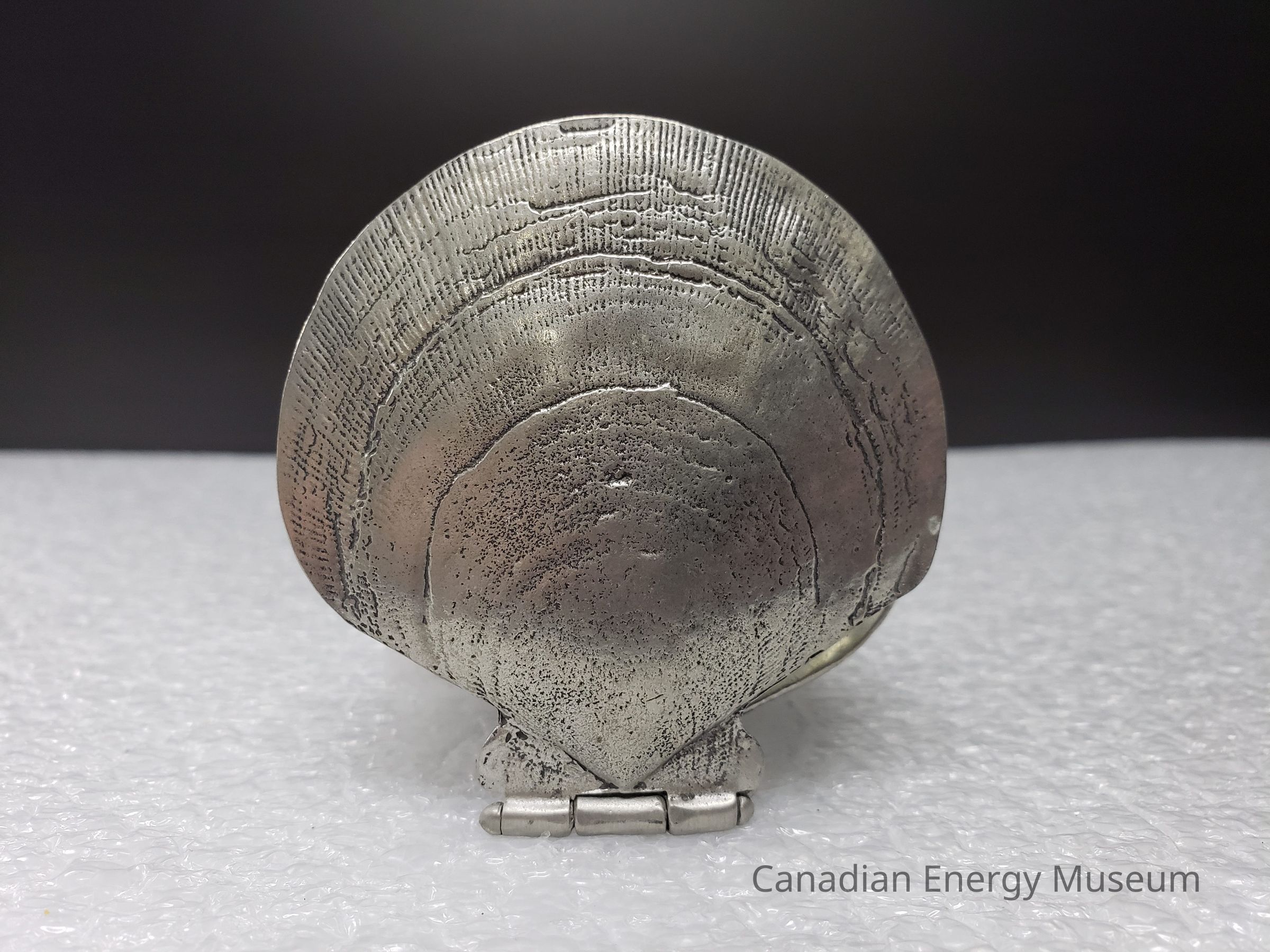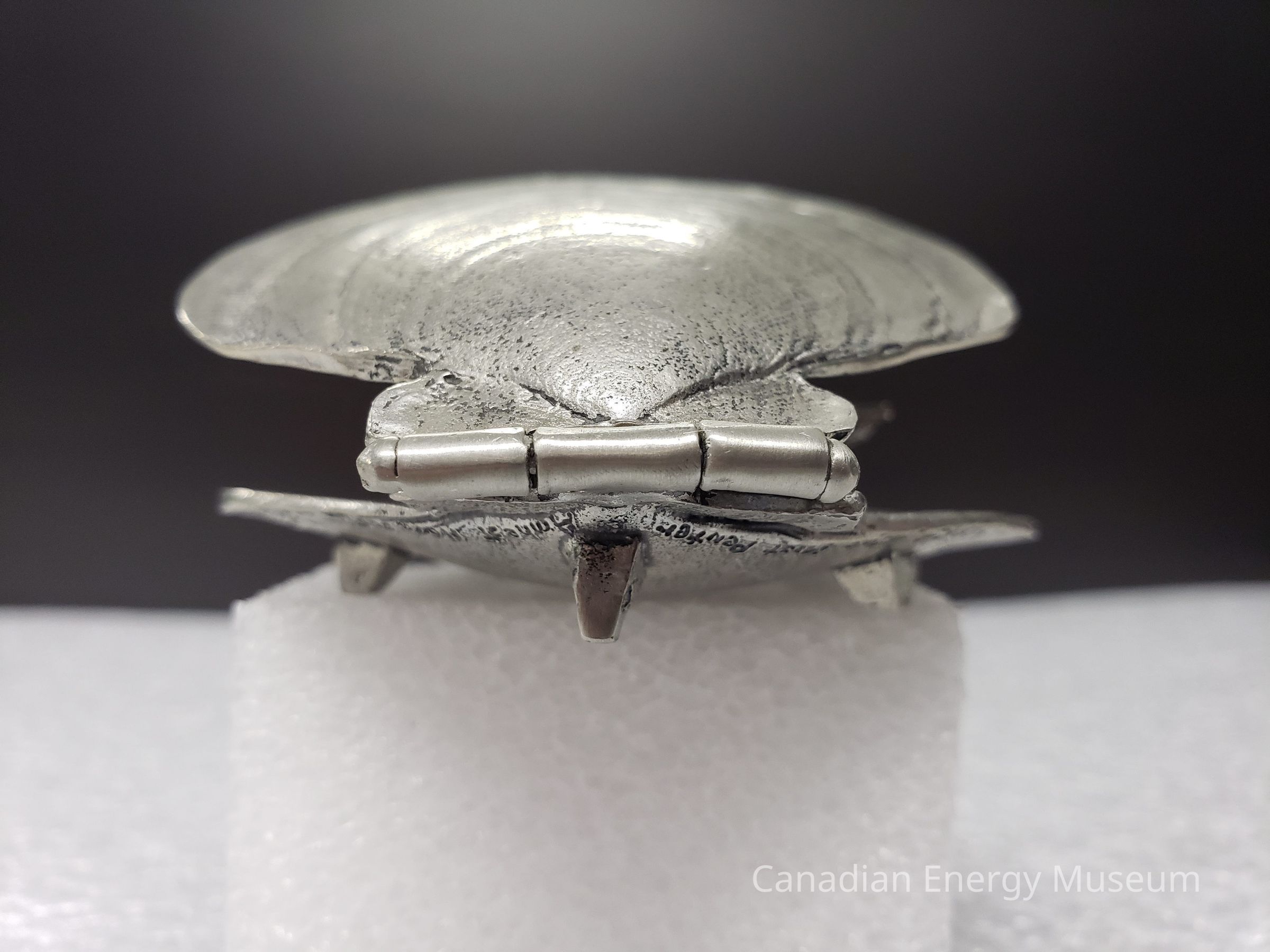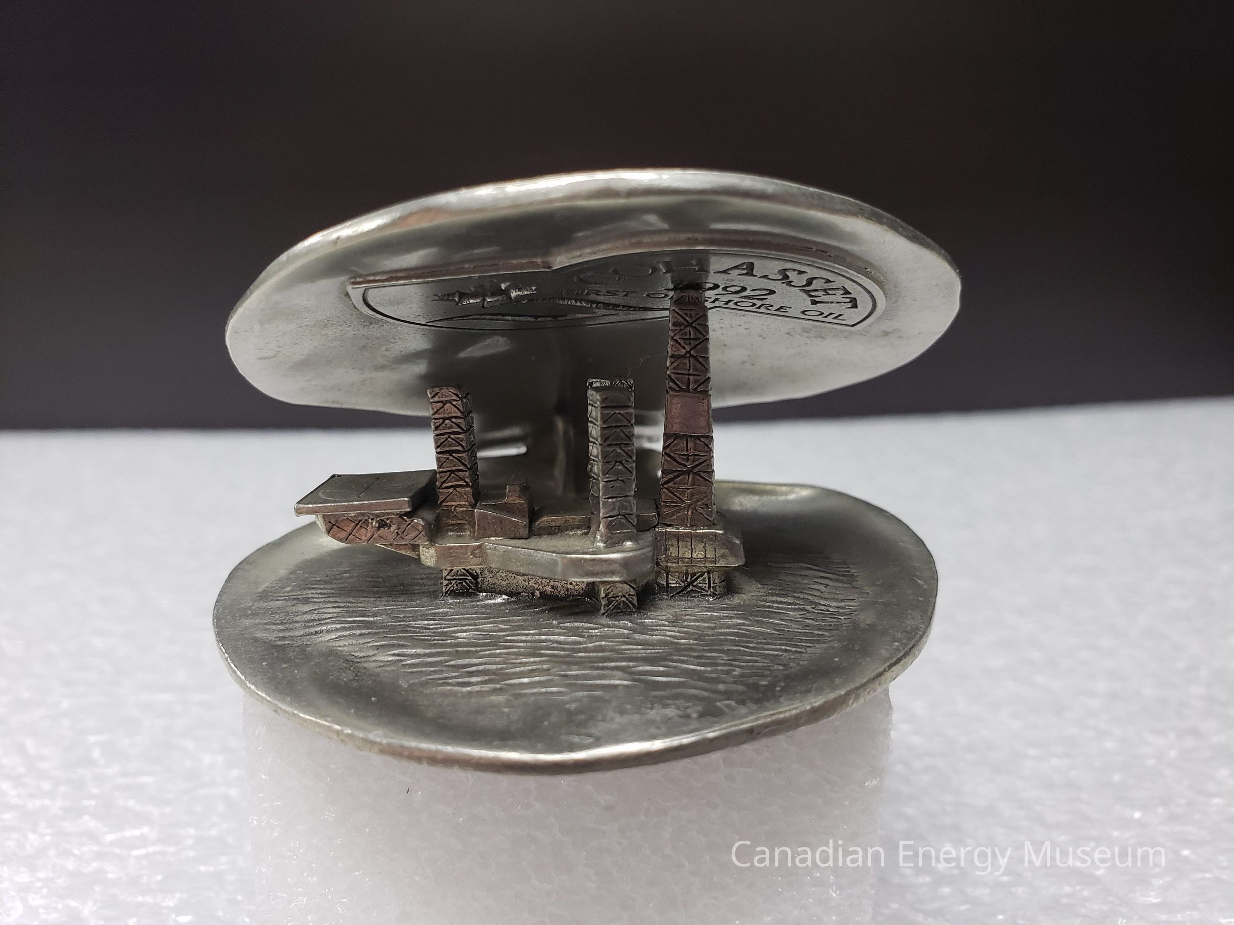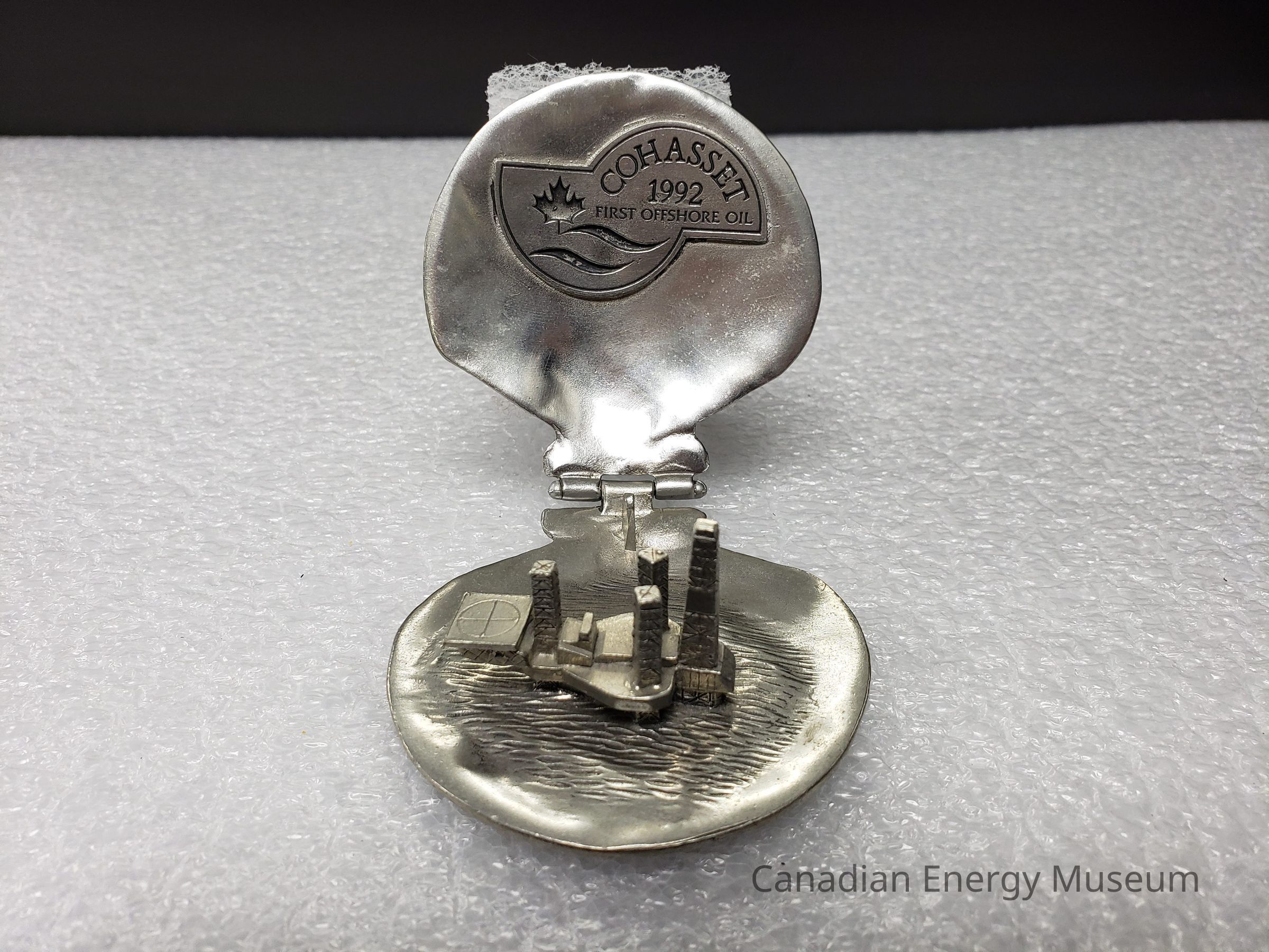 Features: A metal (potentially pewter) cast model of the Cohassett offshore oil rig, positioned within a hinged clamshell. Intended as ornamentation for a desk or shelf. The exterior of the shell is molded to imitate a real clamshell's ridges, both top and bottom. The base also has three small square feet the piece rests upon. When closed, the lid rests upon the top of the model of the rig. When opened, the top can be rotated back to roughly 90-degrees from the base. On the interior of the shell top is the shape of two half-circles overlapping in the upper-centre, on which is the text: "COHASSETT; 1992; FIRST OFFSHORE OIL", with a maple leaf and two wave lines to the lower-left. On the interior of the shell base is a 3D model of the Cohasset offshore oil rig, with textures beneath to simulate water.Collection
