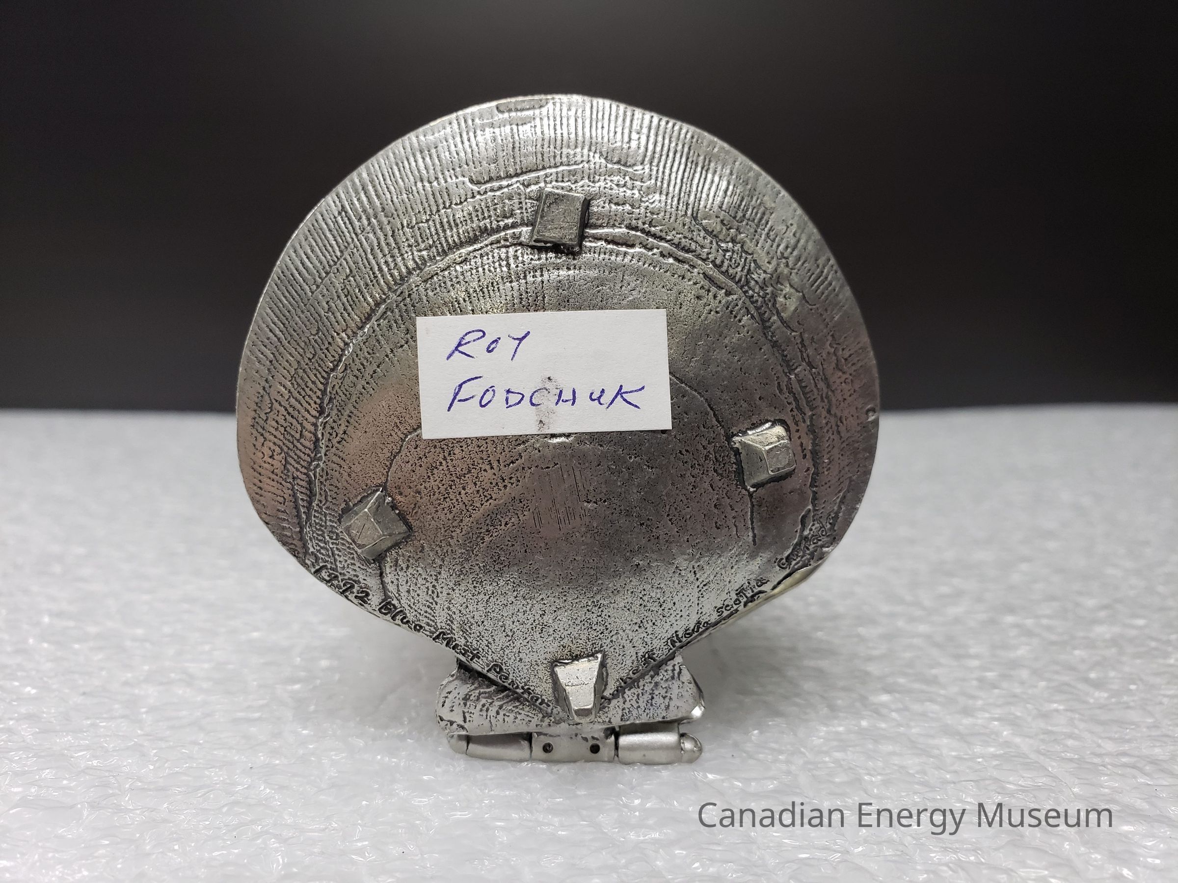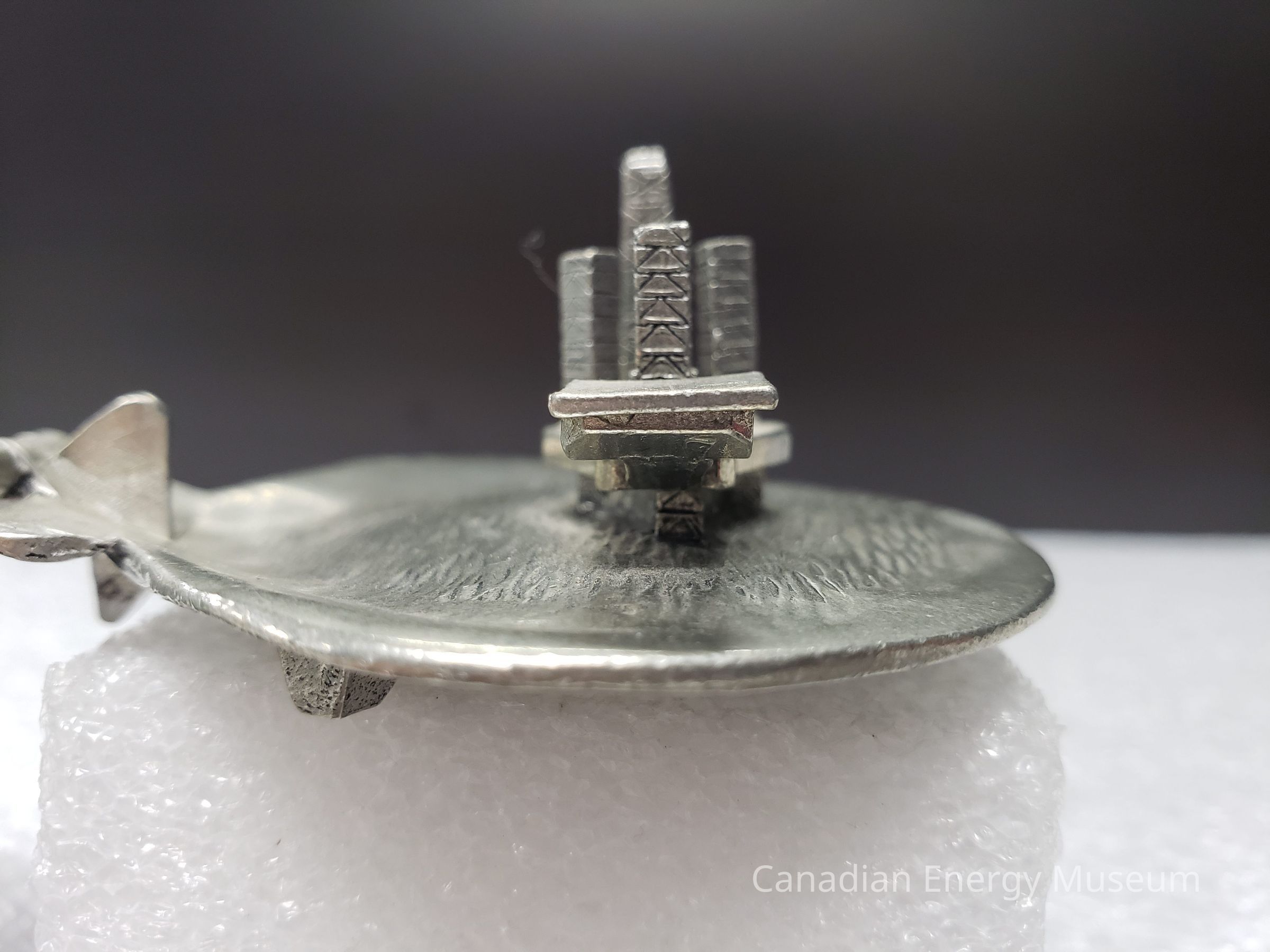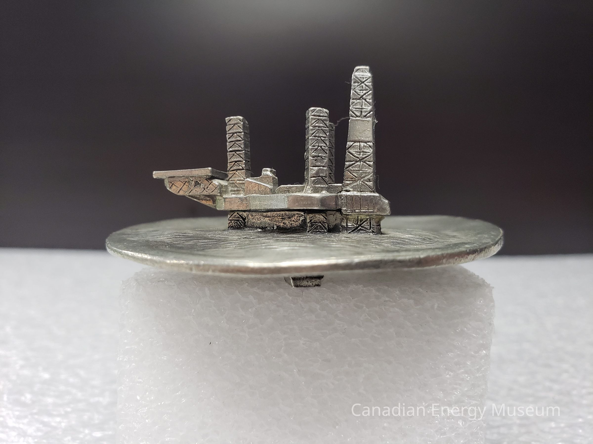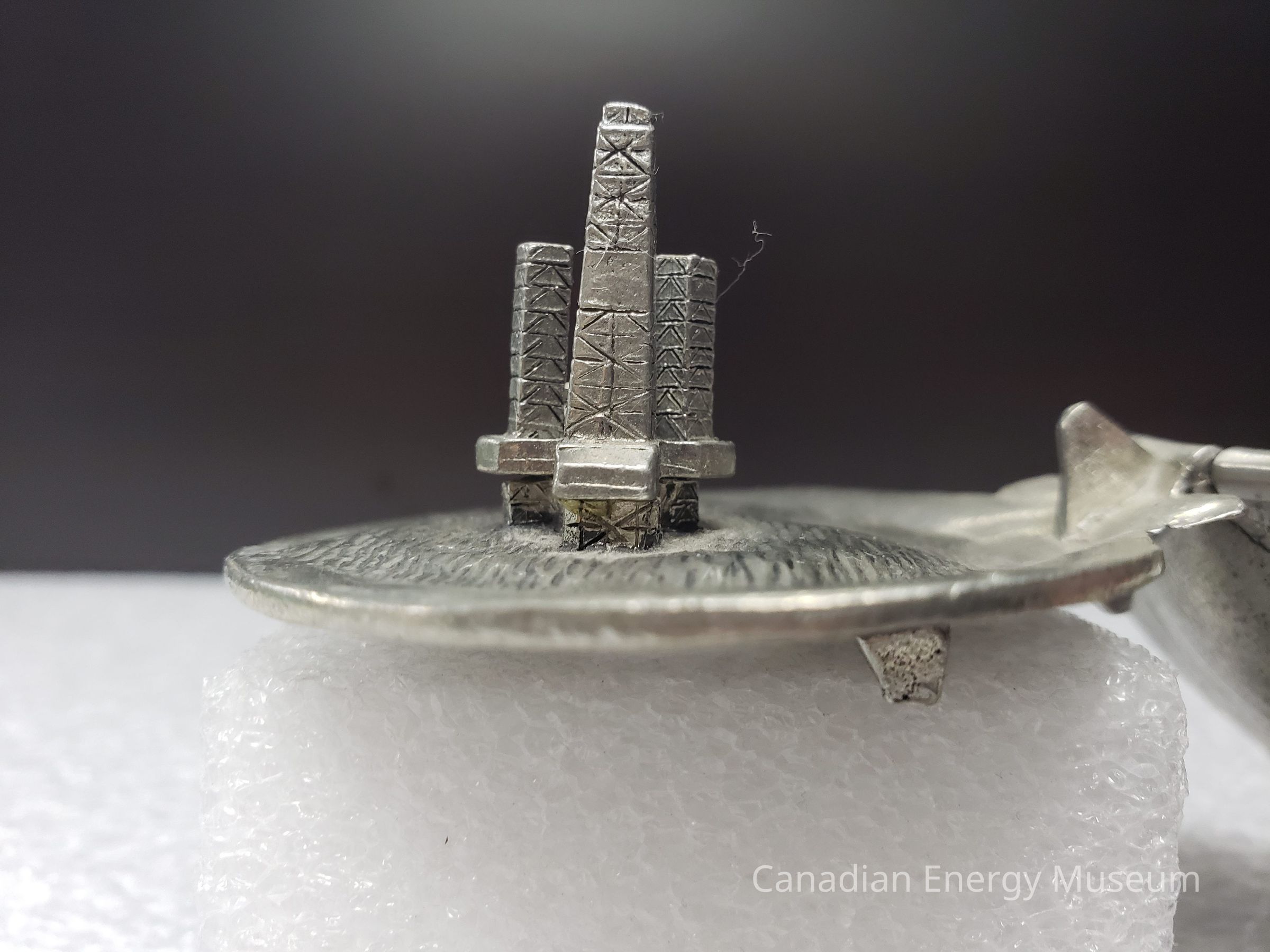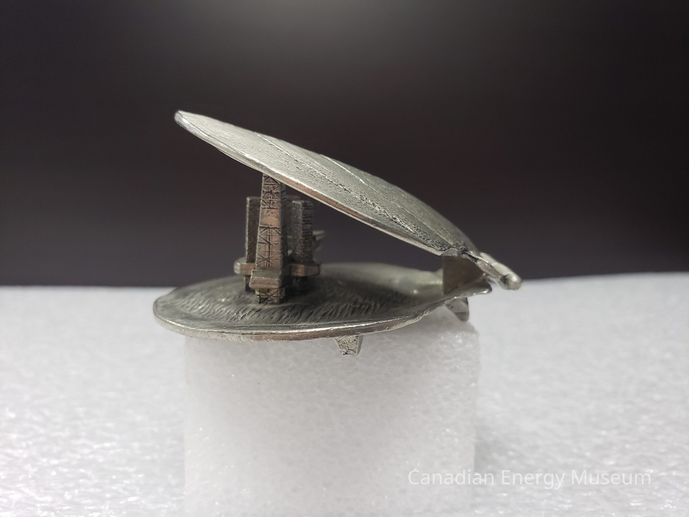Features: A metal (potentially pewter) cast model of the Cohassett offshore oil rig, positioned within a hinged clamshell. Intended as ornamentation for a desk or shelf. The exterior of the shell is molded to imitate a real clamshell's ridges, both top and bottom. The base also has three small square feet the piece rests upon. When closed, the lid rests upon the top of the model of the rig. When opened, the top can be rotated back to roughly 90-degrees from the base. On the interior of the shell top is the shape of two half-circles overlapping in the upper-centre, on which is the text: "COHASSETT; 1992; FIRST OFFSHORE OIL", with a maple leaf and two wave lines to the lower-left. On the interior of the shell base is a 3D model of the Cohasset offshore oil rig, with textures beneath to simulate water.Collection