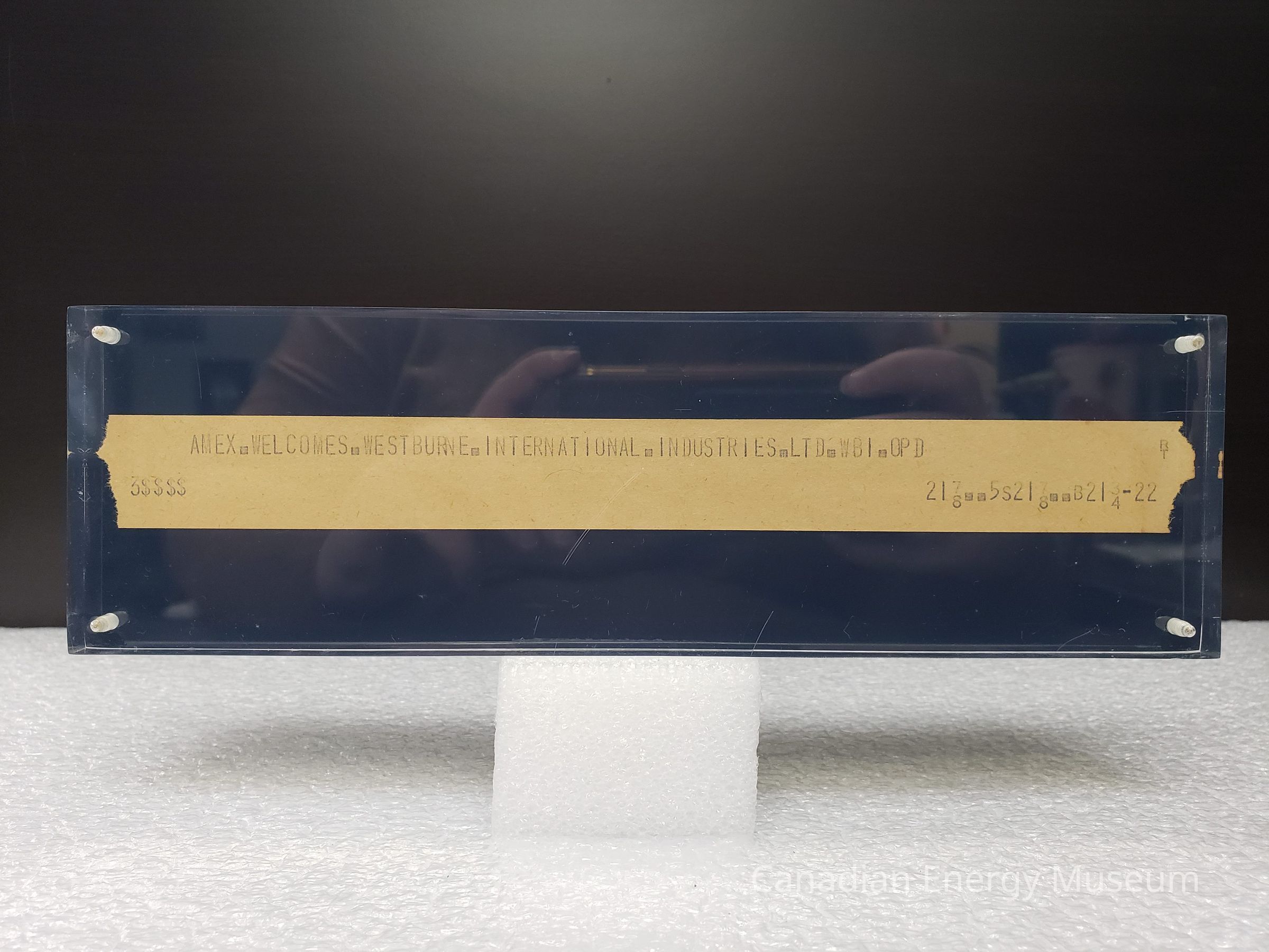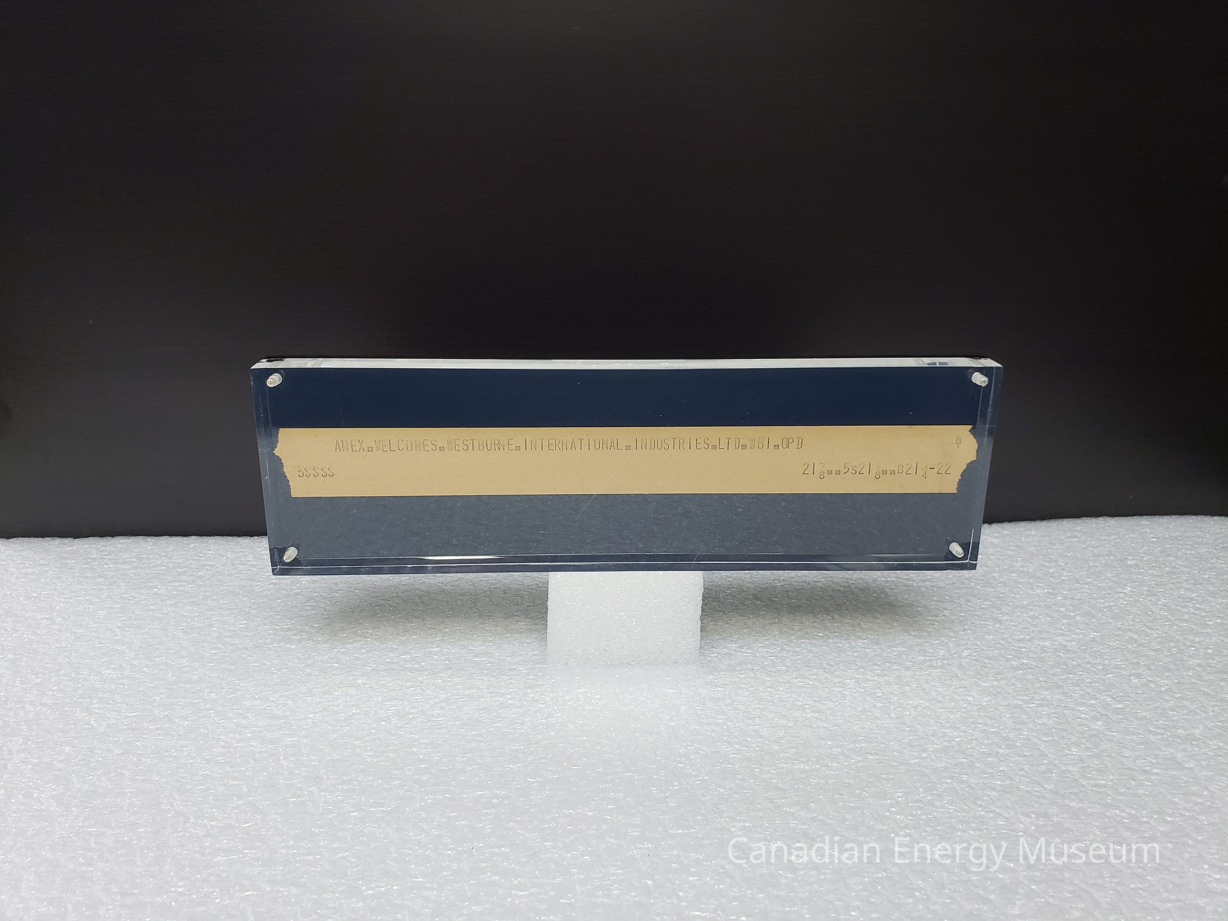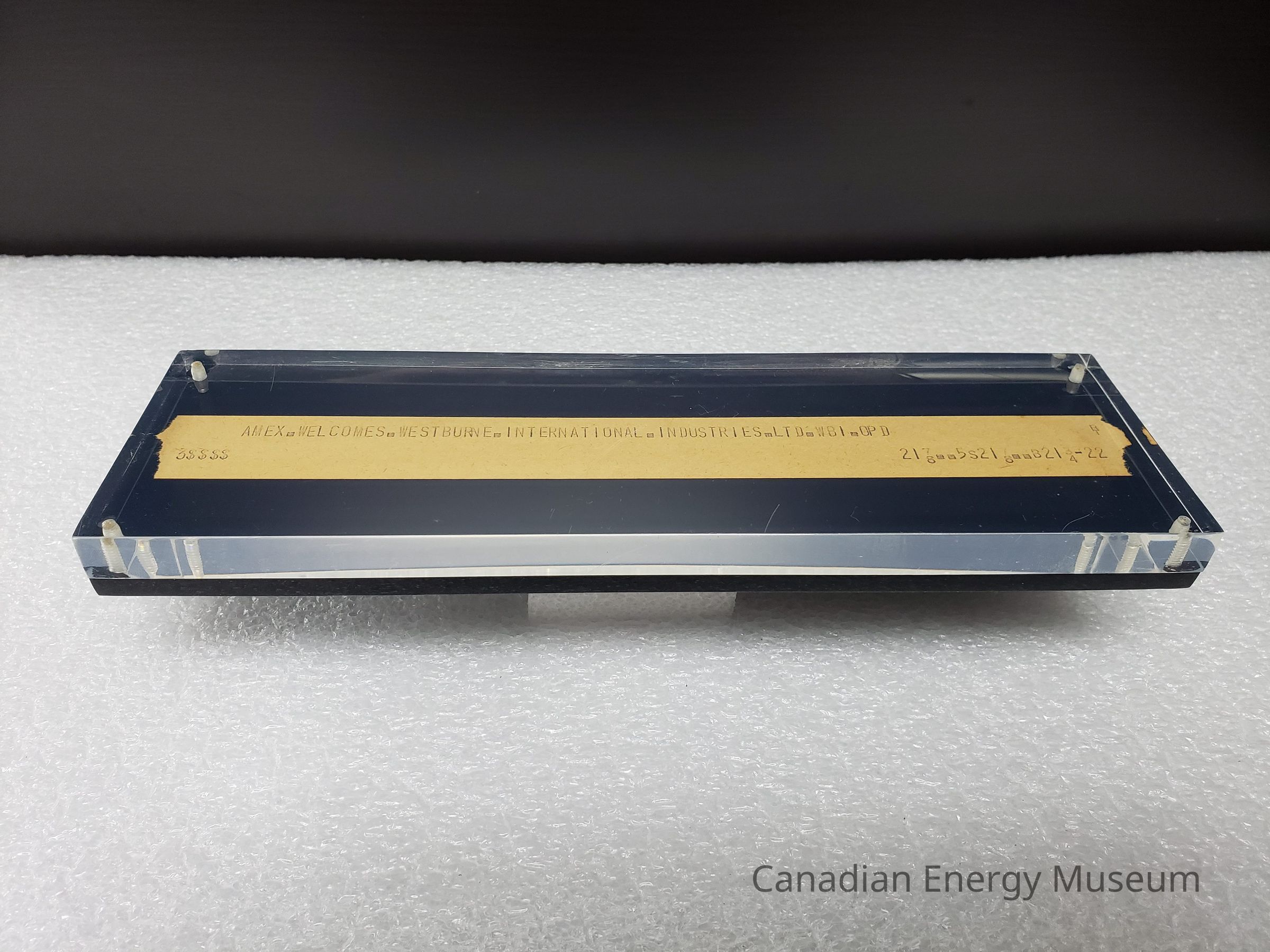Features: A standing block made up of two pieces of acrylic (one clear, one black), between which is secured a strip of ticker tape paper bearing the text "AMEX.WELCOMES.WESTBURNE.INTERNATIONAL.INDUSTRIES.LTD.WBI.OPD". The block is secured with four plastic screws in each corner.Collection