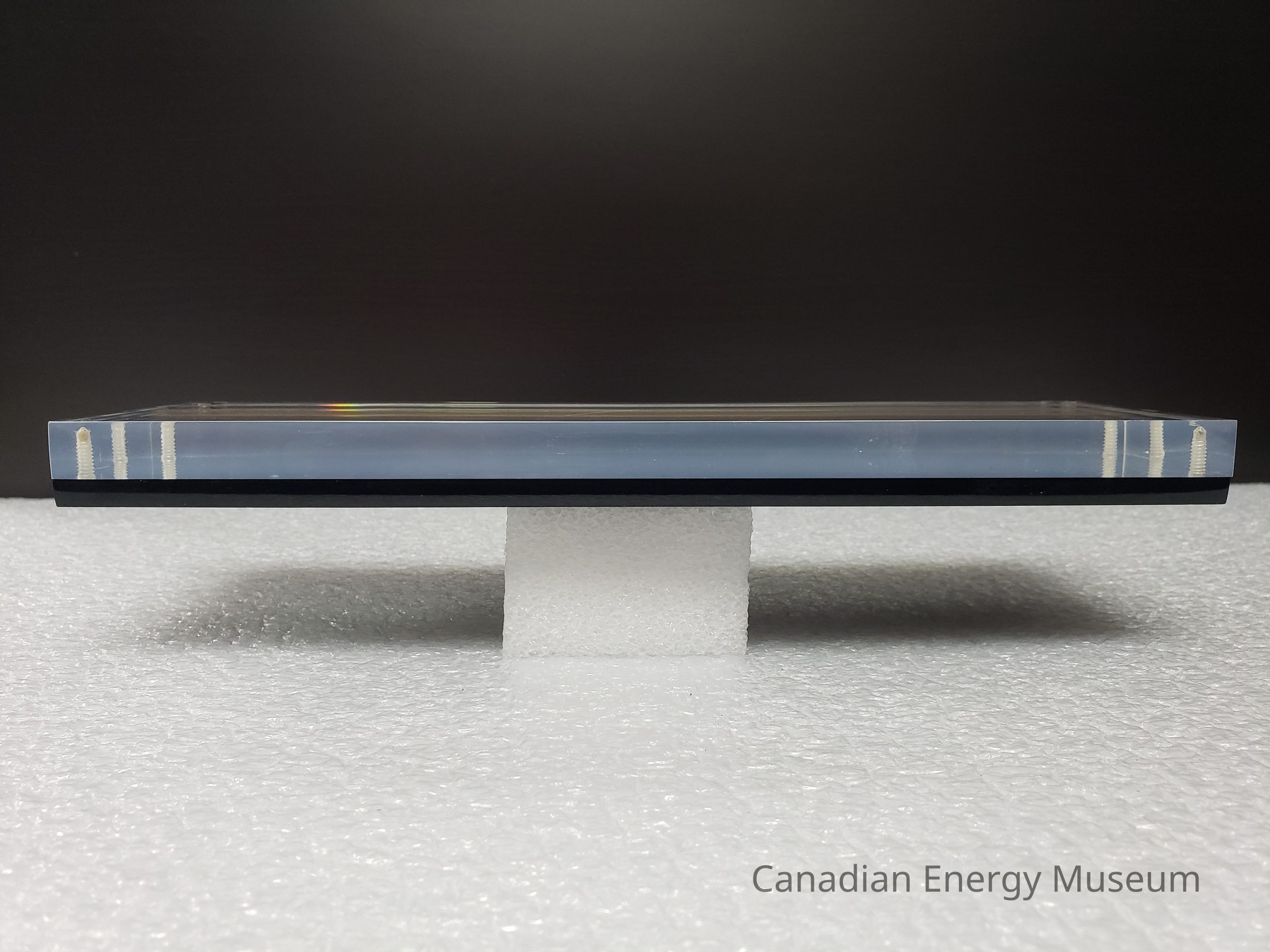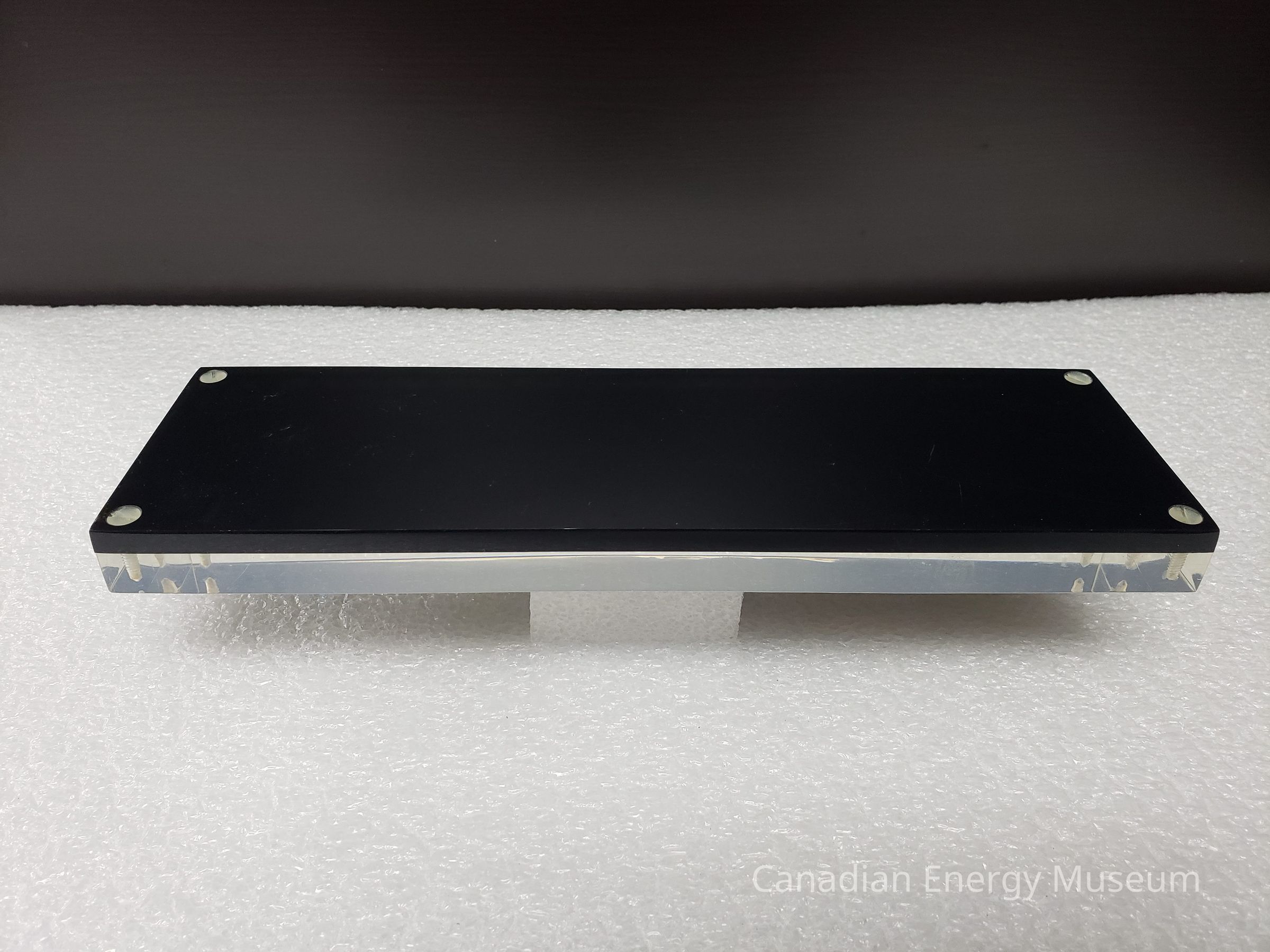 The surface of the acrylic is moderately scratched. Notable scratches include two squiggly scratches and a vertical scratch in the upper-left front corner; a long diagonal scratch in the centre of the front; two small diagonal scratches in the left-of centre at the bottom; a diagonal scratch in the right-of-centre at the bottom; a wavy diagonal scratch in the bottom-right corner; and horizontal scratch in the upper-right side.Materials
