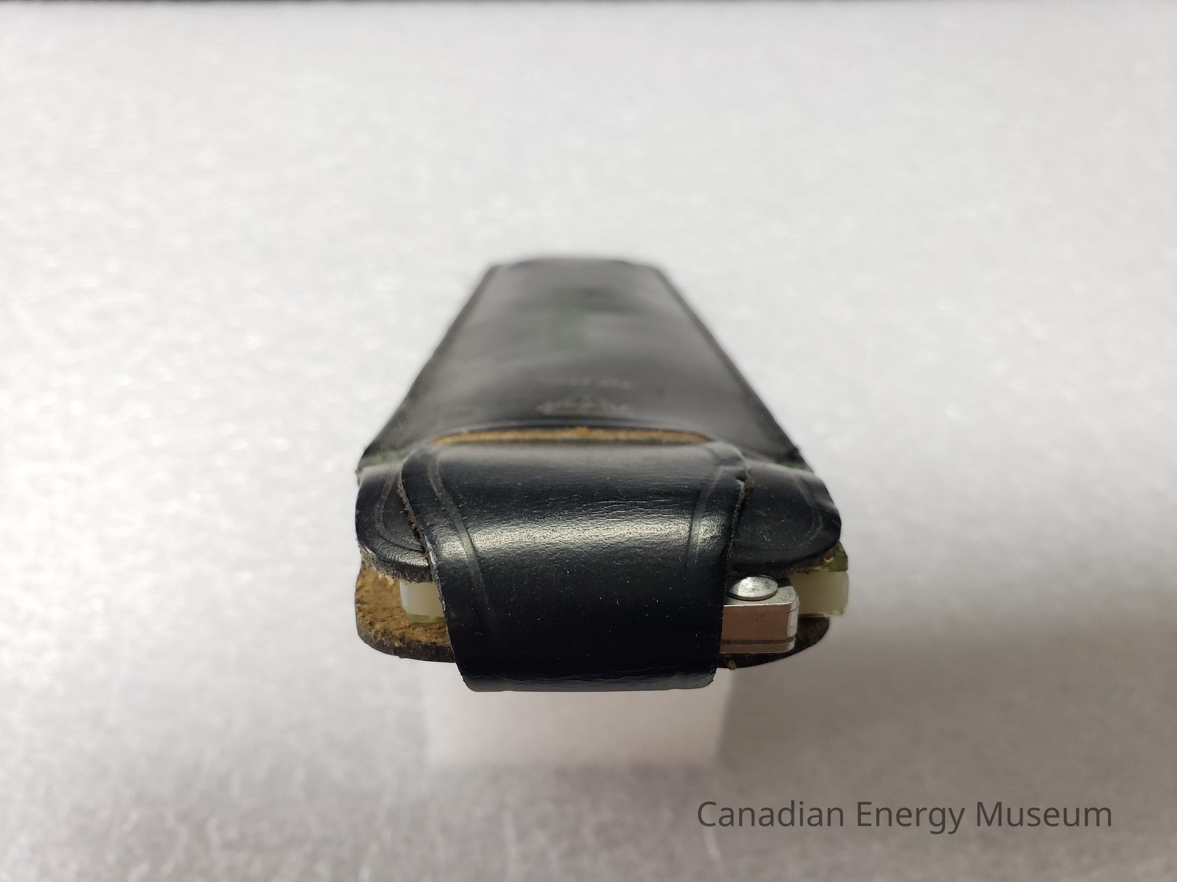 Leather Cover: A black-coloured leather case, custom-made for the slide rule, and has been customised with the name "A. KOWALCHUK" in the middle of the front side. To the right of the name, below the opening is also imprinted in gold the triangular Pickett logo and "PAT. PEND.". At the opening, there is a flap that secures the slide rule inside. Leather is stitched together, with some pressed detailing around the edge of the opening and flap.Collection