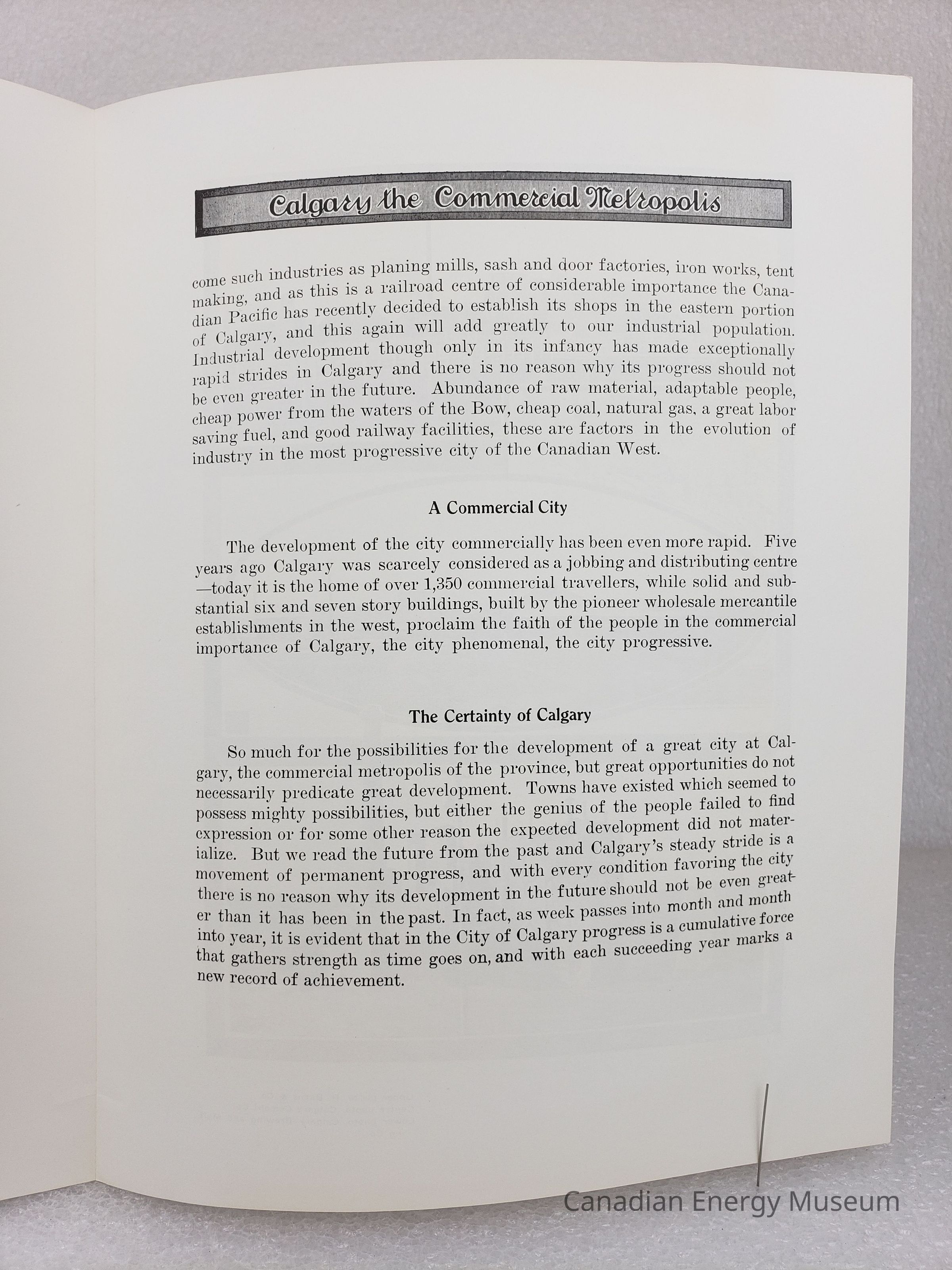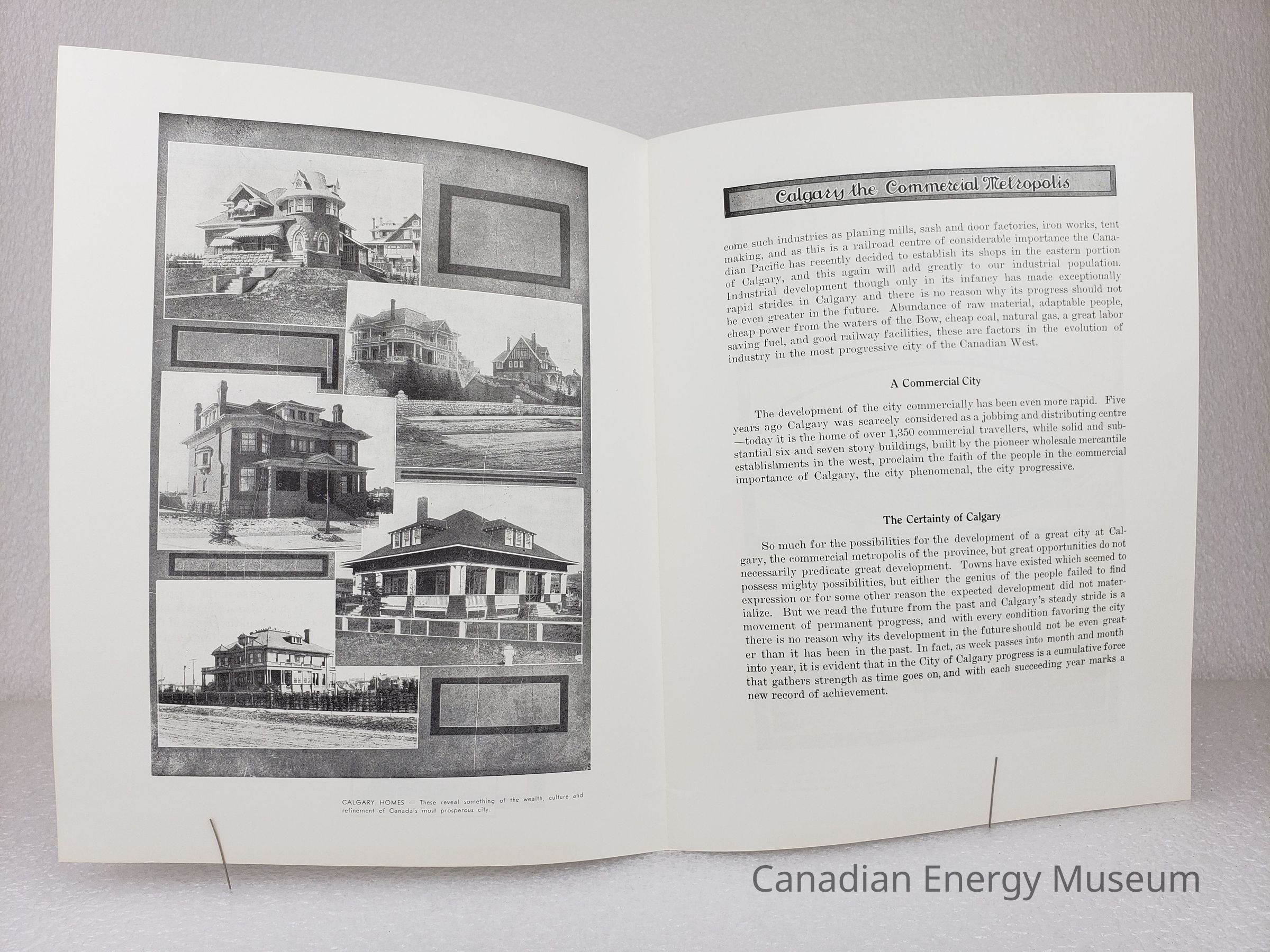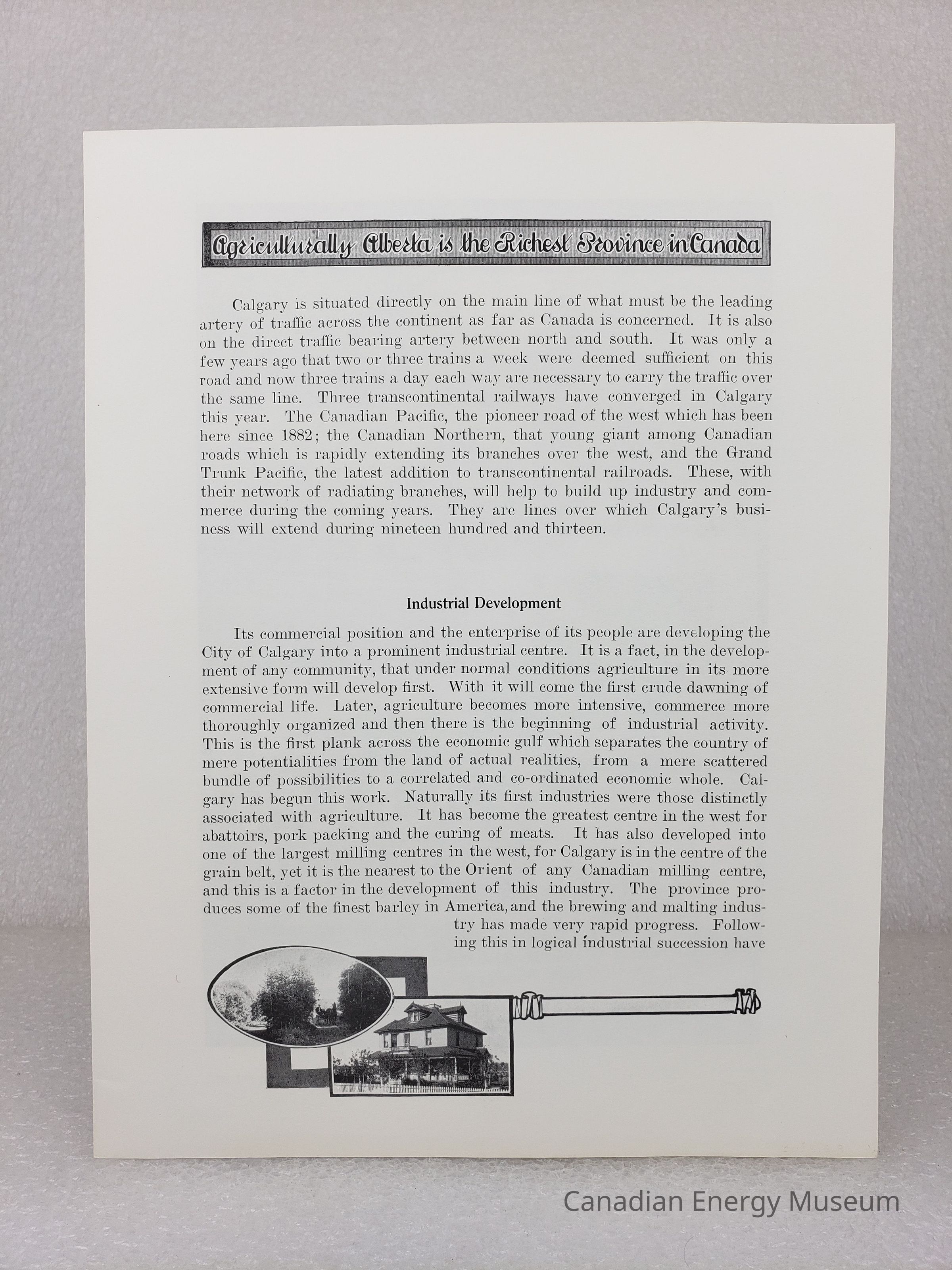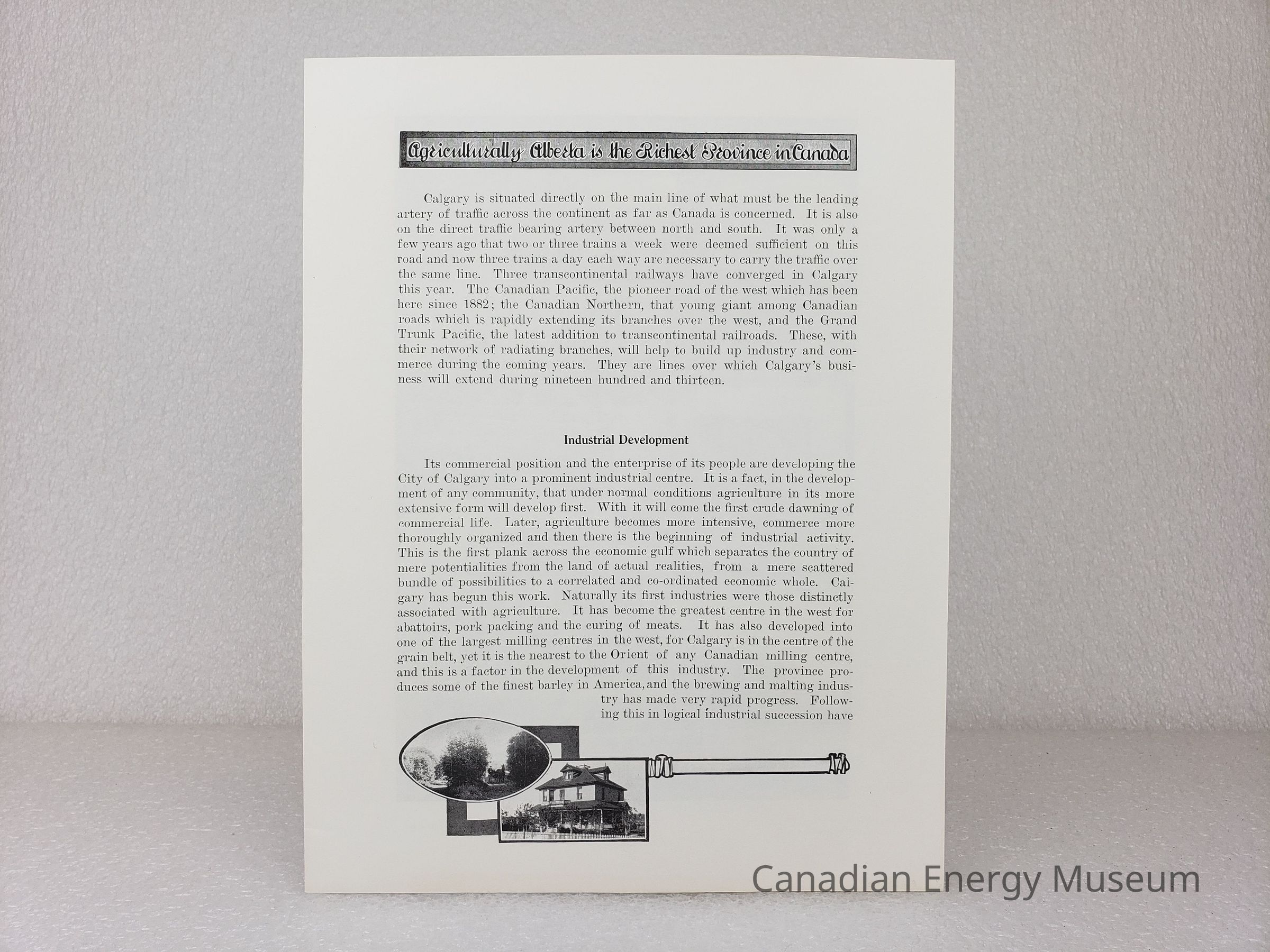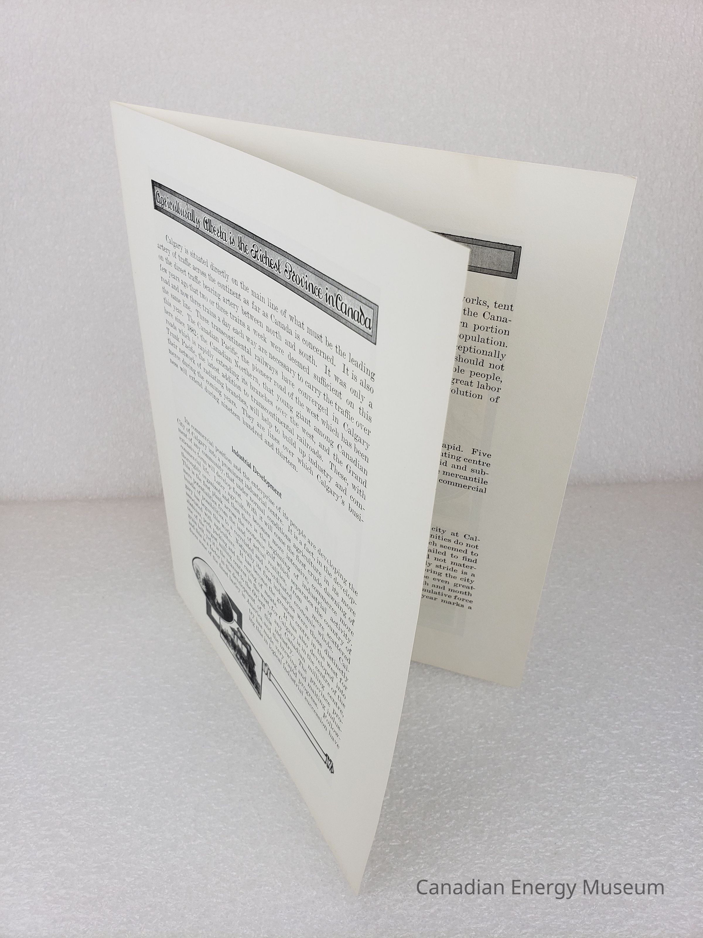 A bi-folded document containing historical information related to Albertan industry, including black and while photographs.
