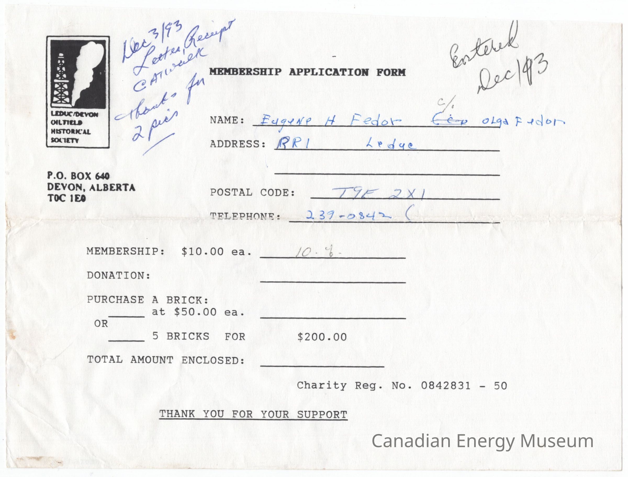 [Document] Eugene H Fedor, Membership Application Form, Leduc/Devon Oilfield Historical Society, December, 1993Entry/Object ID