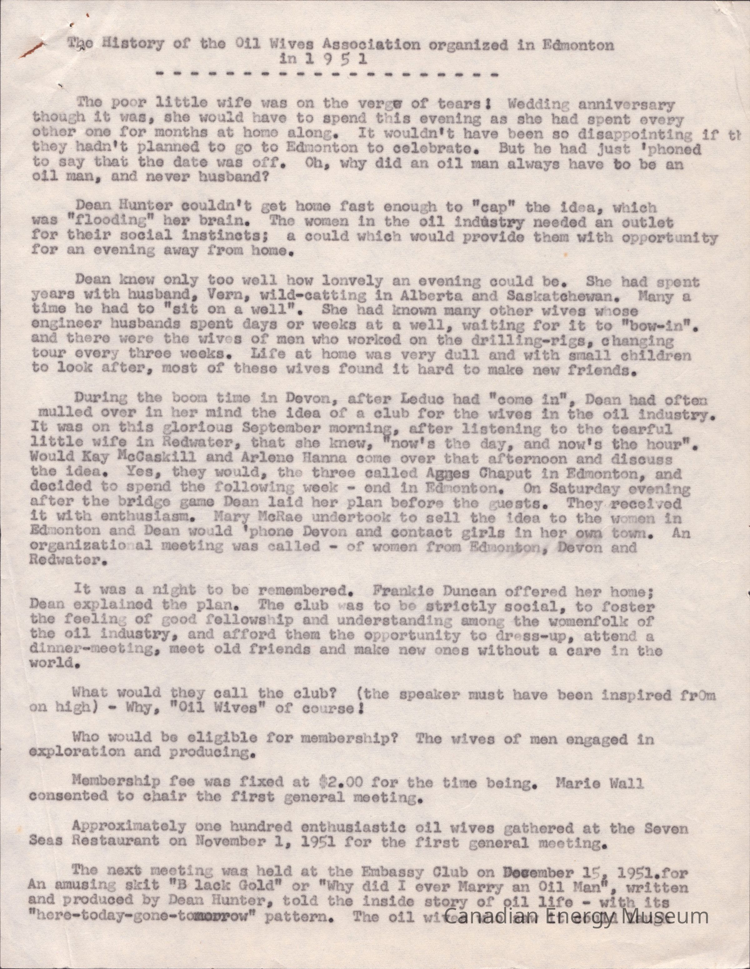 Description: A single sheet of lightly textured paper stock, with what appears to be a duplicate (early Xerox or similar technique) of an original written using a typewriter. The content outlines the history of the founding of the Oil Wives Association in Edmonton in 1951. Page 2 of the document includes a list of charter members: Frankie Duncan, Edmonton; Mary McRae, Edmonton; Grace Hume, Edmonton; Mattie Leberge, Devon; Barbara McCourt, Devon; Arlene Hanna, Redwater; Kay McCaskill, Redwater; Marie Wall, Edmonton; Myrtle Thompson, Edmonton; Mickey Cunningham Bonnet, Devon; Mabel Aird, Devon; Betty Greenwood, Redwater; Dean Hunter, Redwater.Collection