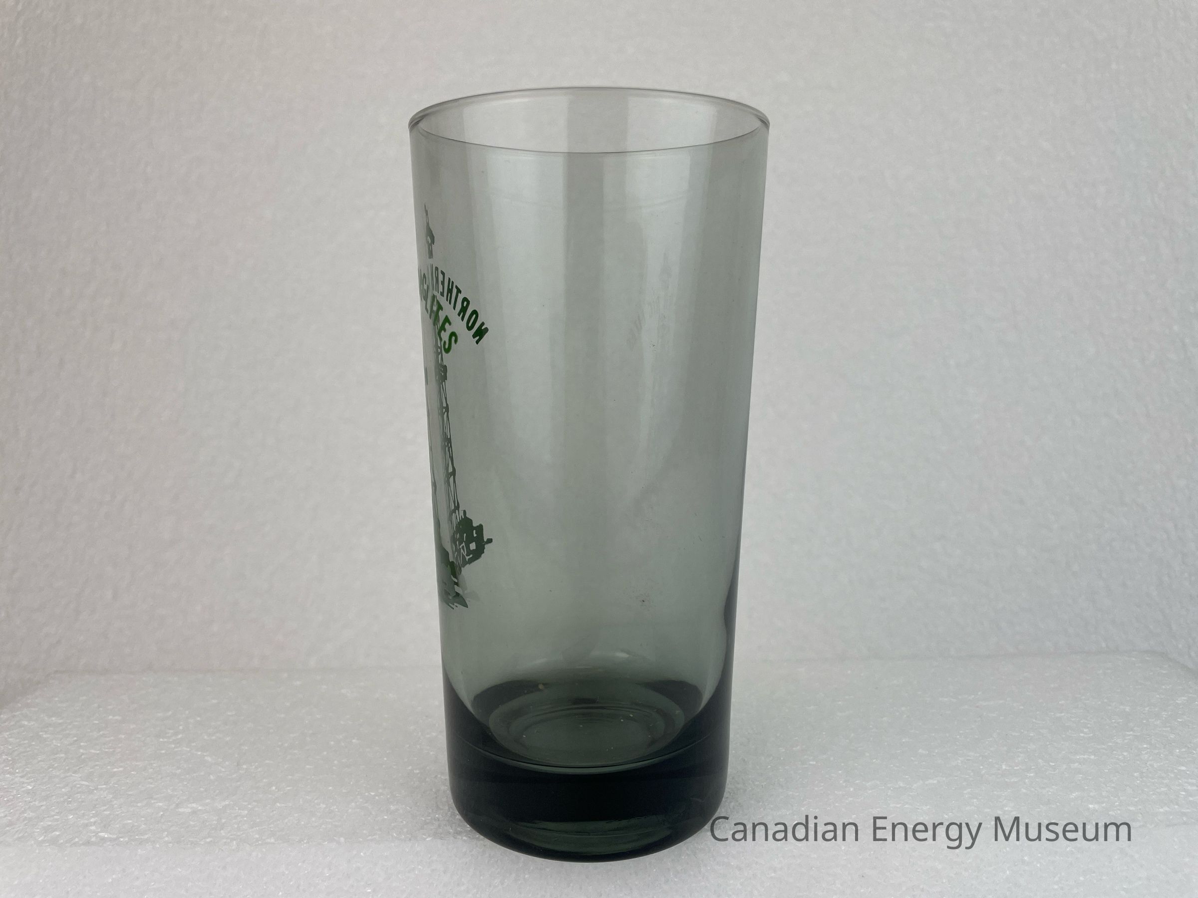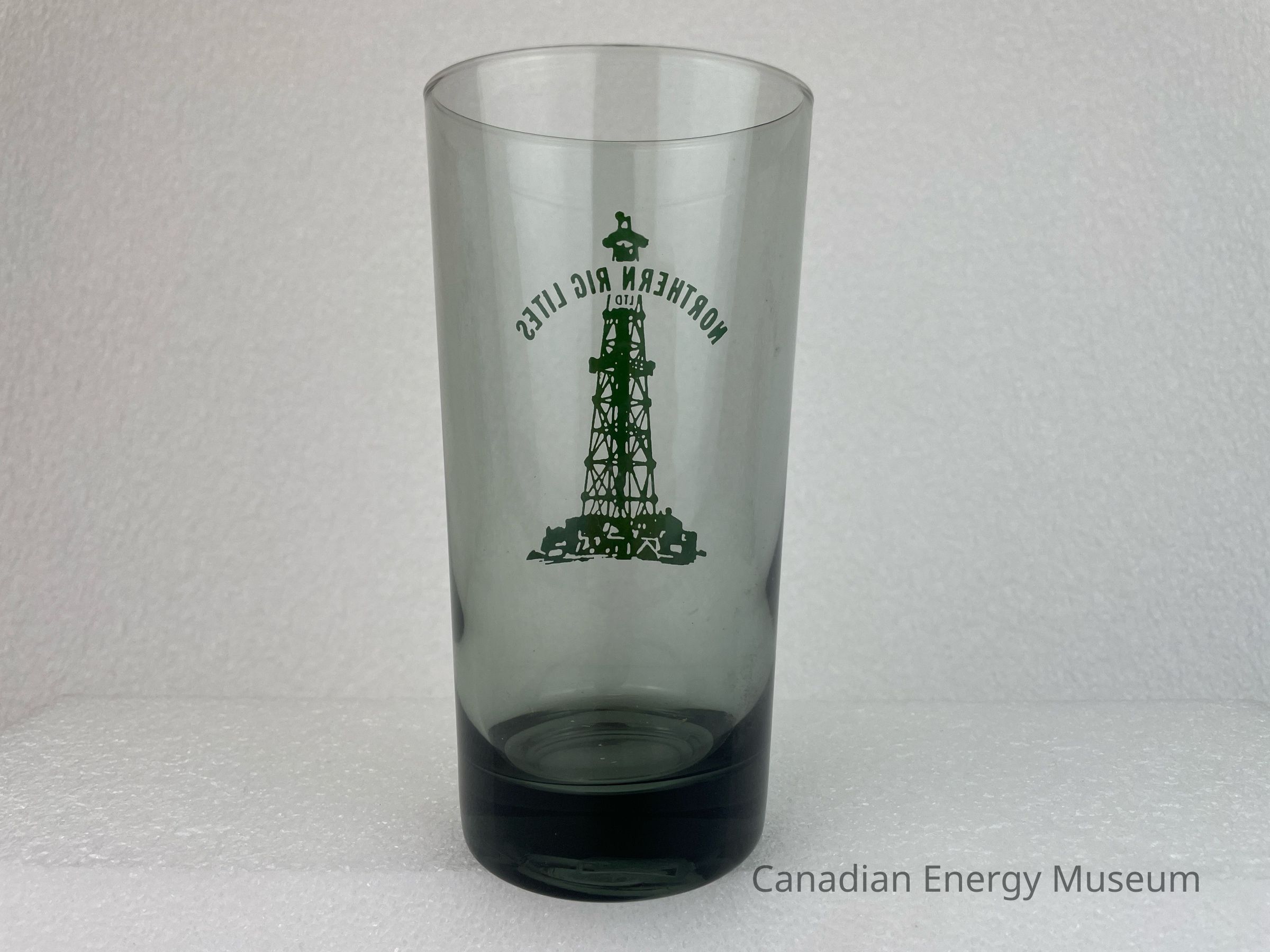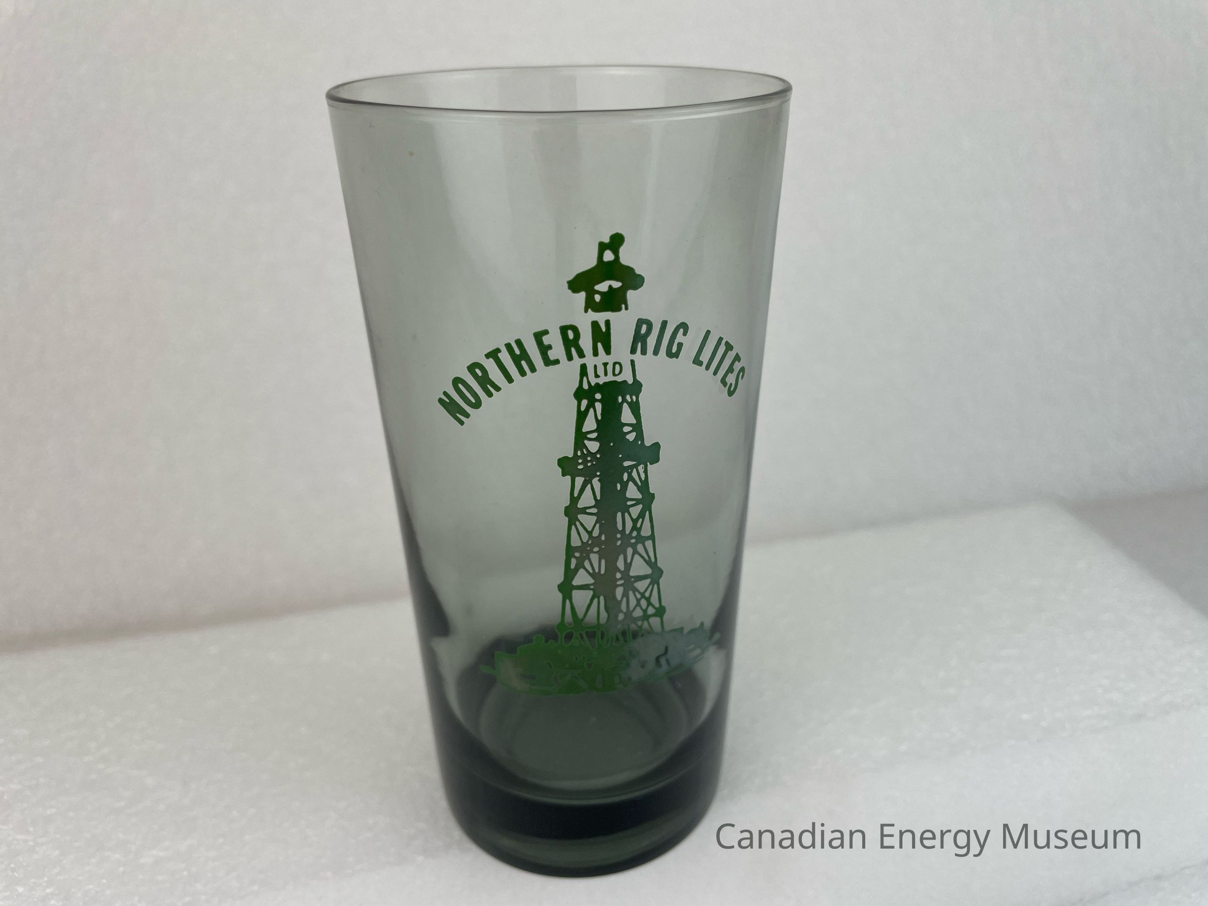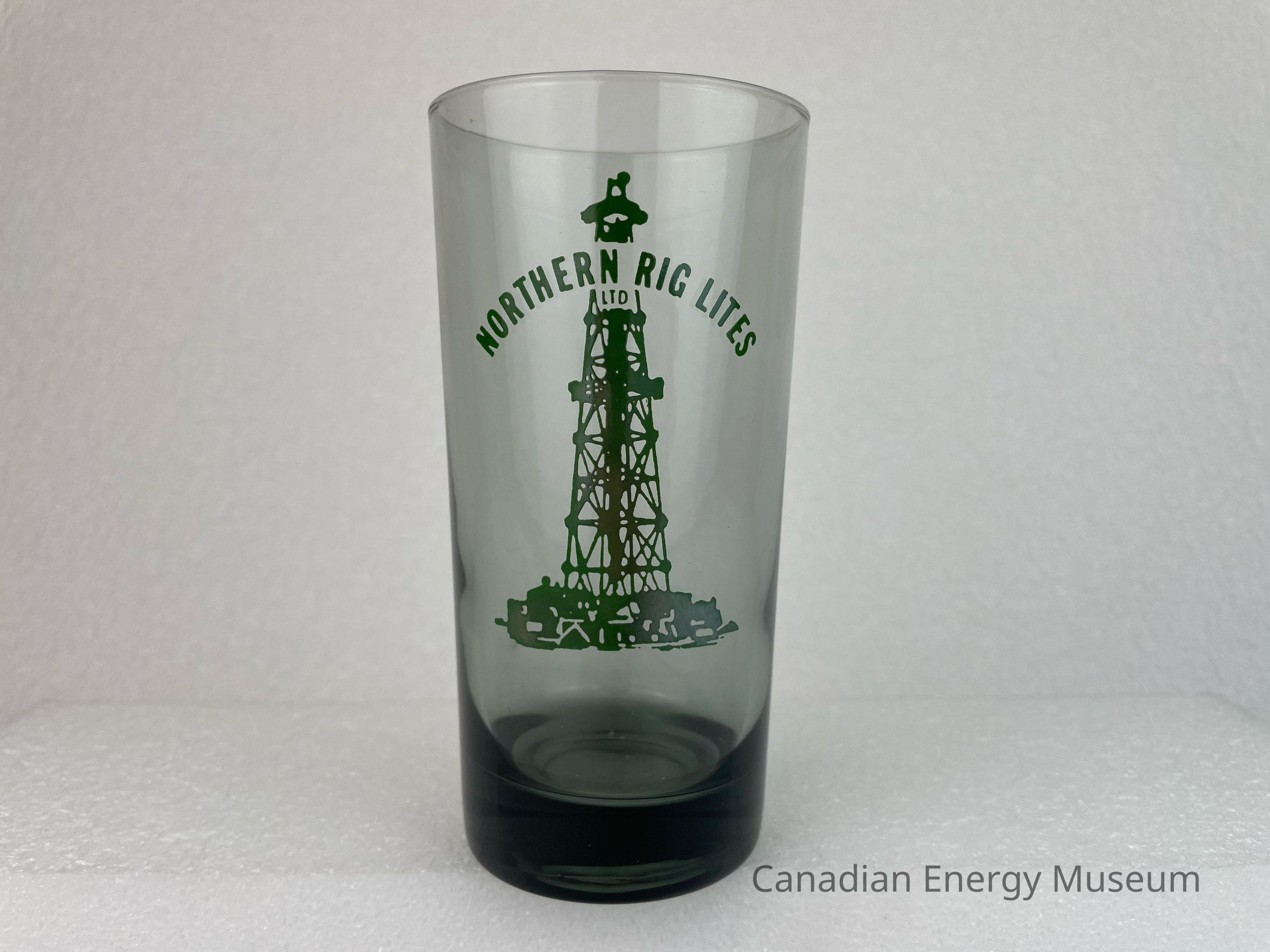 A tall, black, translucent drinking glass branded to Northern Rig Lites Ltd. The front of the glass features a large green illustration of an oil derrick. Running through the top of the derrick is arched green text reading, "NORTHERN RIG LITES LTD".Collection