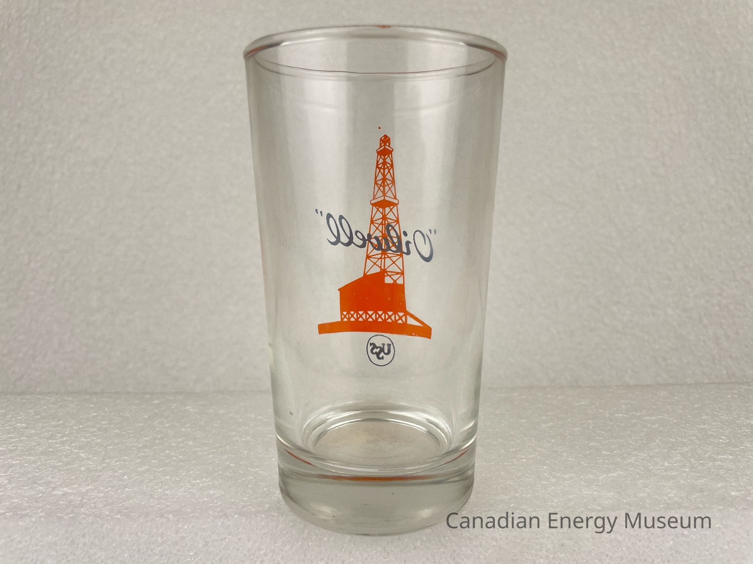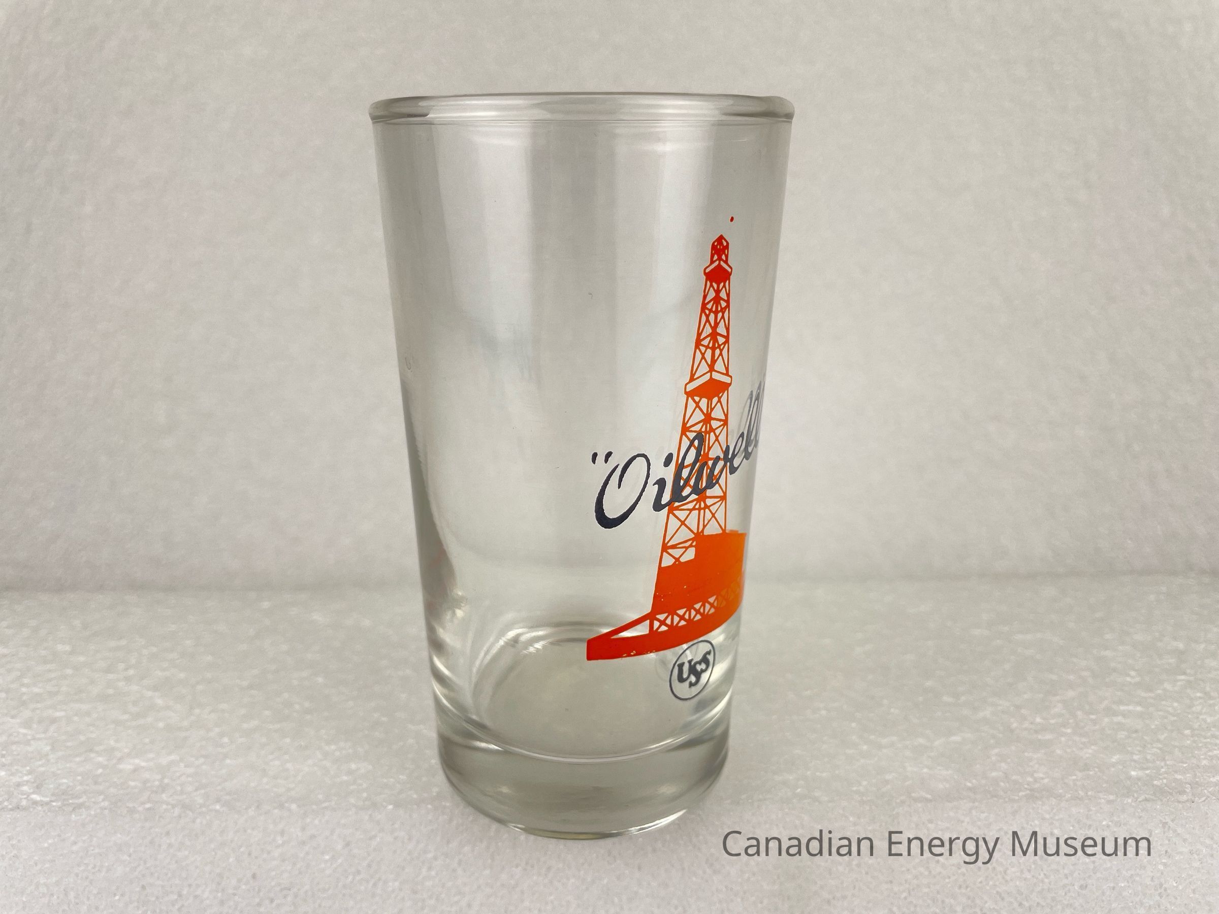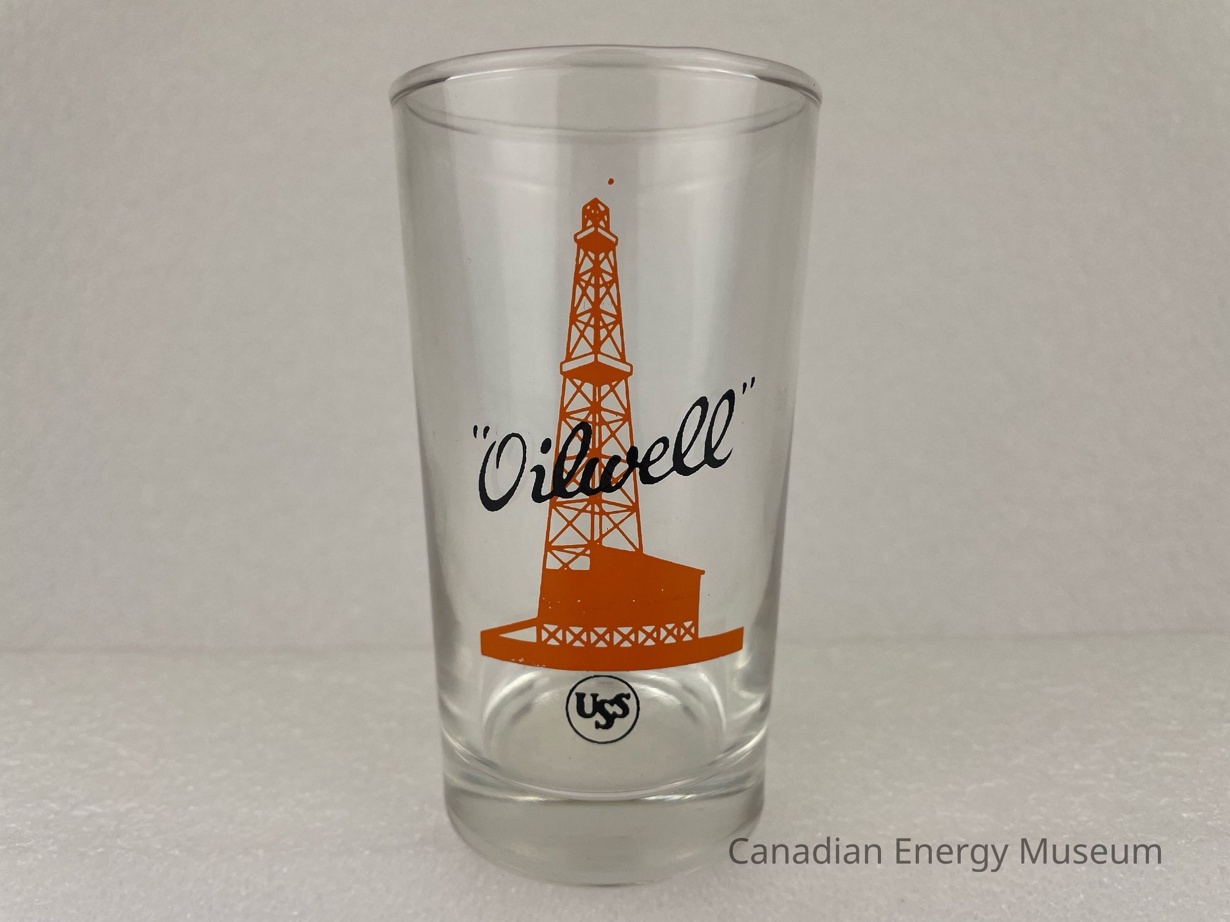 This glass is a short drinking glass made from clear glass, with a printed design on one side. The glass is straight, with a heavy base. The printed design consists of an orange oil derrick, over which is the black script text ""Oilwell"", below is a small black ring with stylized black text "USS". This glass is part of a set of three. The glasses likely date from the mid-1950s to the 1960s, based on the maker's mark ("L" within a circle, which began use in 1955) and dating of similar glasses.Collection