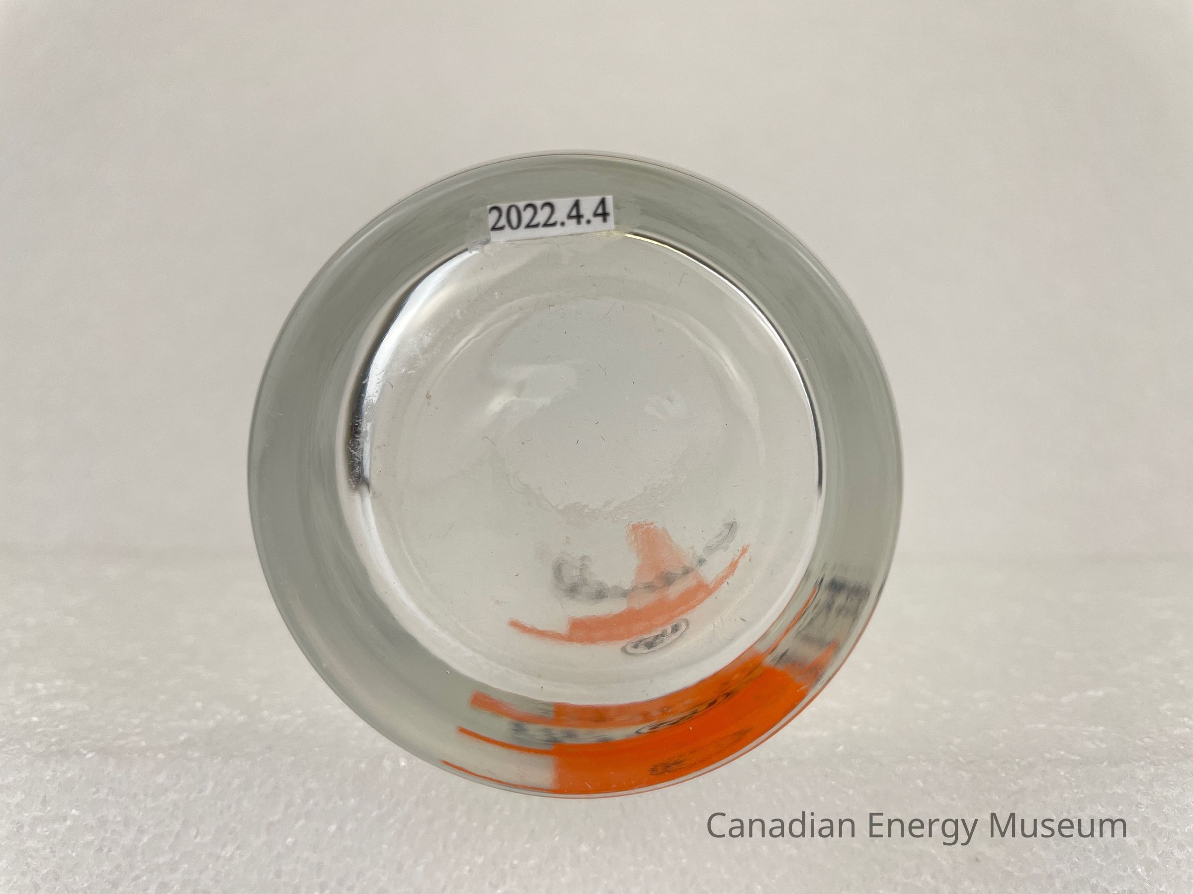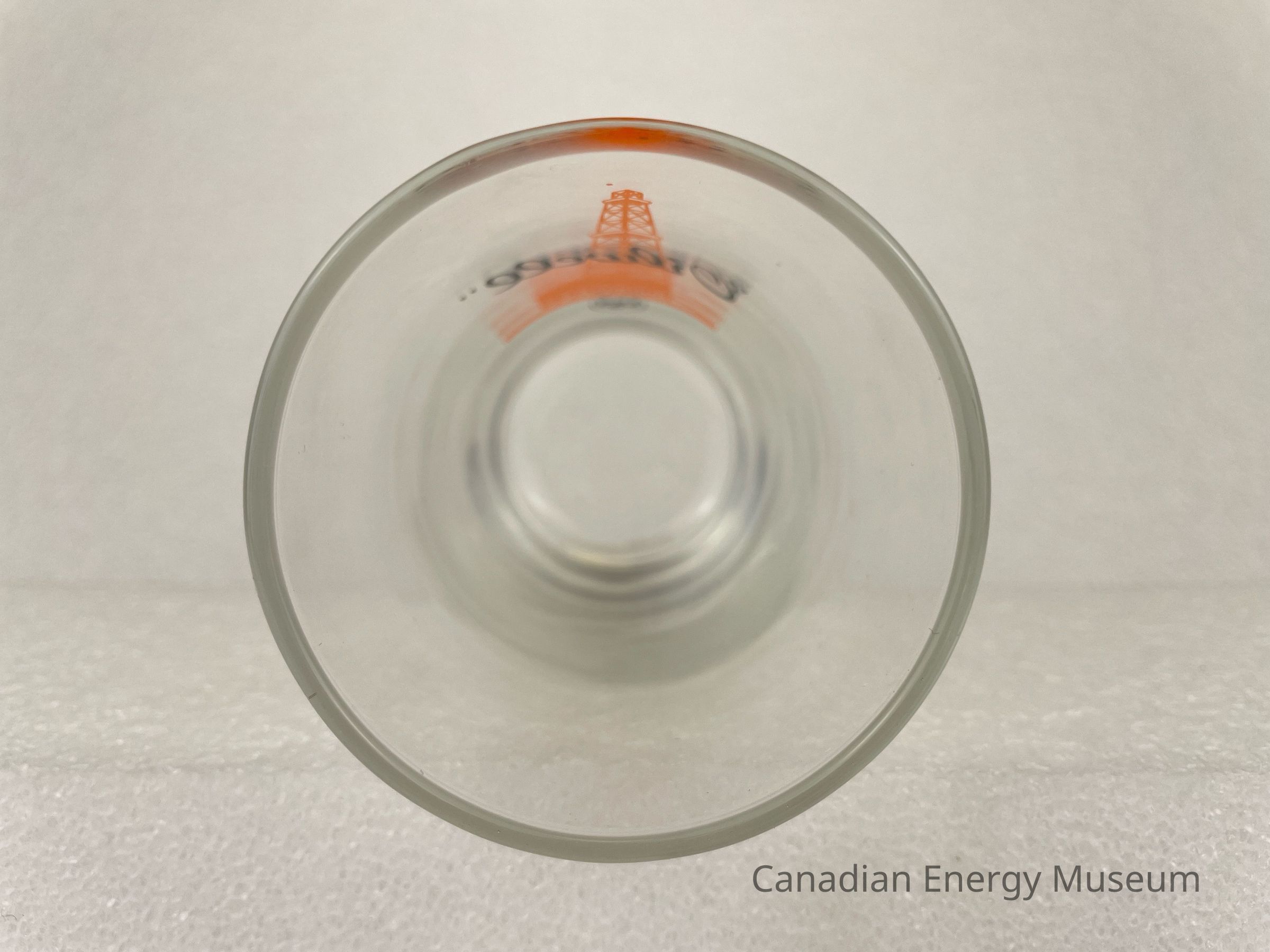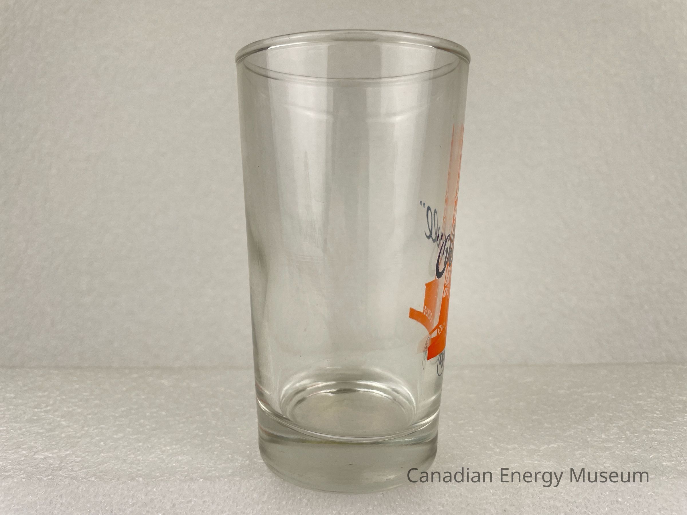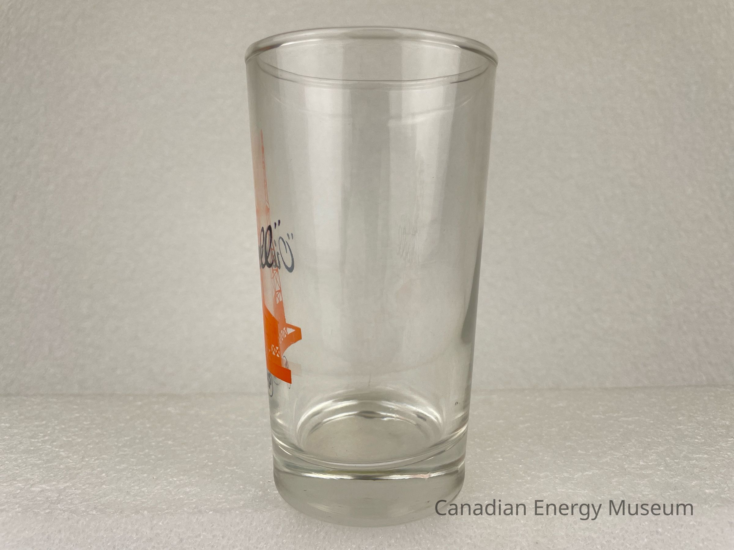 This glass is a short drinking glass made from clear glass, with a printed design on one side. The glass is straight, with a heavy base. The printed design consists of an orange oil derrick, over which is the black script text ""Oilwell"", below is a small black ring with stylized black text "USS". This glass is part of a set of three. The glasses likely date from the mid-1950s to the 1960s, based on the maker's mark ("L" within a circle, which began use in 1955) and dating of similar glasses.Collection