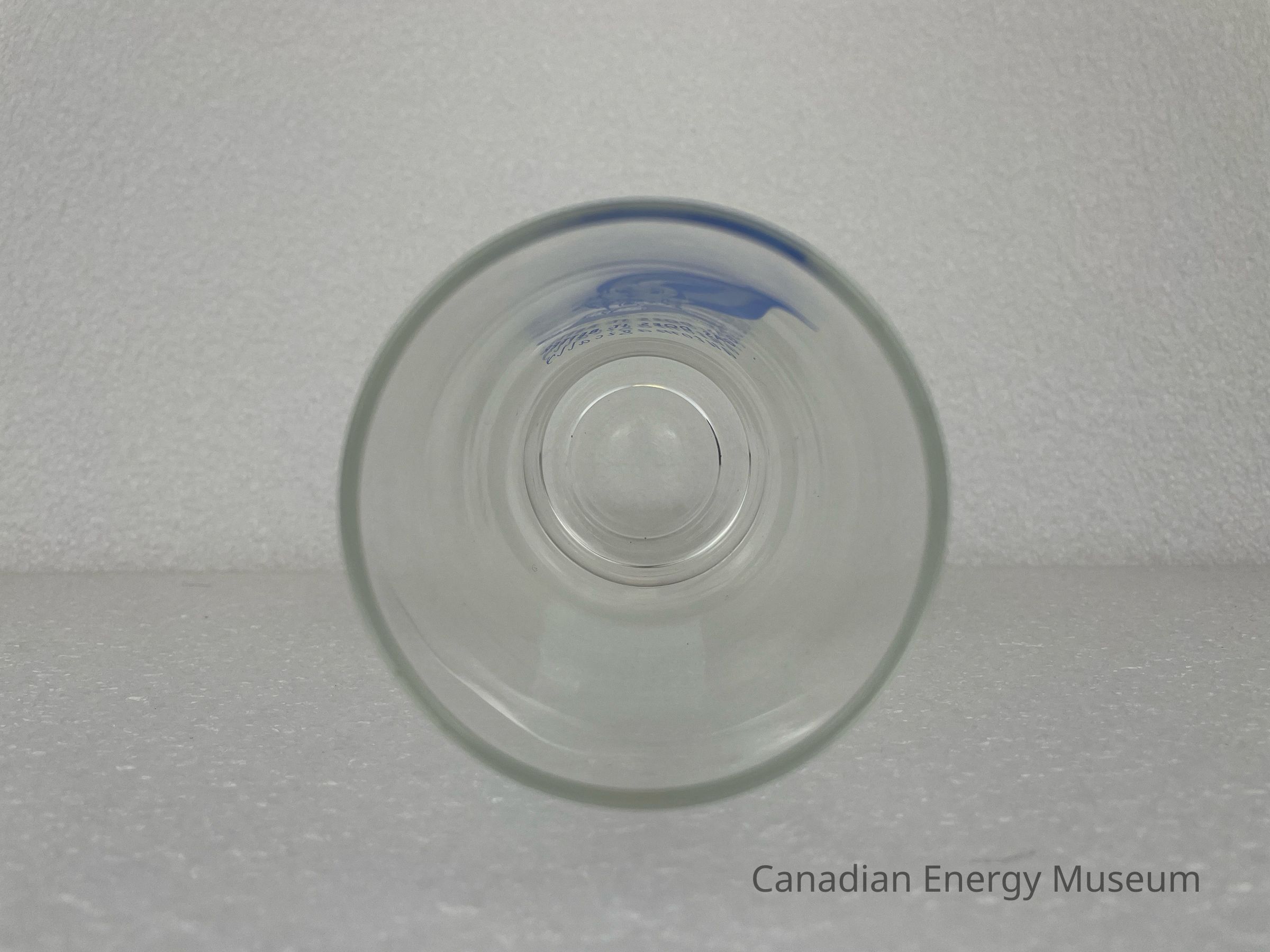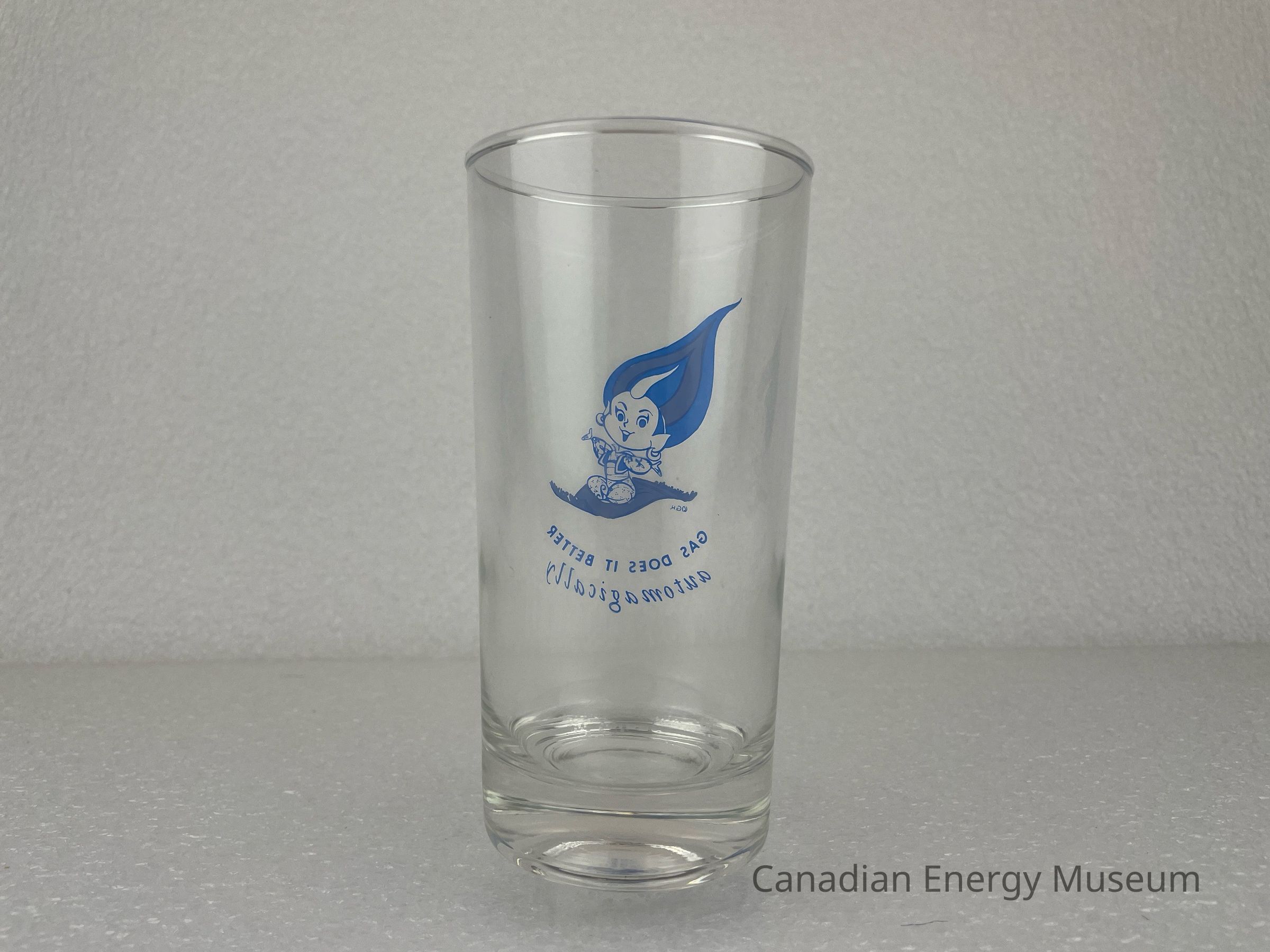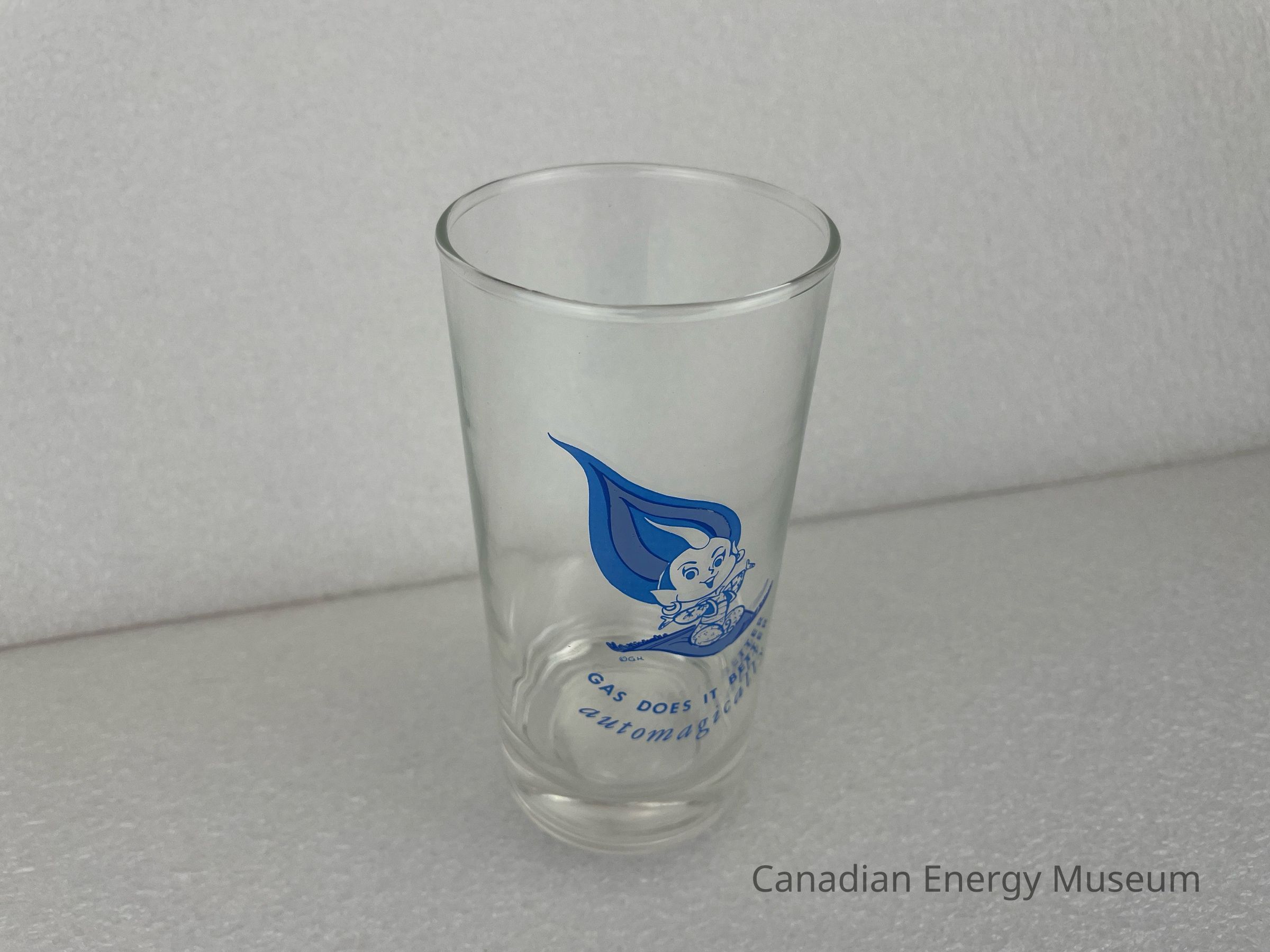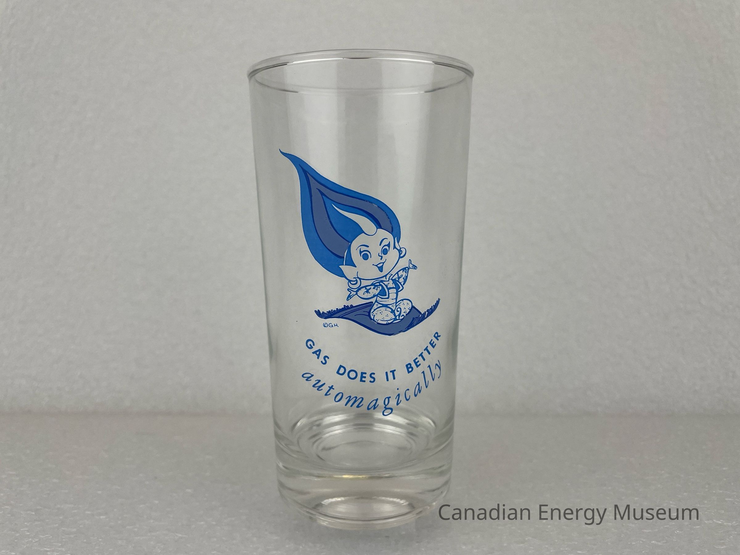 This glass displays a printed design on one side. The printed design consists of a blue Union Gas Genie. The Genie is flying on a dark-blue carpet and is sitting cross-legged with its arms out and open. Underneath the Genie is blue text that is arched upwards reading, "GAS DOES IT BETTER automagically". The "automagically" is written in cursive, while the rest is sans serif.Collection