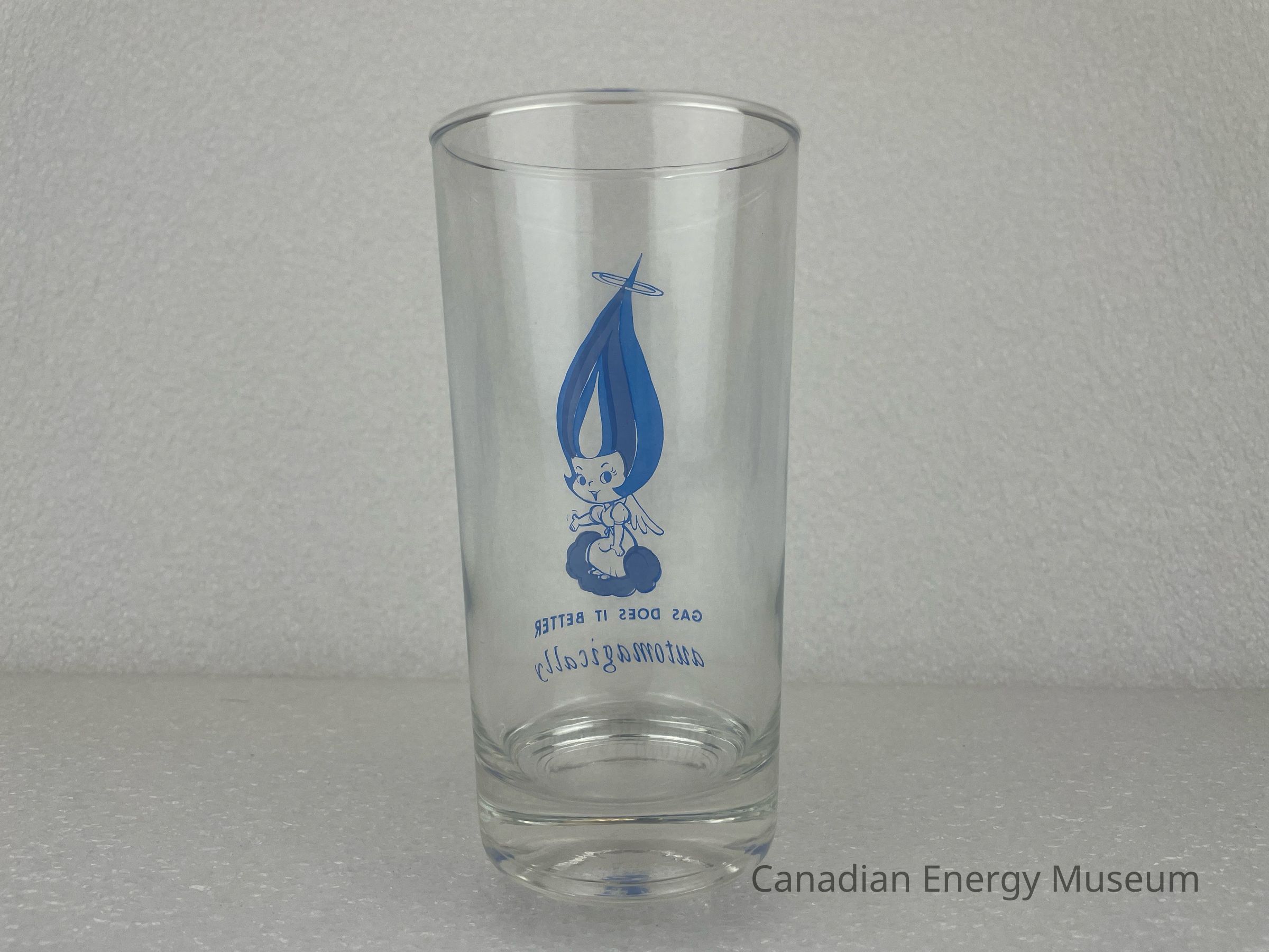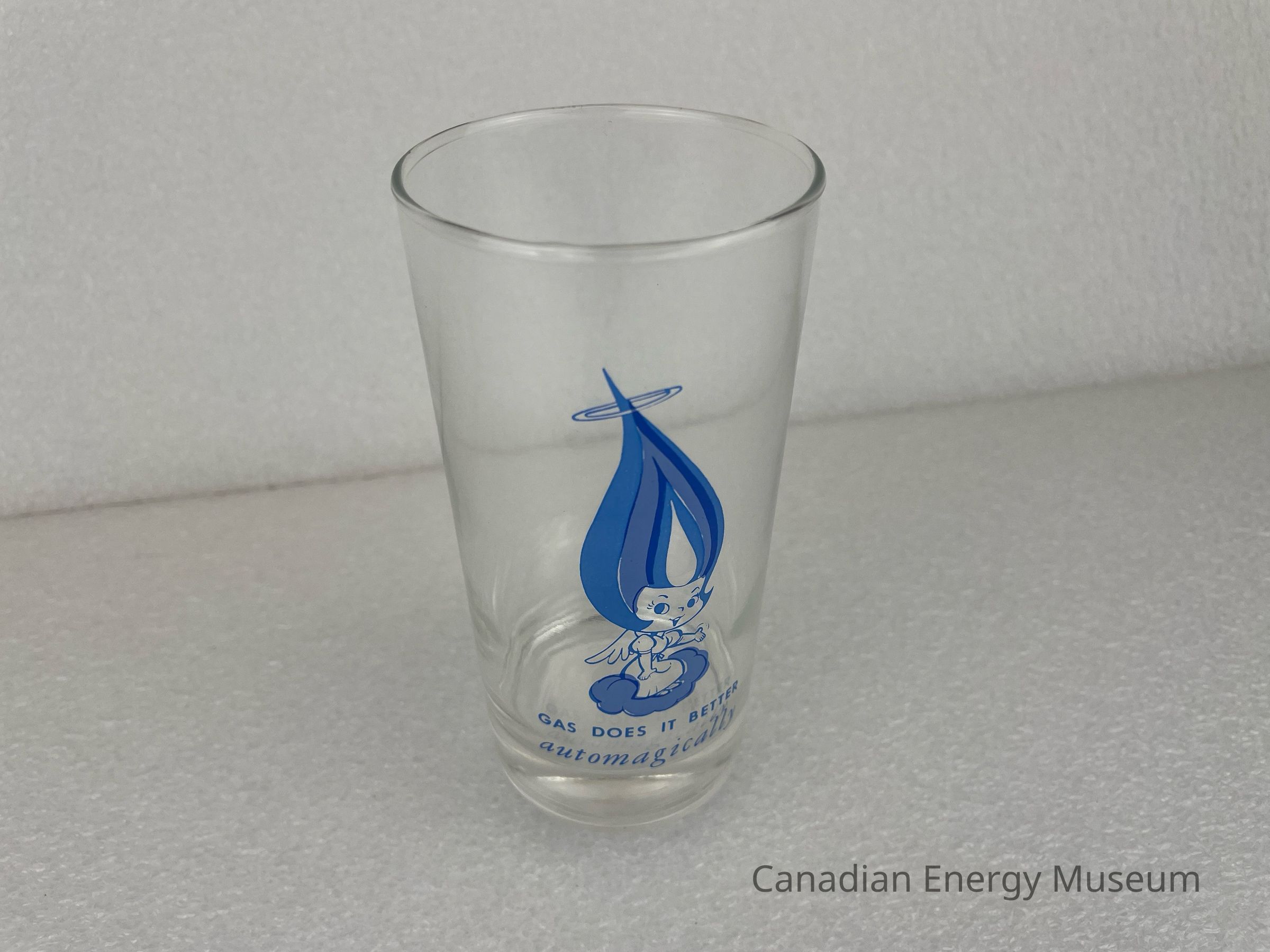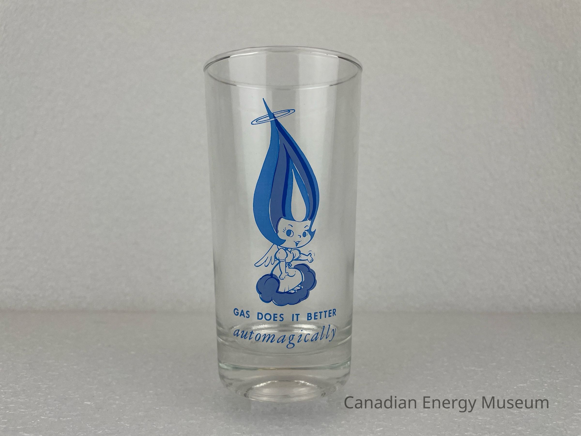 This glass displays a printed design on one side. The printed design consists of a blue Union Gas Genie. The Genie is wearing a dress with puffy sleeves and has a small angel wing coming from its back. The Genie's hat has an angel's halo around the tip, and the Genie is floating on a light-blue cloud. The Genie has one hand on its knee and the other is out and open. Underneath the Genie is blue text reading, "GAS DOES IT BETTER automagically". The "automagically" is written in cursive, while the rest is sans serif.Collection