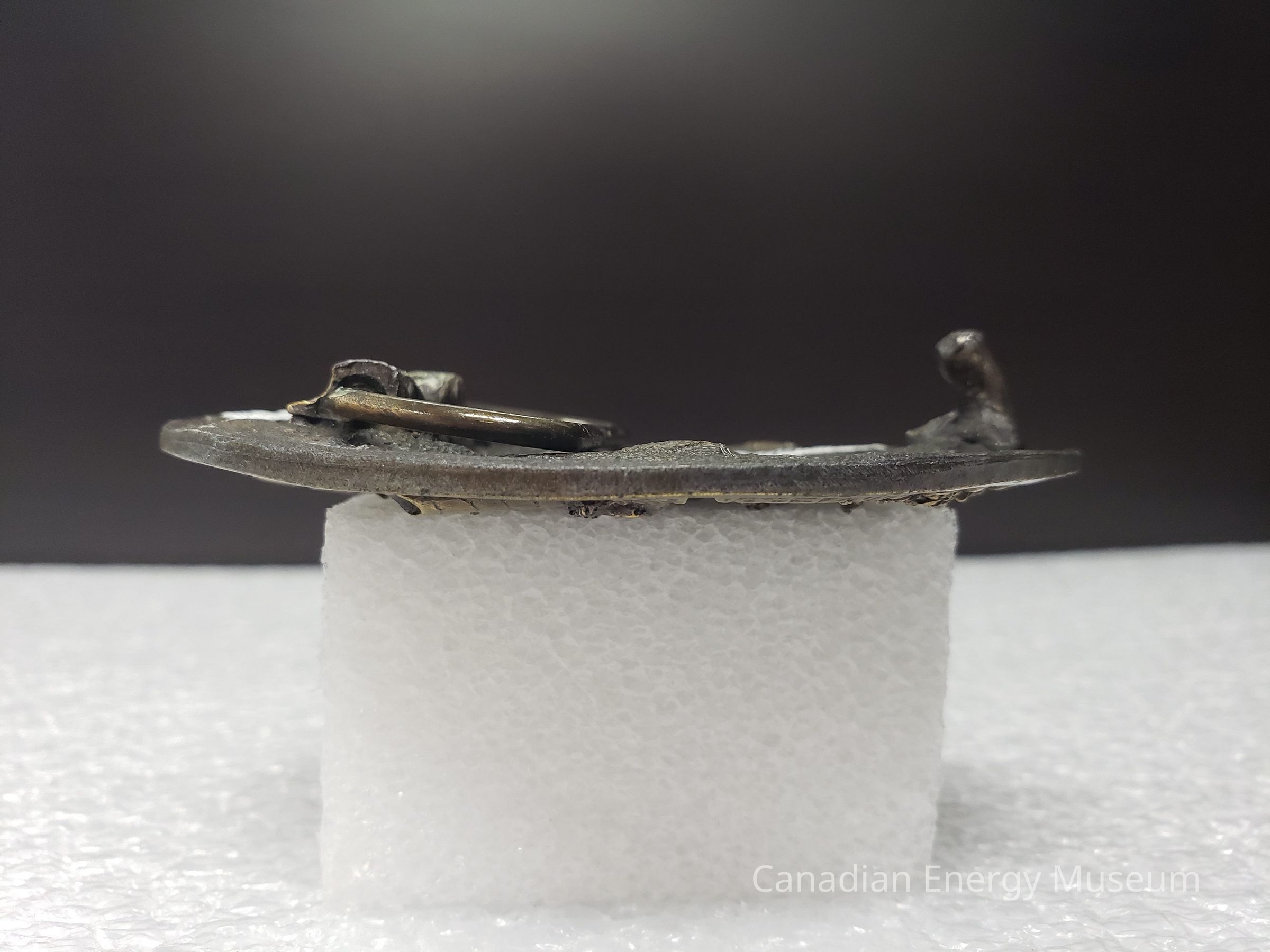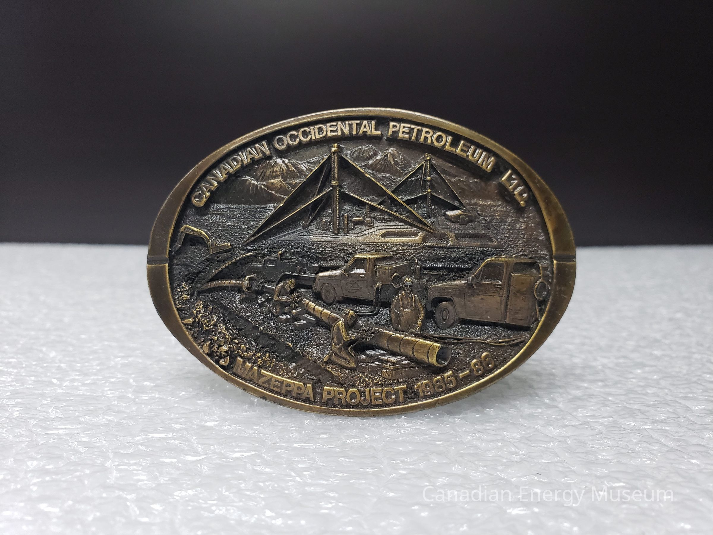 Old Description (Kelsey Dalrymple, 3 June 2020):Canadian Occidental Petroleum ltd. Mazeppa Project 1985-1986. Brass oval belt buckle. Scene of laying pipe on face.Collection