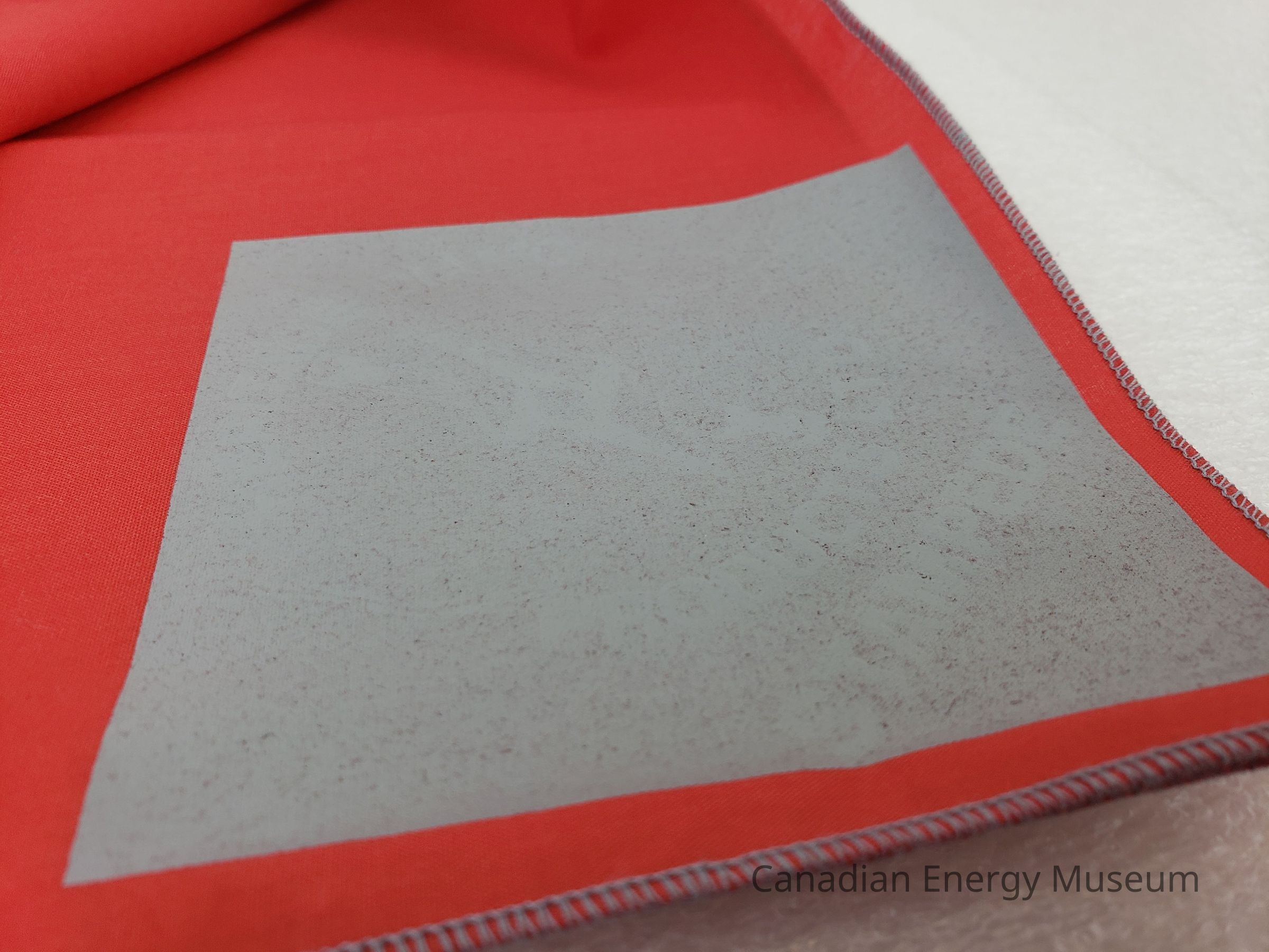 Design: A red fabric napkin, branded to Heritage Diamond Product Ltd. The square napkins are folded into quarters, with a printed design on two opposite corners. The one corner has the grey/silver printed design of an elongated diamond shape with a bar-like piece of equipment behind it. In a circle around the design is the curved text "HERITAGE DIAMOND" at the top and "PRODUCT LTD." at the bottom. Below is also printed "STAMPEDE". On the opposite corner is a large grey/silver printed square, with the imprint of the above design on it. Along the edge of the napkin is grey/silver stitching.Collection