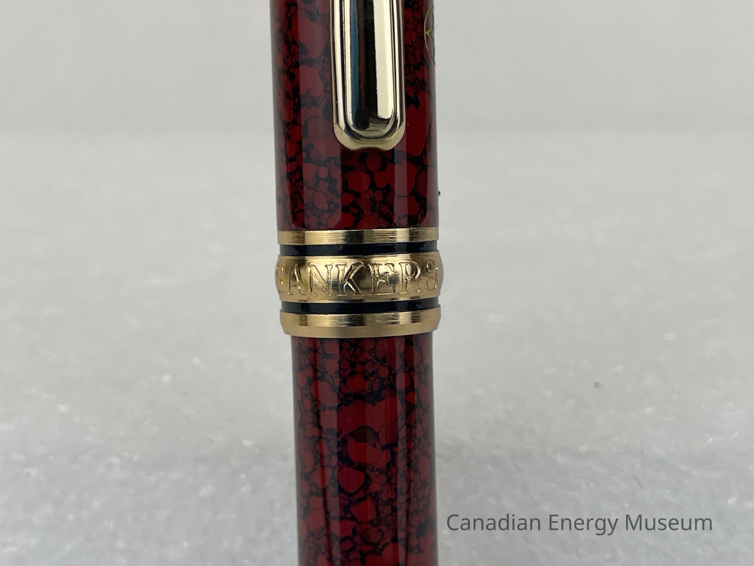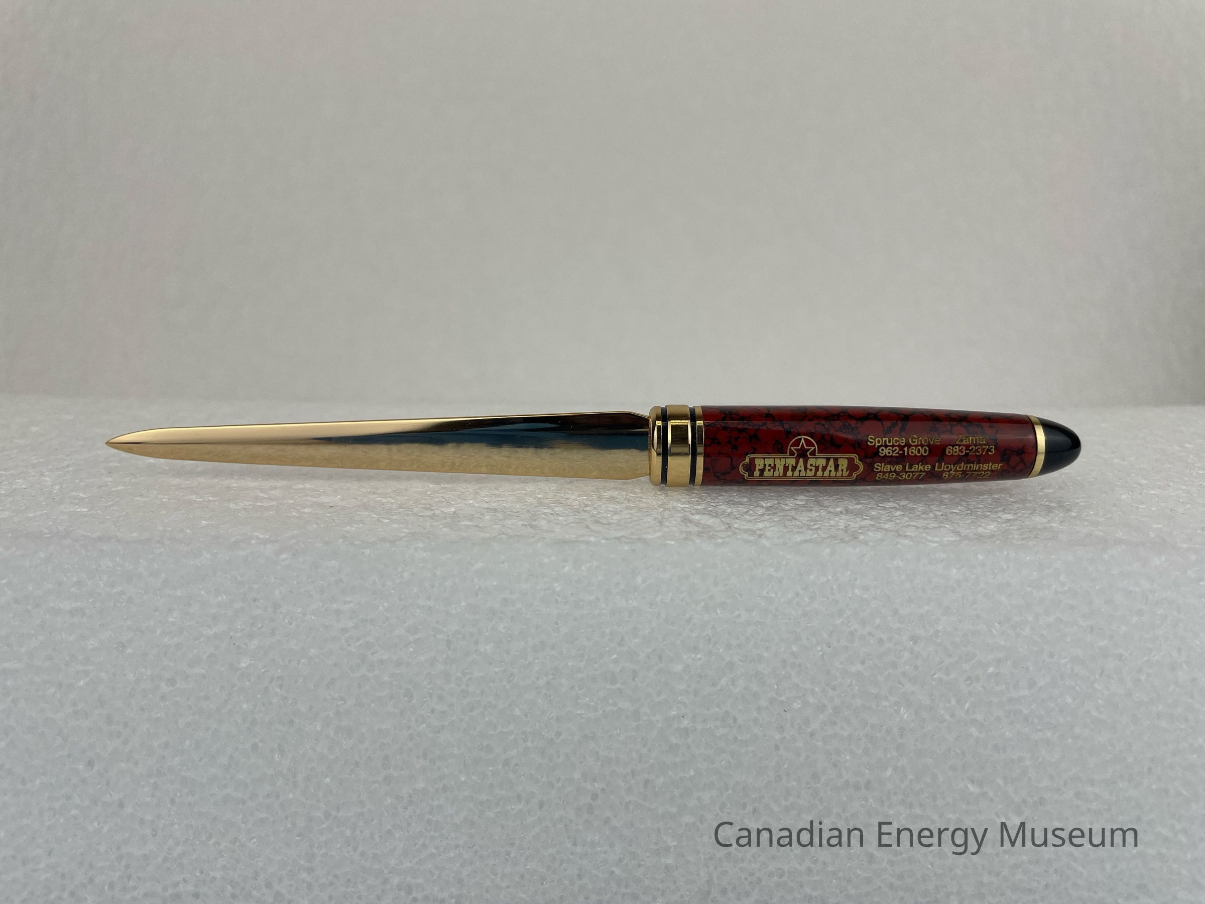 A pen and a letter opener set with a red and black marble pattern body and gold details. The pen twists to open the ballpoint. The tip, clip, and bottom of the barrel are gold, and the end cap is black. Etched text is displayed on the band of gold at the bottom of the barrel, reading, "BANKERS". The rest of the pen displays the red and black marble pattern. The barrel displays a gold logo of text reading, "PENTASTAR", and is surrounded by a rectangular shape with the top half of a star sitting at the top centre. Besides the logo is gold text reading, "Spruce Grove 962-1600 / Zama 683-2373 / Slave Lake 849-3077 / Lloydminster 875-7722".