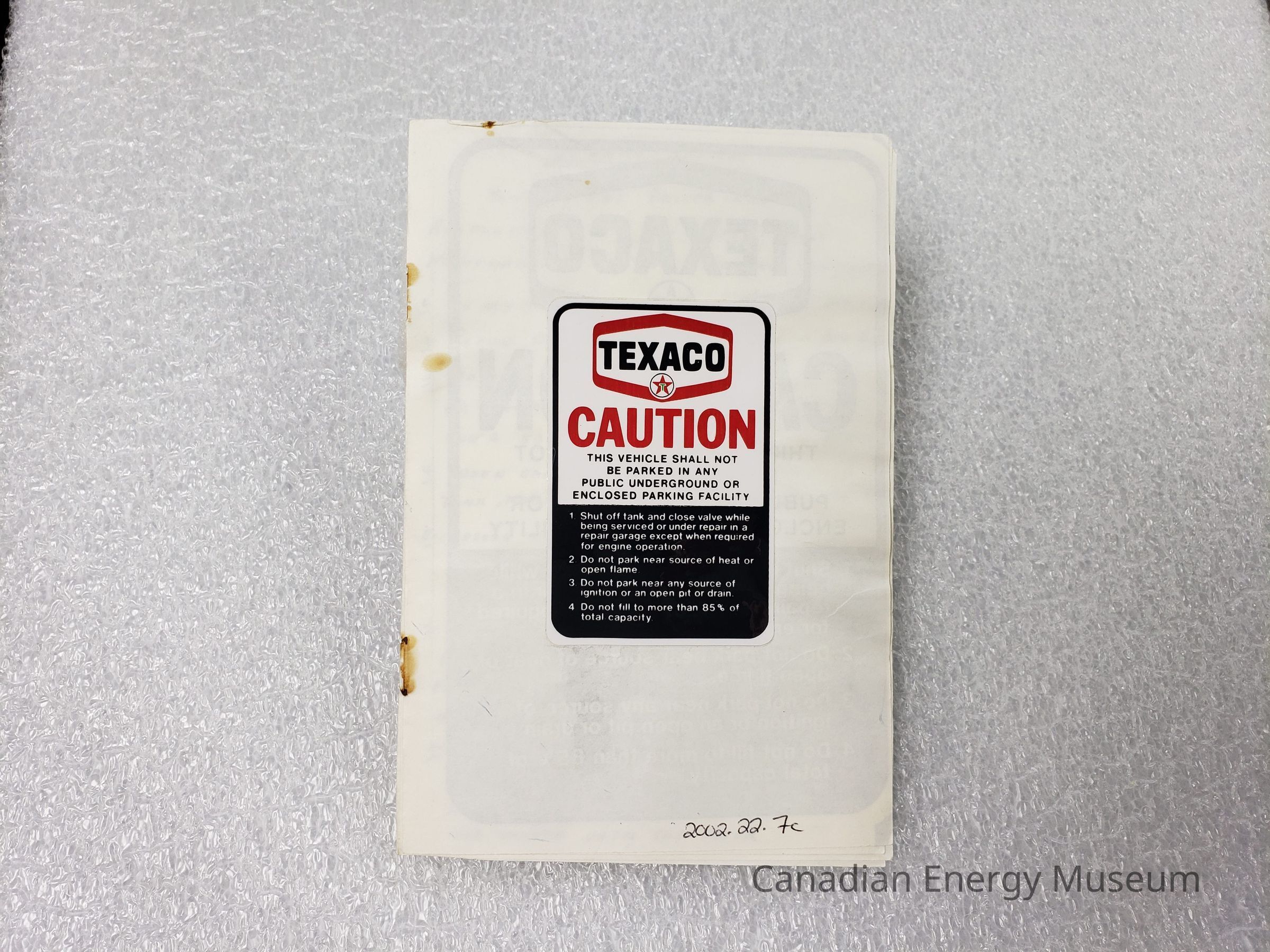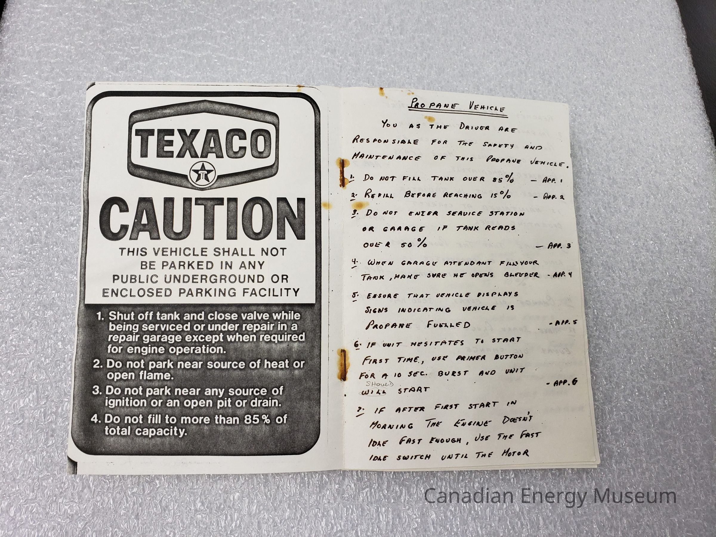 Features: Printer paper stock (with some printed material), stapled together roughly. Made of 3 folded sheets to make 6-pages. Front page bears a Texaco glossy sticker reading: "TEXACO; CAUTION; THIS VEHICLE SHALL NOT BE PARKED IN ANY PUBLIC UNDERGROUND OR ENCLOSED PARKING FACILITY; 1. Shut off tank and close valve while being serviced or under repair in a repair garage except when required for engine operation; 2. Do not park near source of heat or open flame; 3. Do not park near any source of ignition or an open pit or drain; 4. Do not fill to more than 85% of total capacity". The inside cover has a photocopied and enlarged version of the sticker on the cover. The remaining pages are filled with handwritten notes on working with propane vehicles.Collection