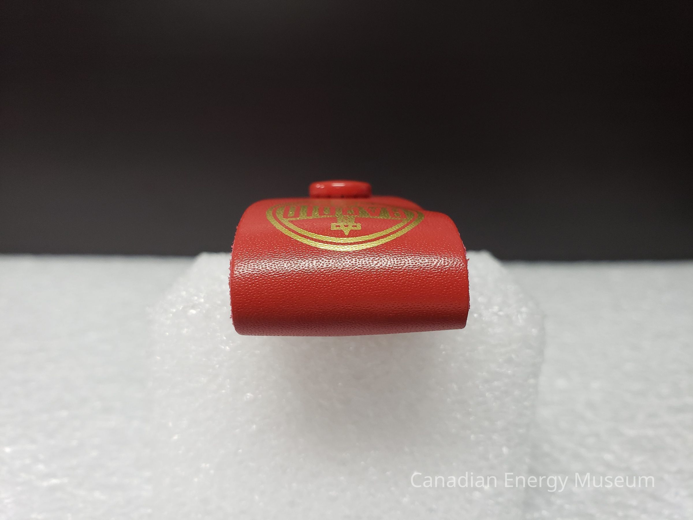 The top of the case as a gold paint logo. the logo is a double ring circle with BAROID in the red negative space. the background of the logo is an oil derrick.Collection