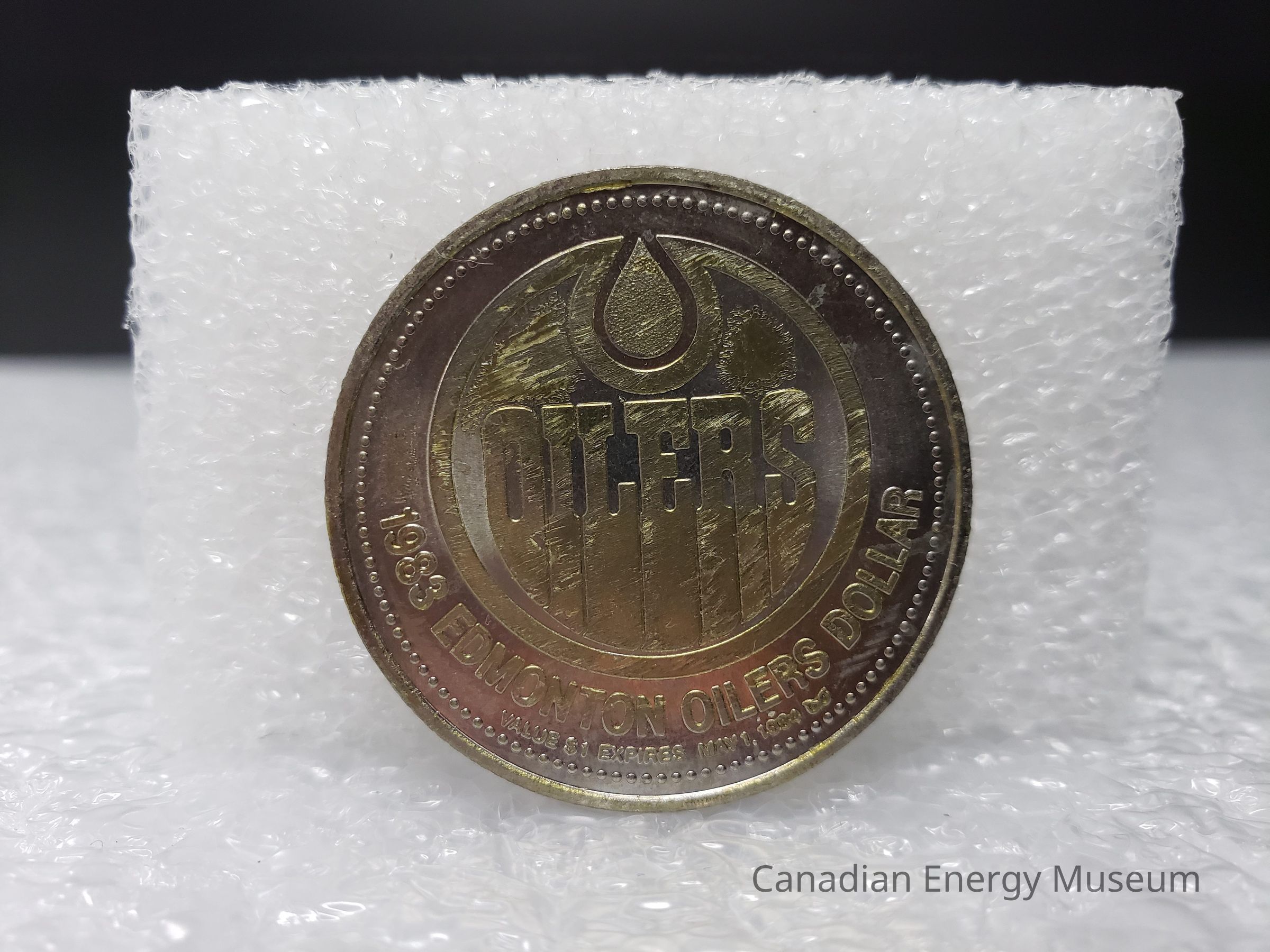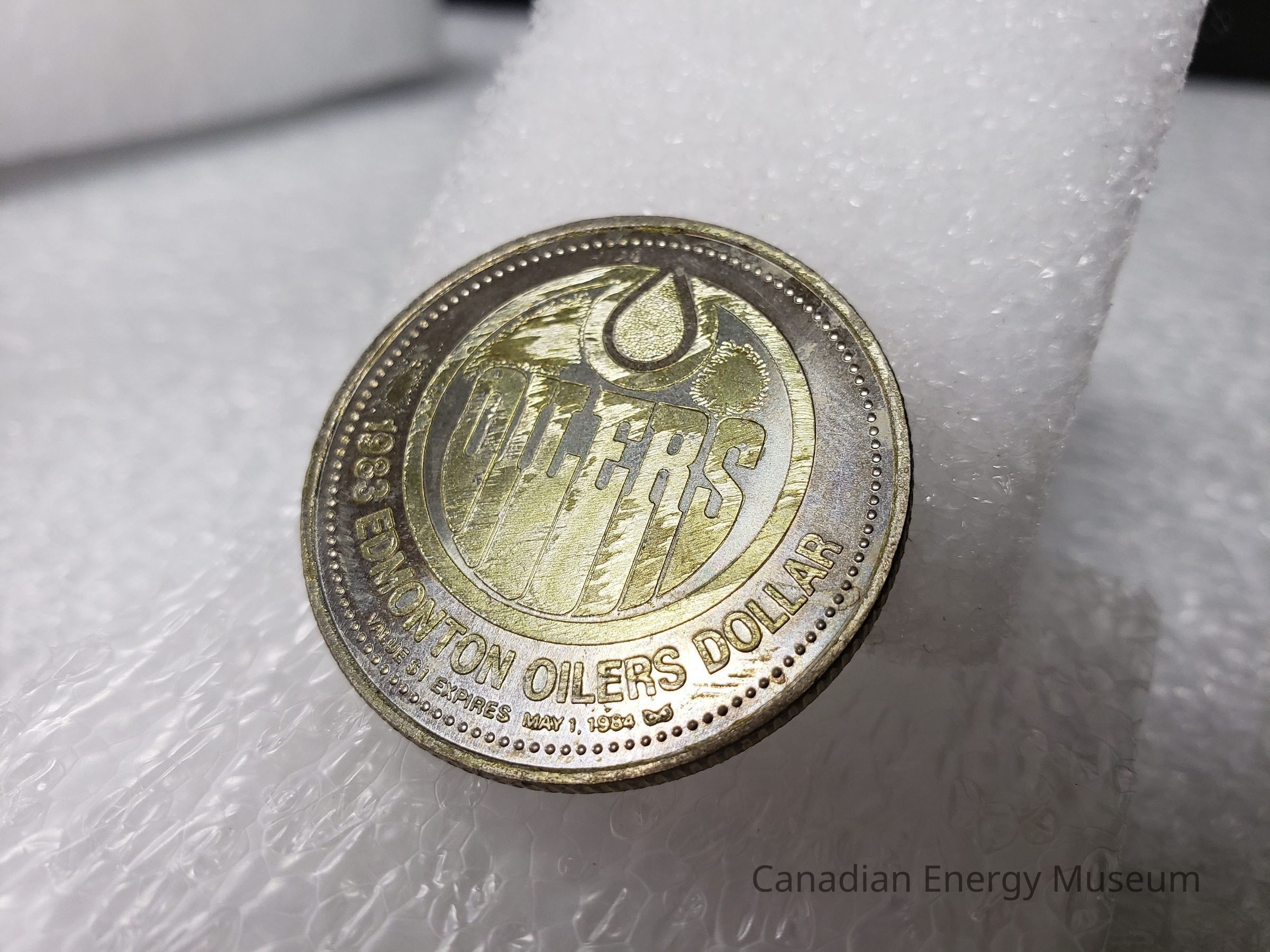 Tails-side: Round Edmonton Oilers' logo, with text "1983 EDMONTON OILERS DOLLAR" below, following the curve of the coin. Around the outside is a dotted border, broken by text at the bottom reading: "VALUE $1EXPIRES MAY 1, 1984 [UNIDENTIFIED]". Ridged edge.