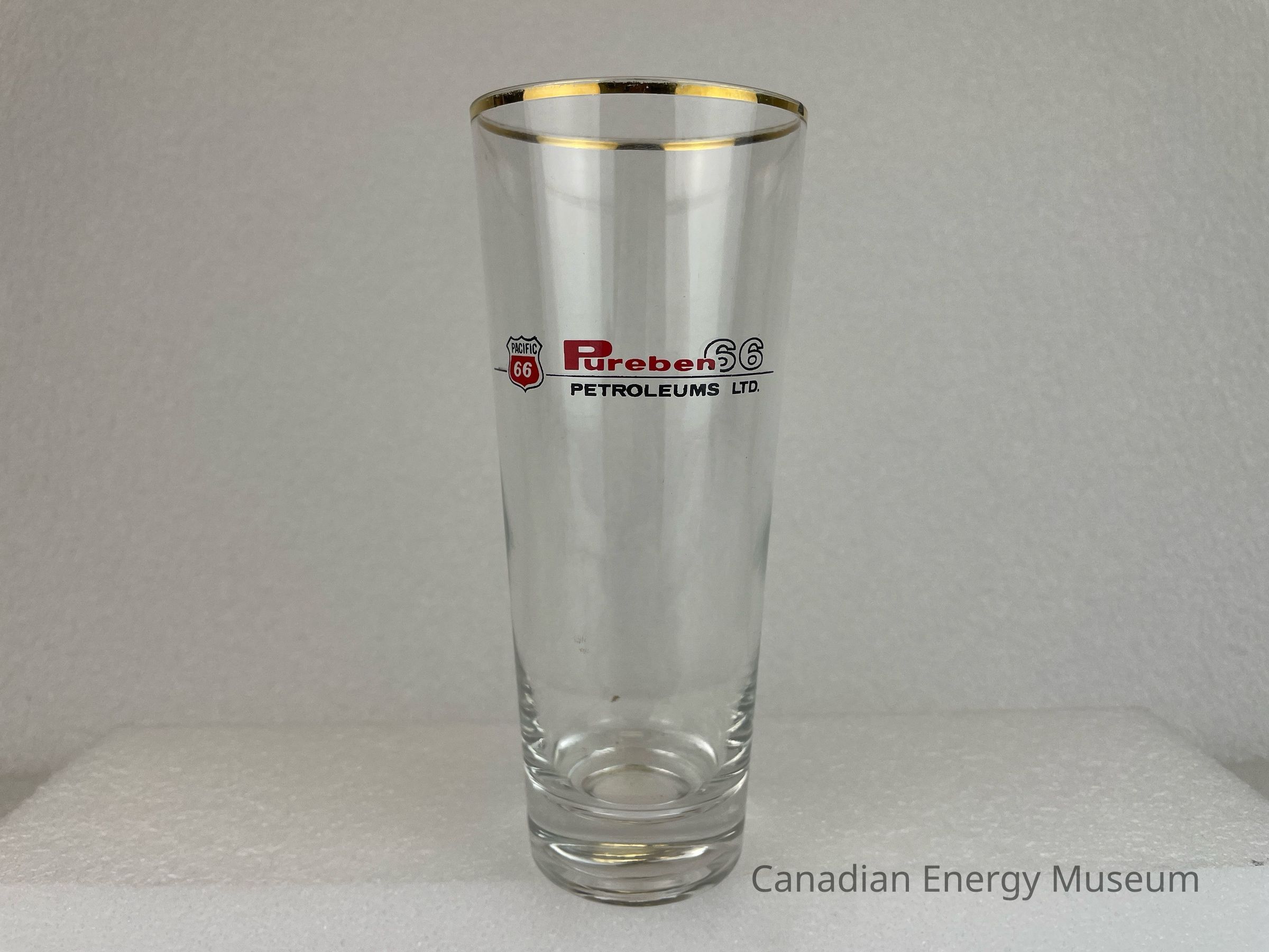 A tall clear glass with a gold rim branded to Pureben Petroleums Ltd. The body of the glass is skinny and is slightly slanted outwards at the top. The front of the glass features red and black text. a thin black line runs through the centre with a black and red highway sign for "PACIFIC 66" on the left. The top of the line displays red text reading, "Pureben" with "66" outlined in black next to it. Beneath the line is black text reading, "PETROLEUMS LTD."Collection