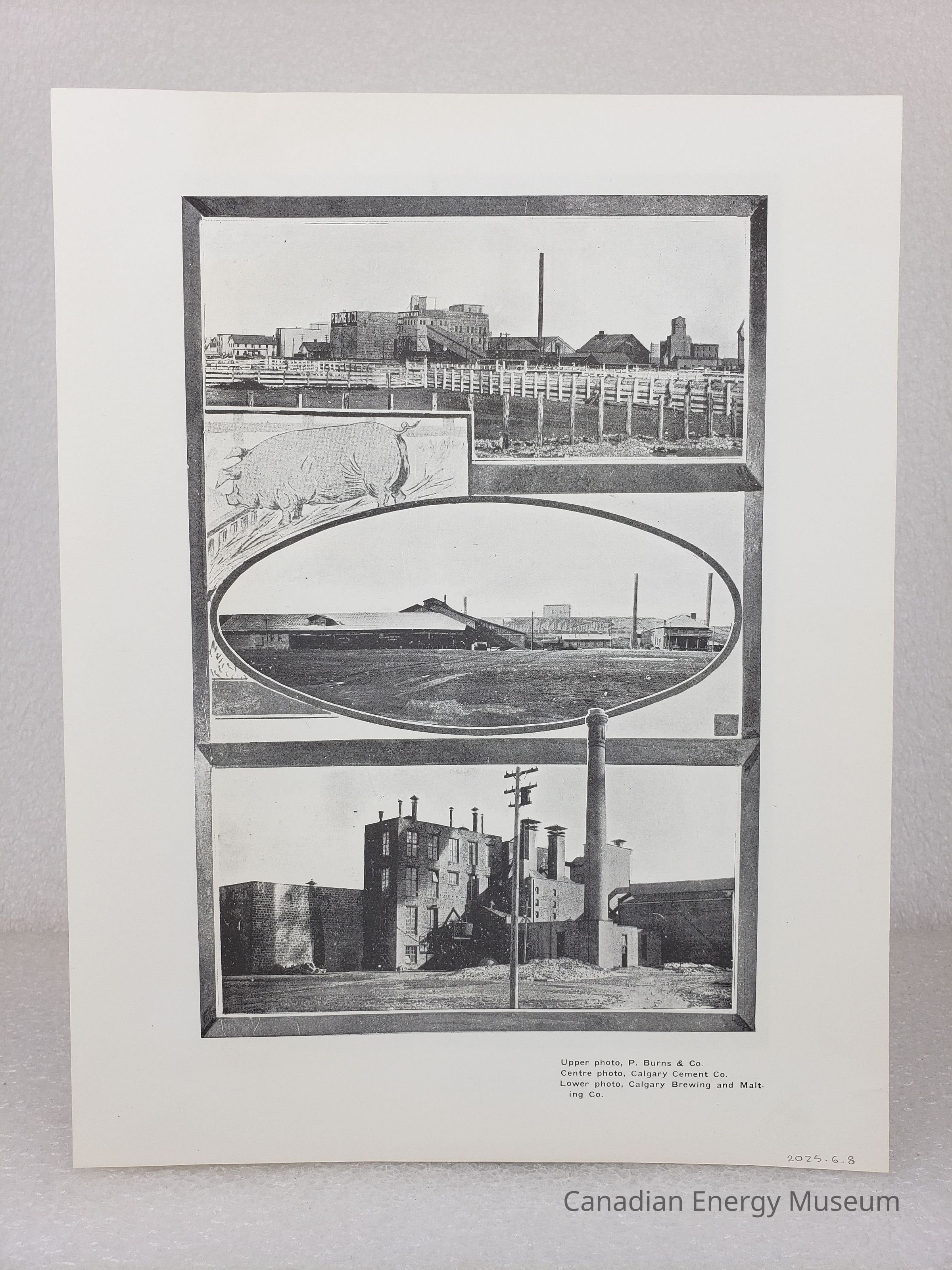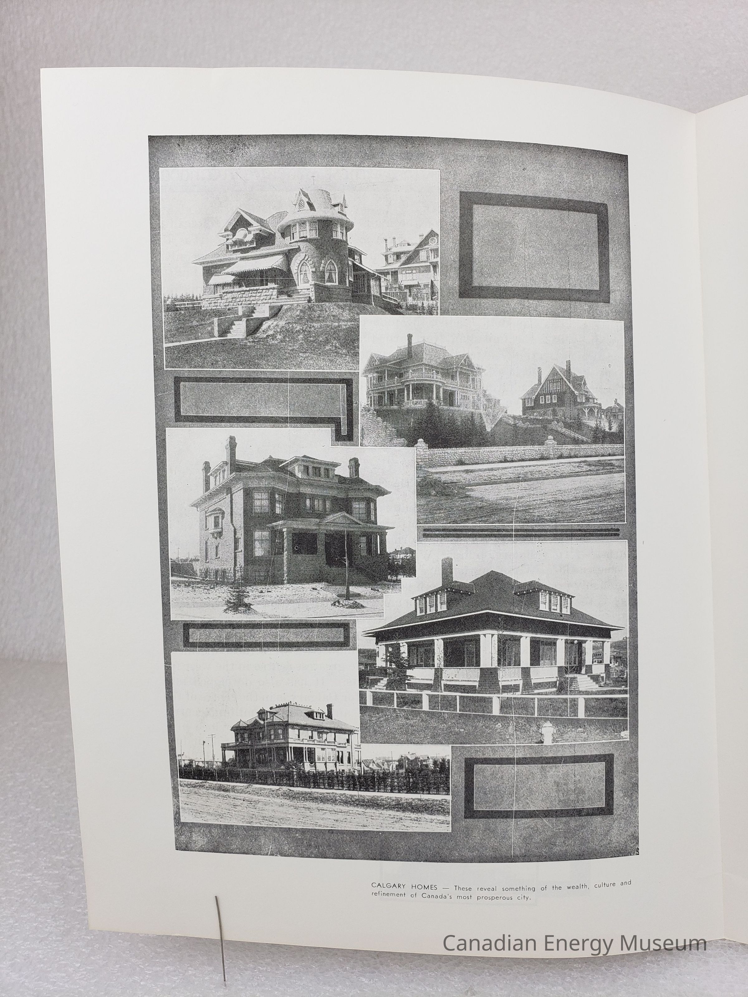 A bi-folded document containing historical information related to Albertan industry, including black and while photographs.