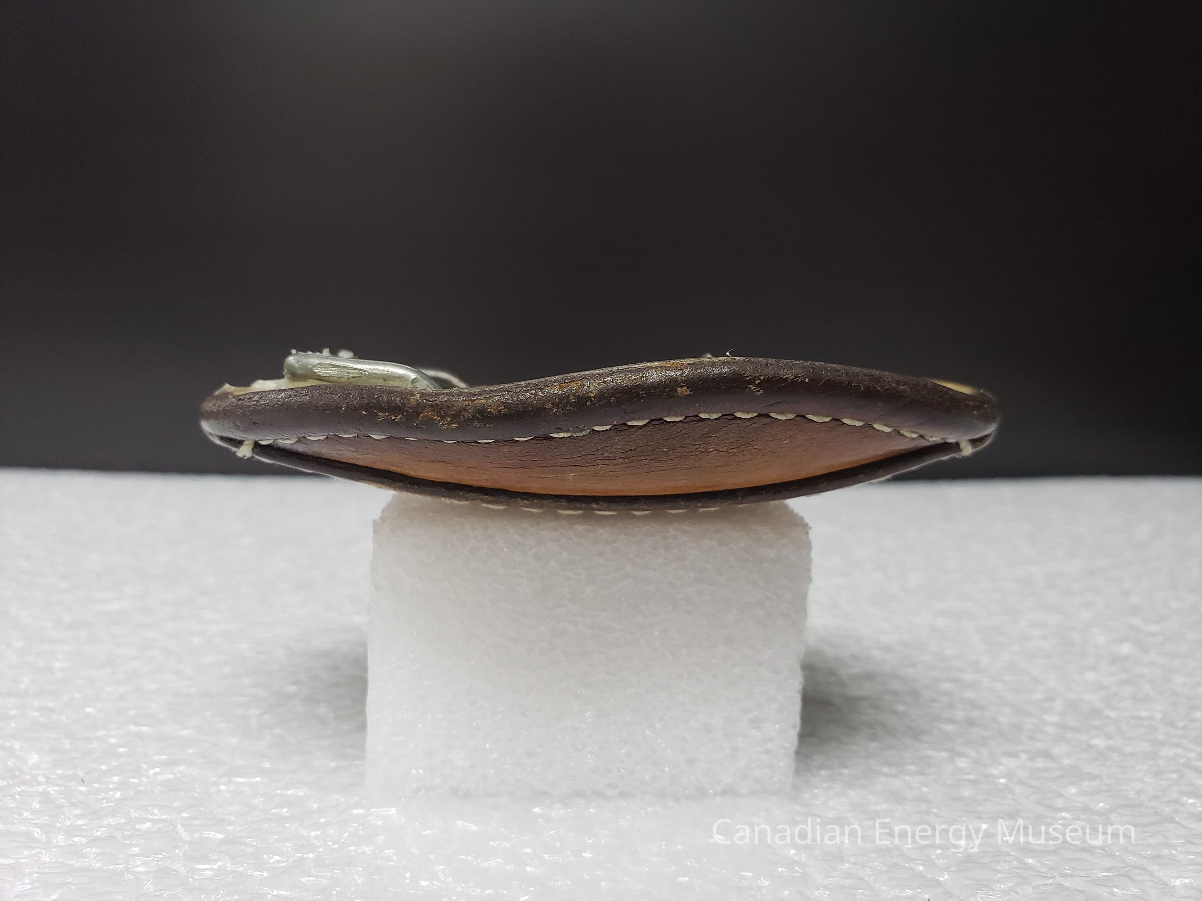 Back Elements: The back is covered with a lighter coloured leather, also stitched around the border with cream thread. A faint, circular maker's mark can be seen pressed into the leather, overlapping the hook. However, other than a triangular burst border and overall shape, the details cannot be made out. Beneath the leather cover appears to be a oval metal plate, slightly small than the overall area of the leather. Holes in the leather have been made, through which the hook and hinge are exposed. The hook is flat and curved inward. The hinge is an irregular hexagon, lightly bent, attached via a rounded, cylindrical base.