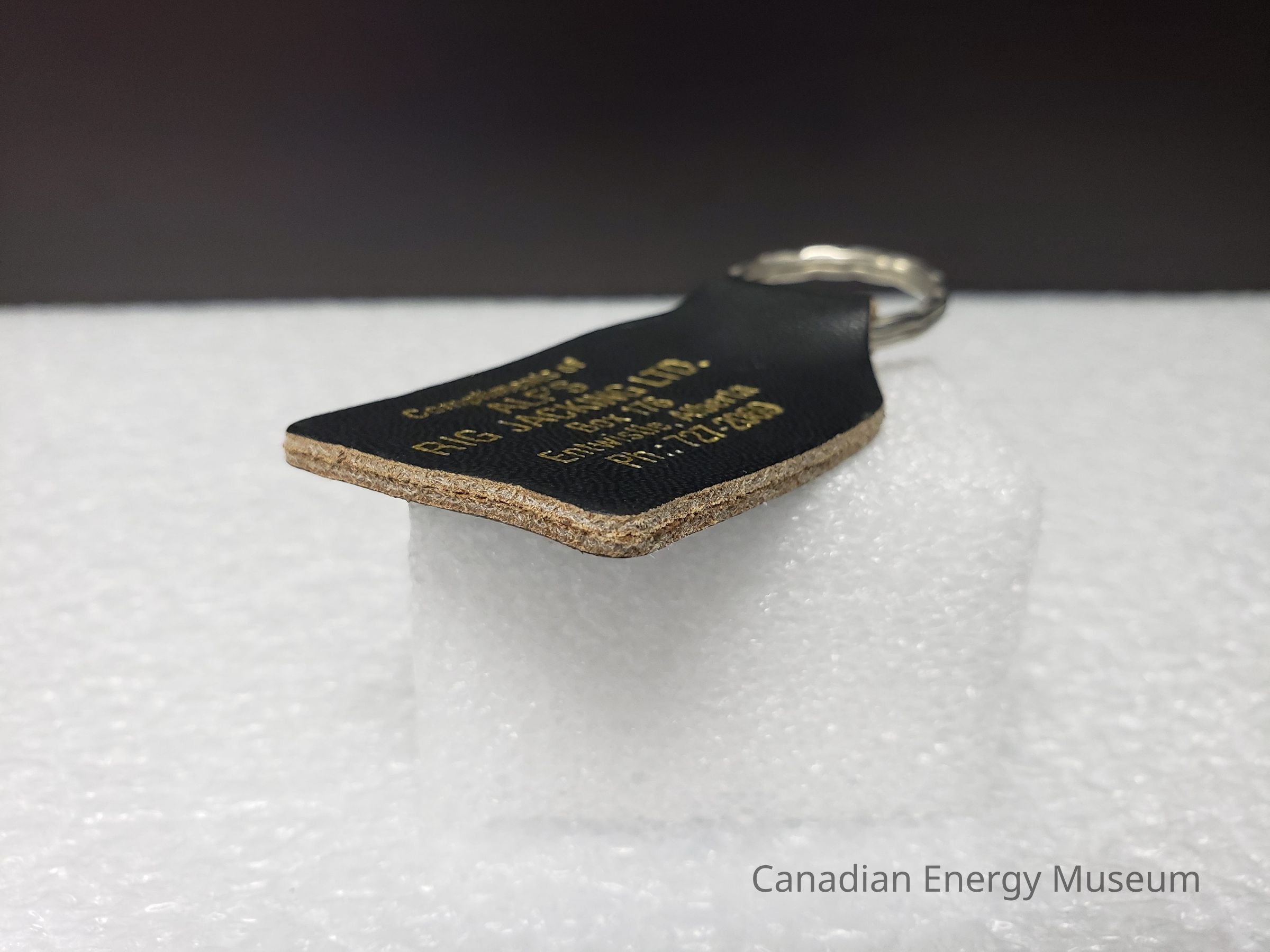 Old Description (Kelsey Steil, 5/24/2022): Key chain with black leather fob. Gold text on one side reads: Compliments of / Alf's Rig Jacking Ltd. / Box 176 / Entwistle, Alberta / Ph: 727-2069.Collection