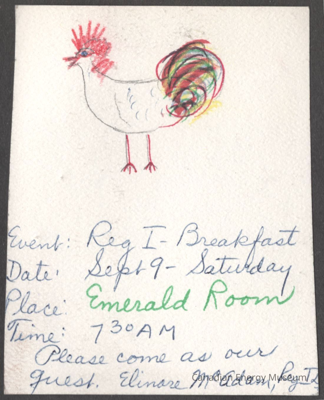 An invitation to the Region I Breakfast (Emerald Room, Fairmont Mayo Hotel, 9 September 1972); as part of the Association of Desk and Derrick Clubs Convention, 7-9 September 1972. The invitation is a single-sided card, with a handdrawn illustration of a rooster and handwritten event details in blue ballpoint and green pencil. On the reverse are assorted notes in blue ballpoint.