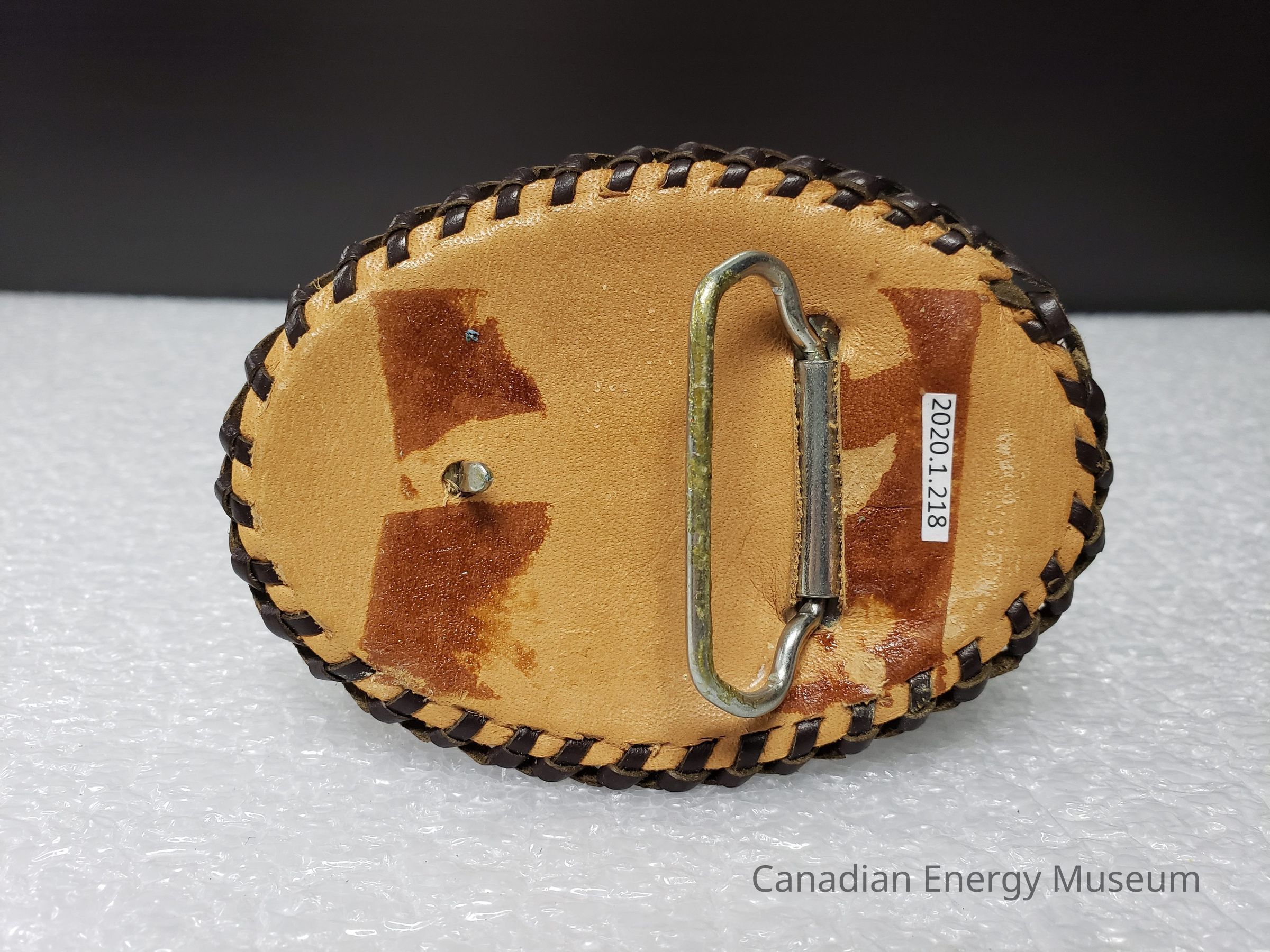 Features: An oval belt buckle made from metal with a custom leather covering. The buckle is concave in shape.