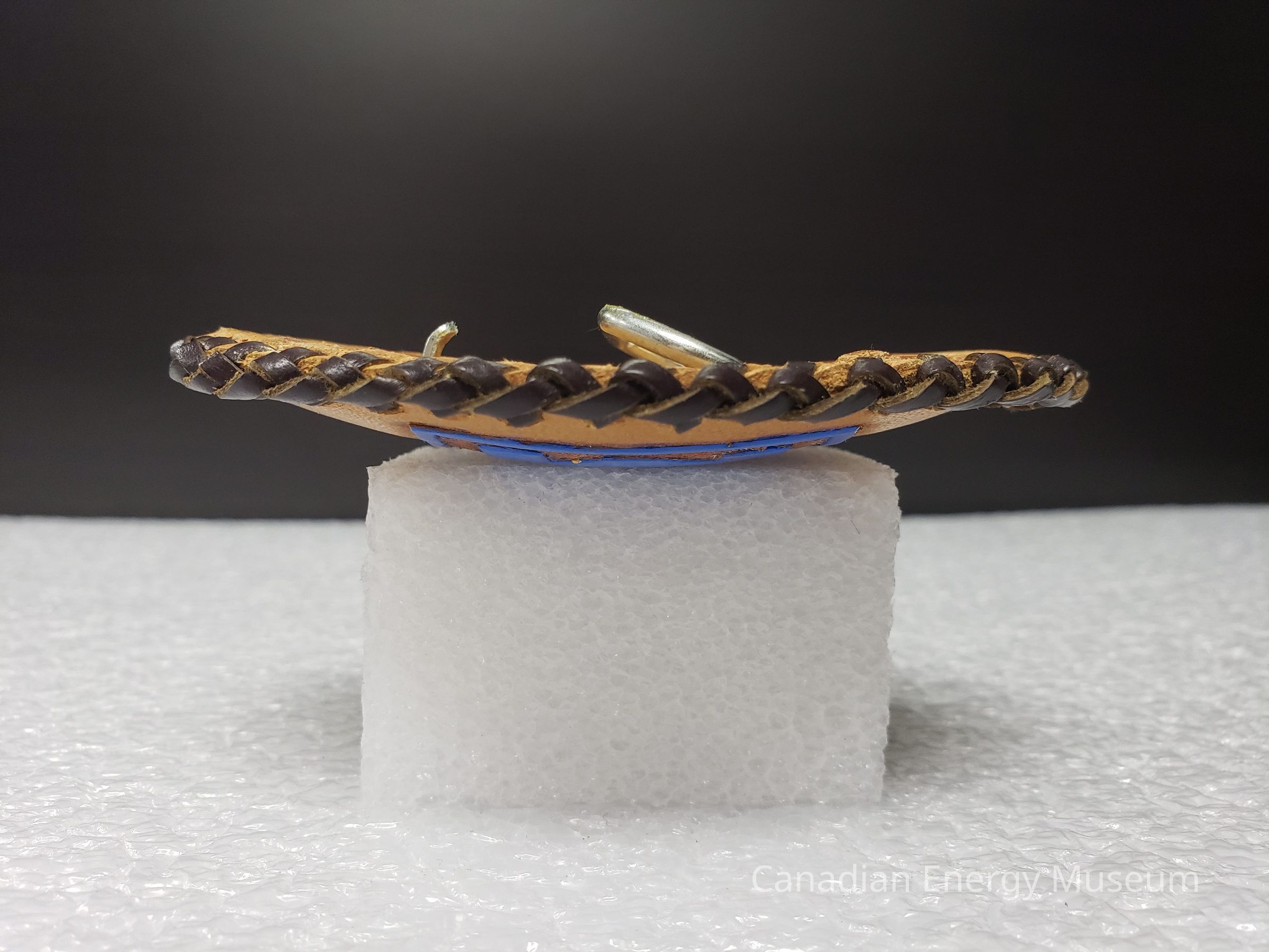 Old Description: (Kelsey Dalrymple, 3 June 2020) BMW Monarch. Leather oval belt buckle with red and blue text.Collection