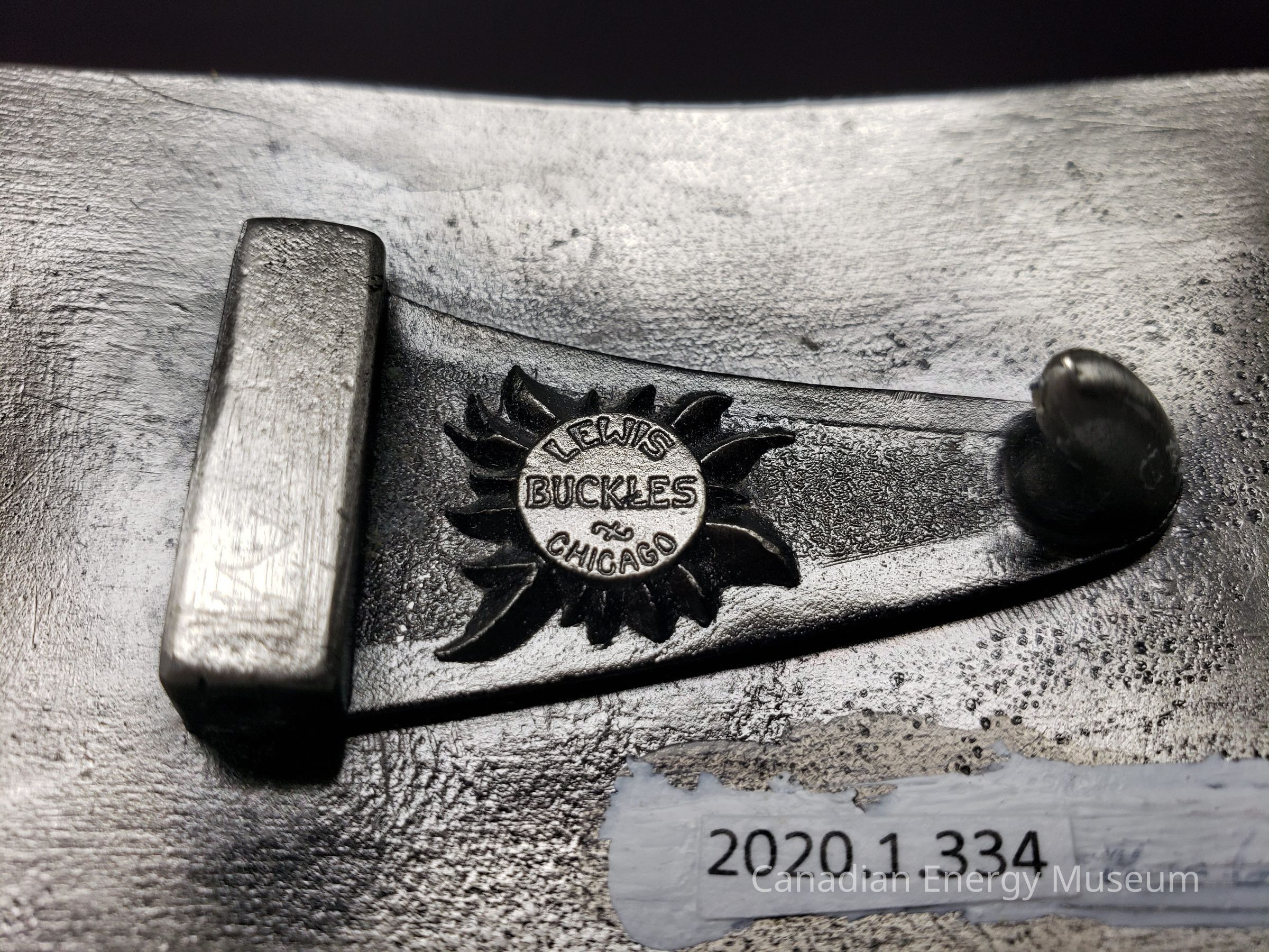 Back Elements: In the centre of the buckle is a raised triangle with curved hook on one point. At the other end of the triangle is a large rectangle block where the hinge used to be attached. In the centre of the triangle is a raised image of a sun. In the centre of the sun is small engraved text "LEWIS BUCKLES CHICAGO".