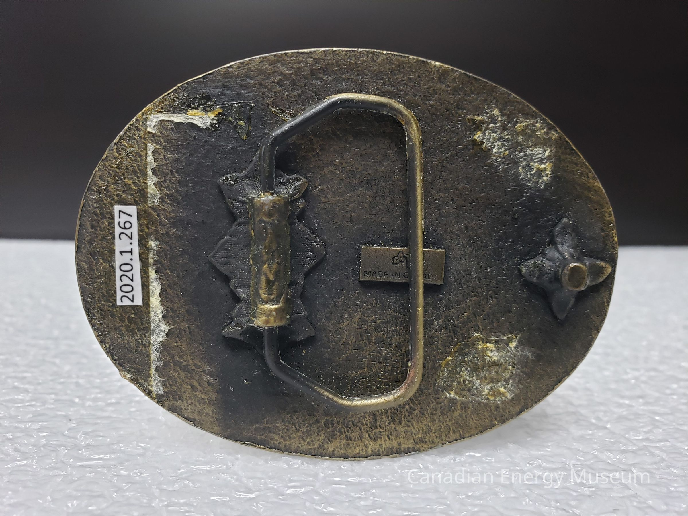 Old Description (Kelsey Dalrymple, 3 June 2020):Carey Welding. Brass oval belt buckle with truck in centre.Collection